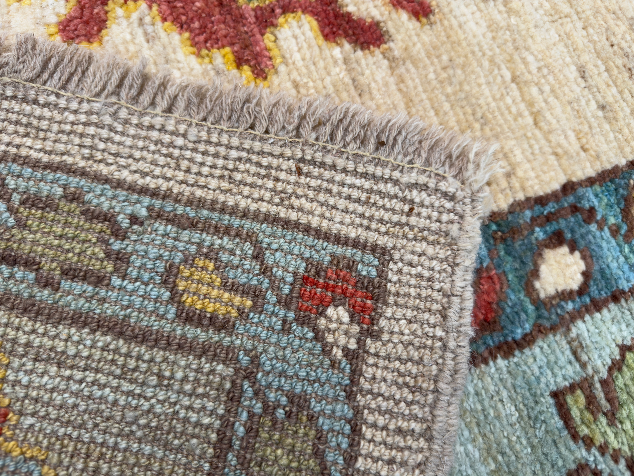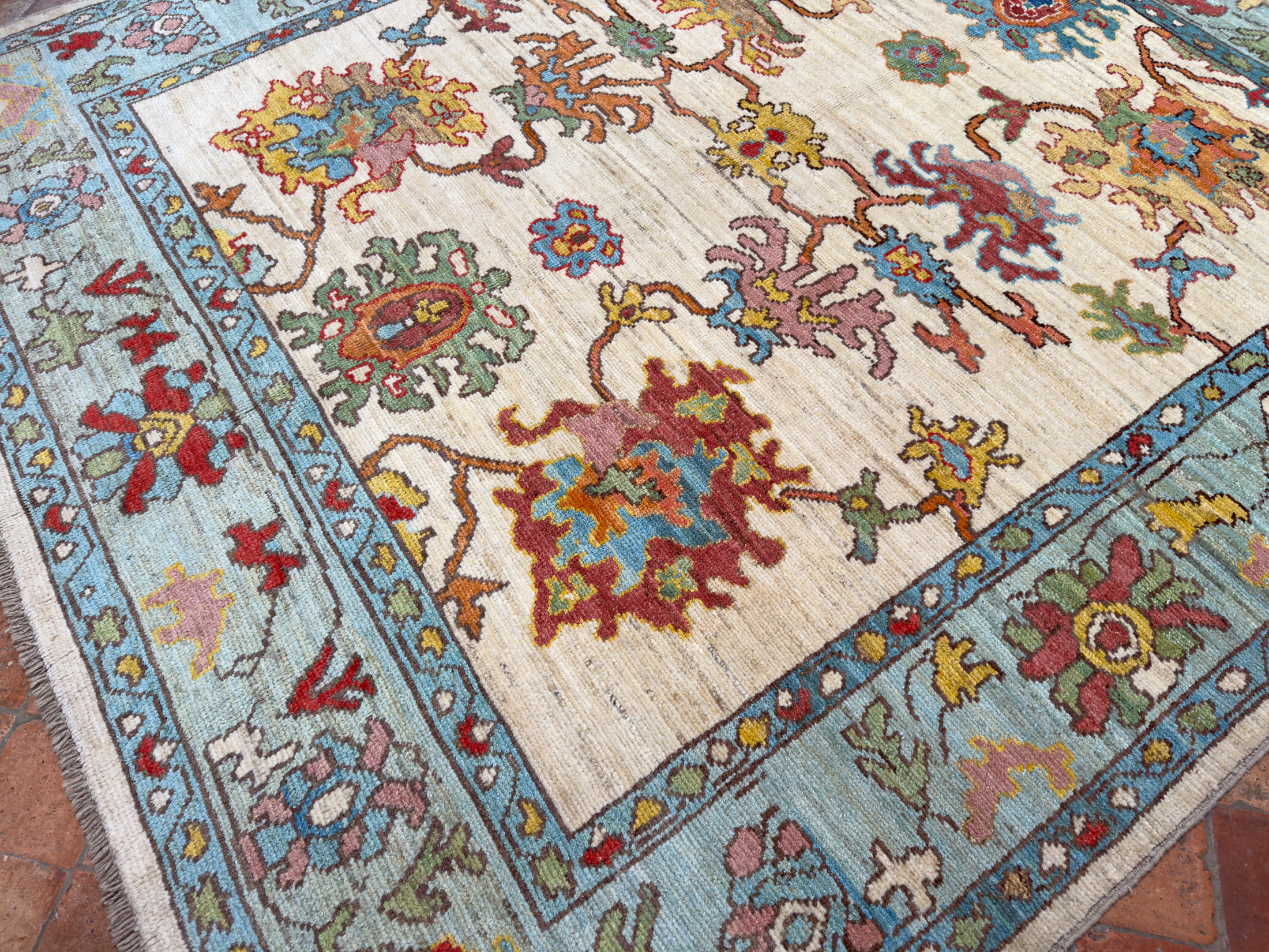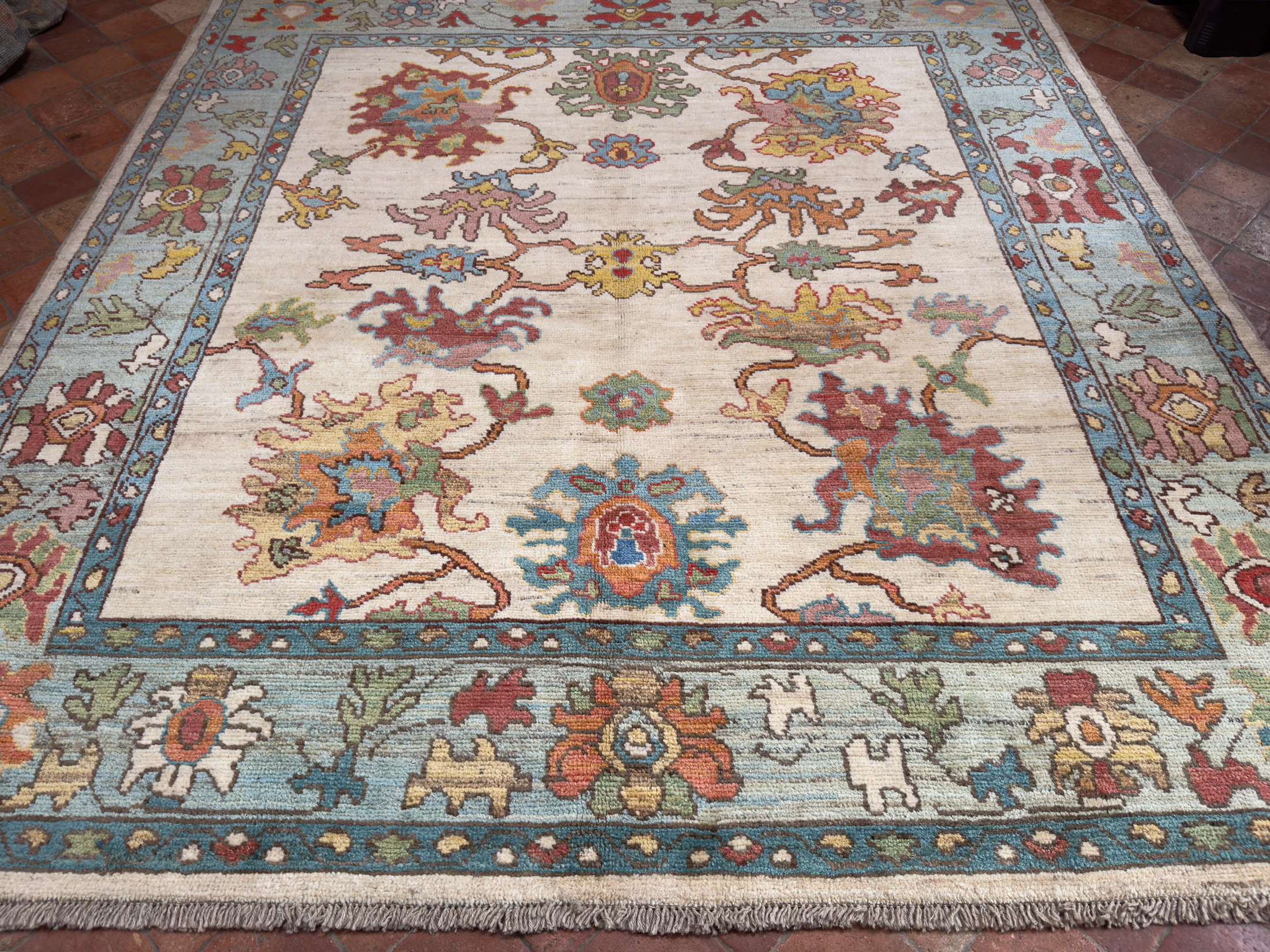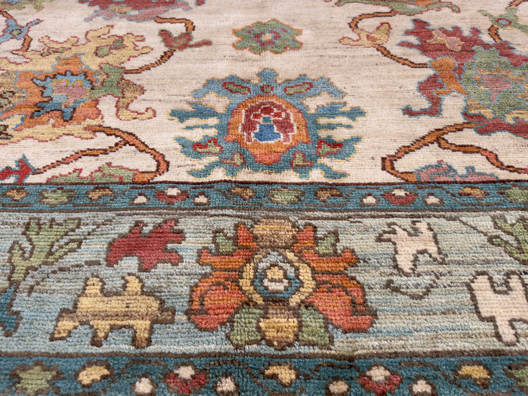 Using famous designs from antique Ushak carpets, with large scale palmettes and an open design, this is a contemporary Ushak carpet using light greens, soft reds and blues, all hand-woven using soft wool and natural dyes.
