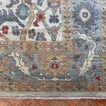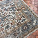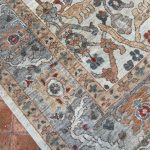 This contemporary carpet is woven with delicate colours, the dyes are faded yet have warmth, with an off-white background, lovely blues, sage green tones, burnt oranges, dusky pinks, the best light blues, gold hues, and hints of warmer reds, there are so many colours to work in an existing scheme or to build a room around this carpet.  It would be a lot of fun choosing fabrics to work with this wonderful carpet.