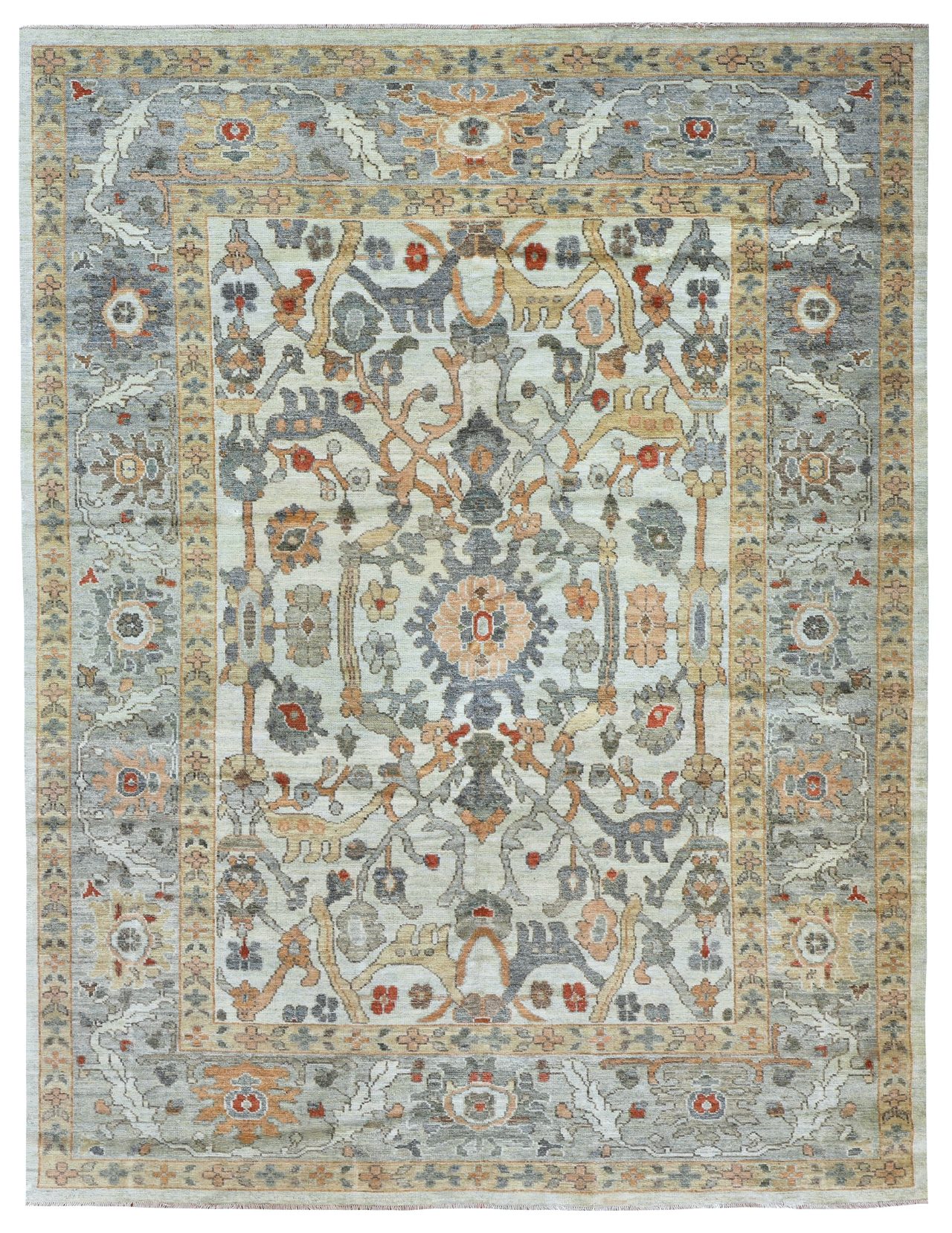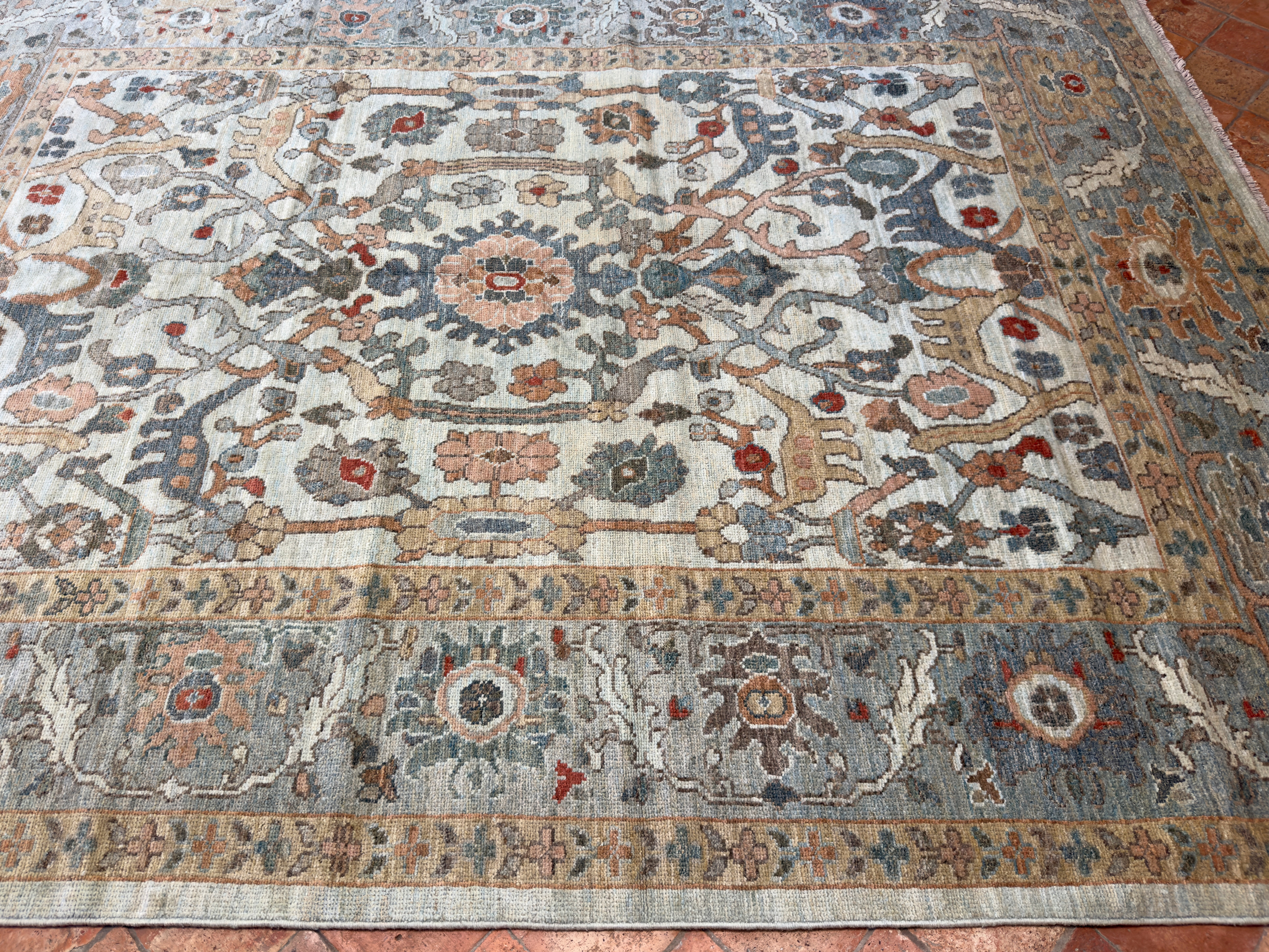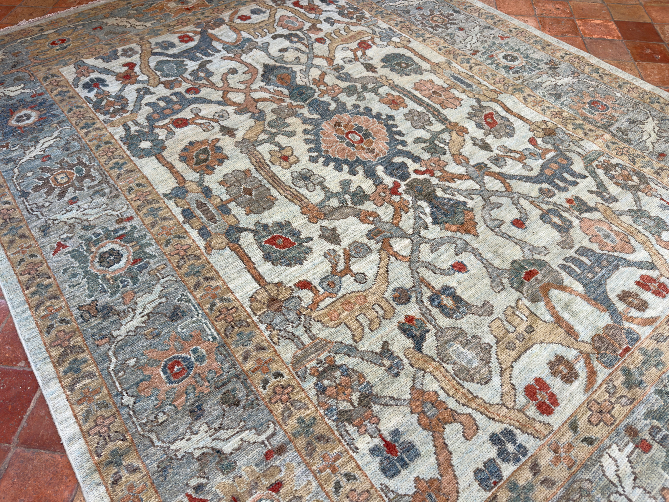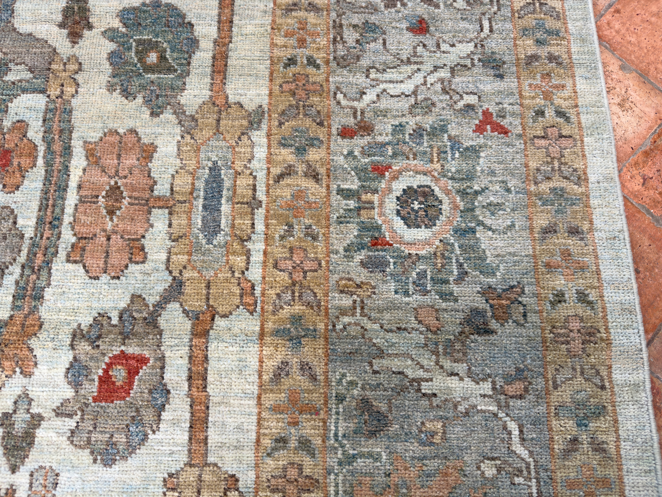 A lovely muted contemporary carpet using natural dyes and soft wool, hand-woven by the best weavers, the design is taken from an antique Sultanabad pattern.  The flowing leaf and palmette border is truly wonderful.  A beautiful modern carpet to enhance any room.