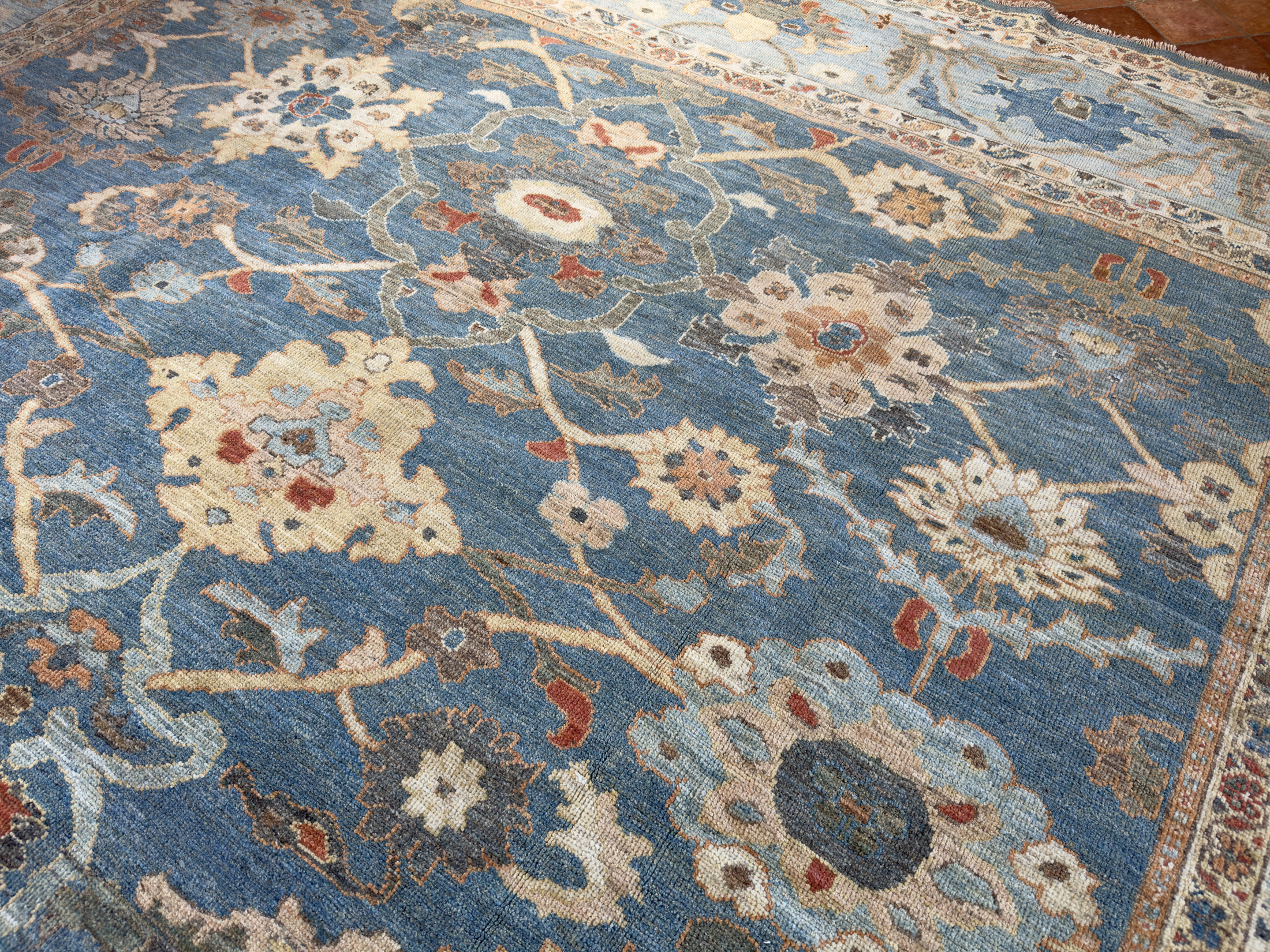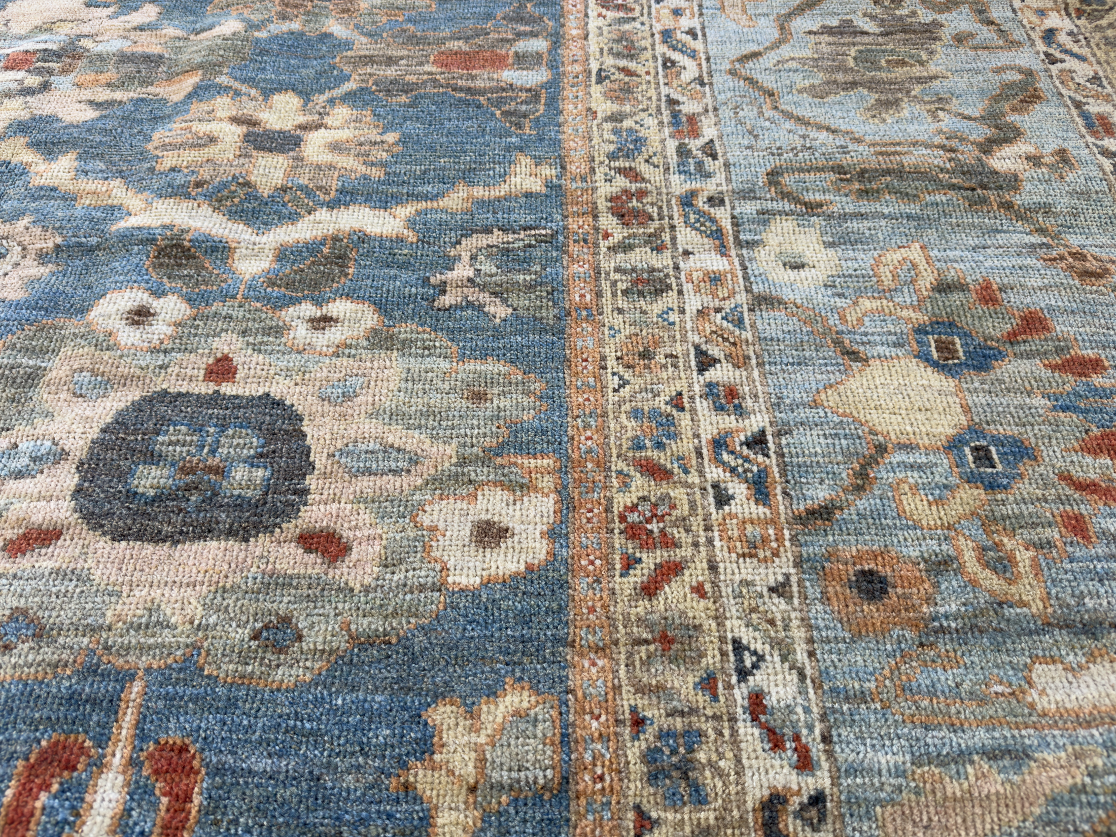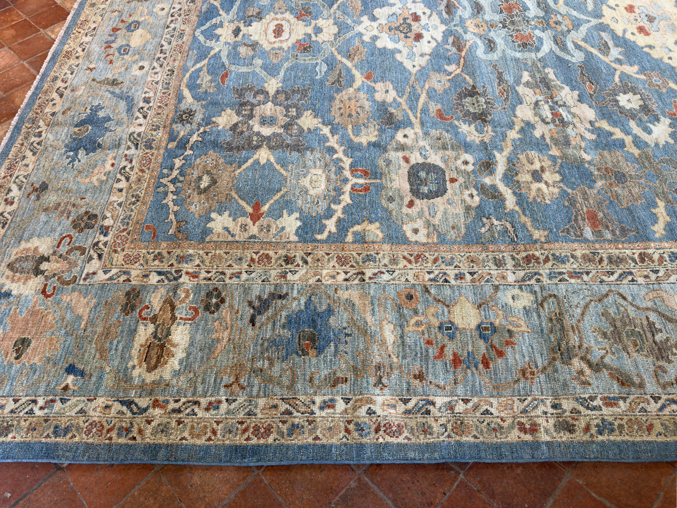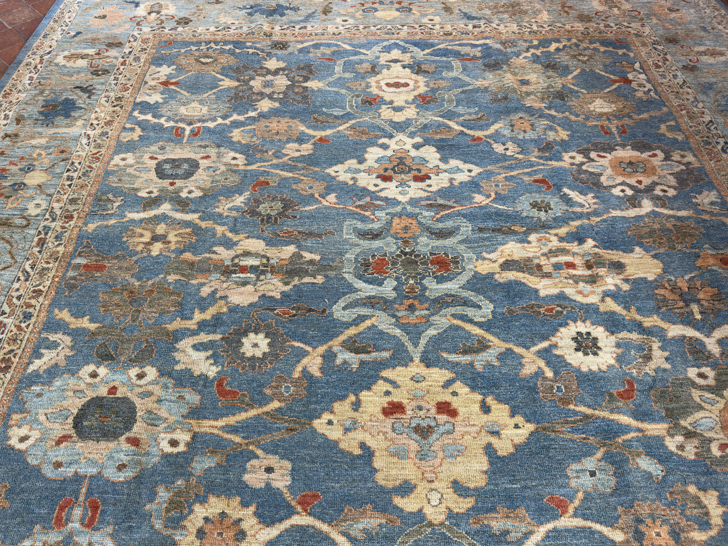 A stunning large scale contemporary Sultanabad carpet, with amazing colours, hand-woven all with natural wool and dyes. A lovely variety of indigo blues, soft gold tones, grey tones, and orange and red dyes. Soft pinks too, along with sage greens, a great palette of natural dyes, all hand-woven with excellent soft wool.