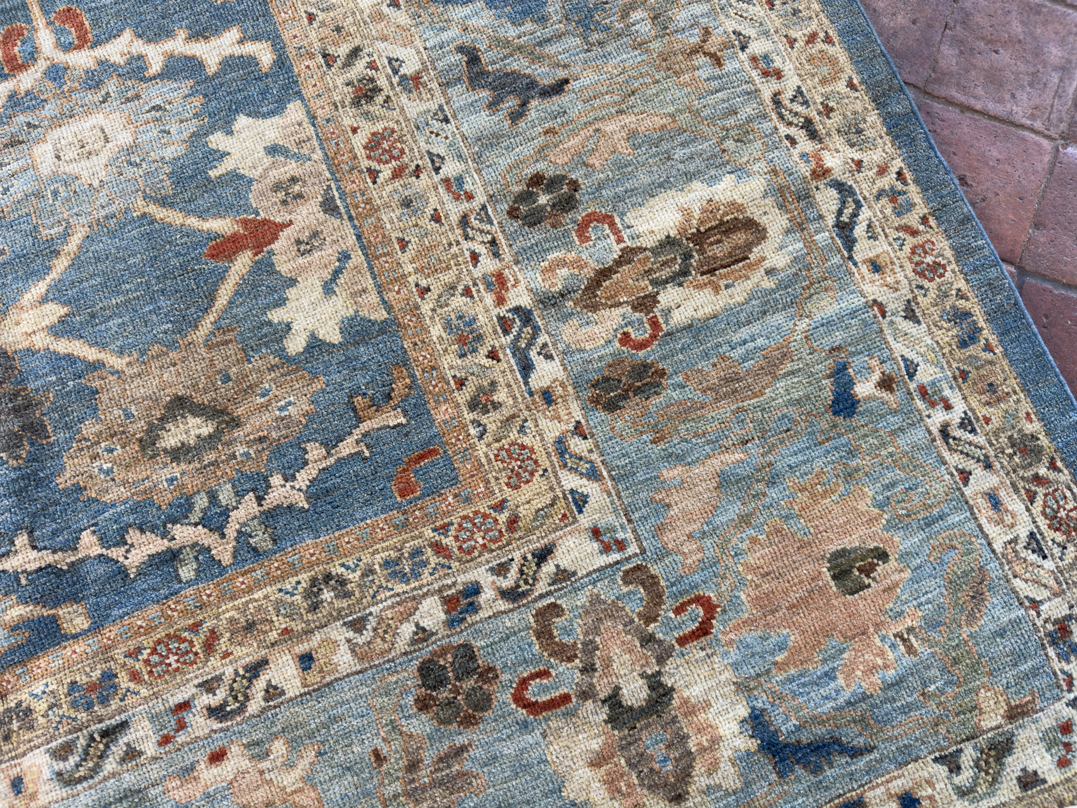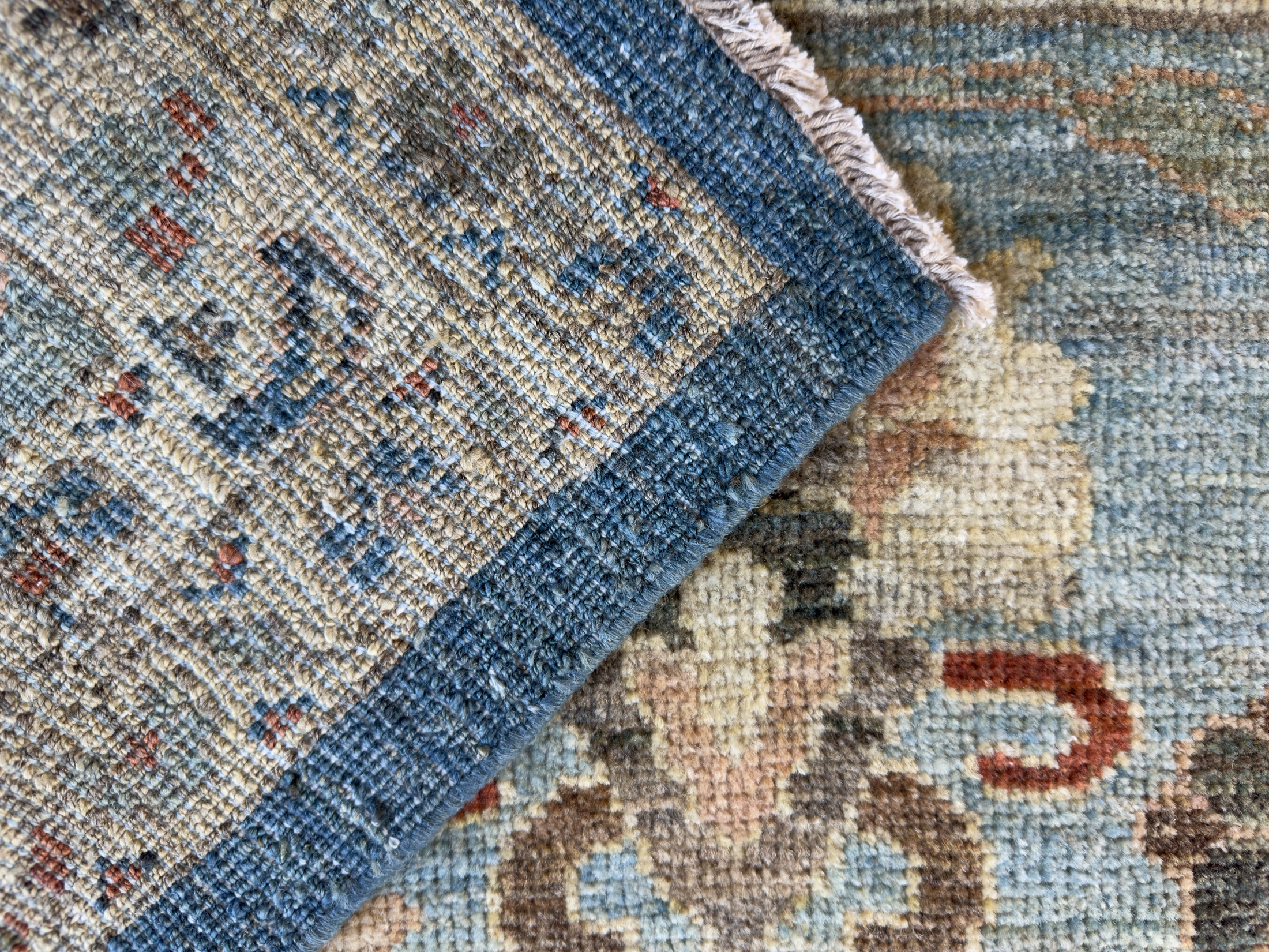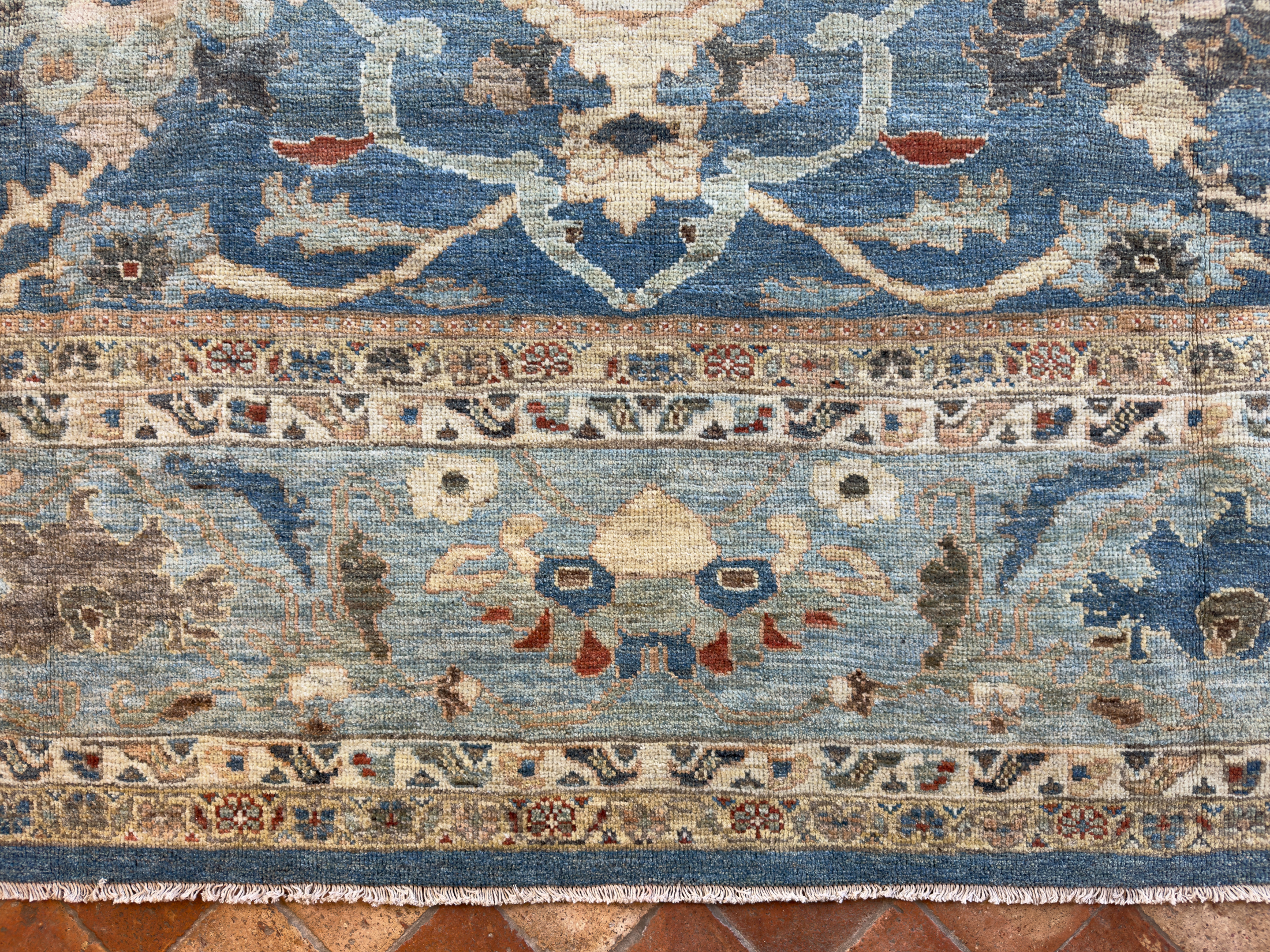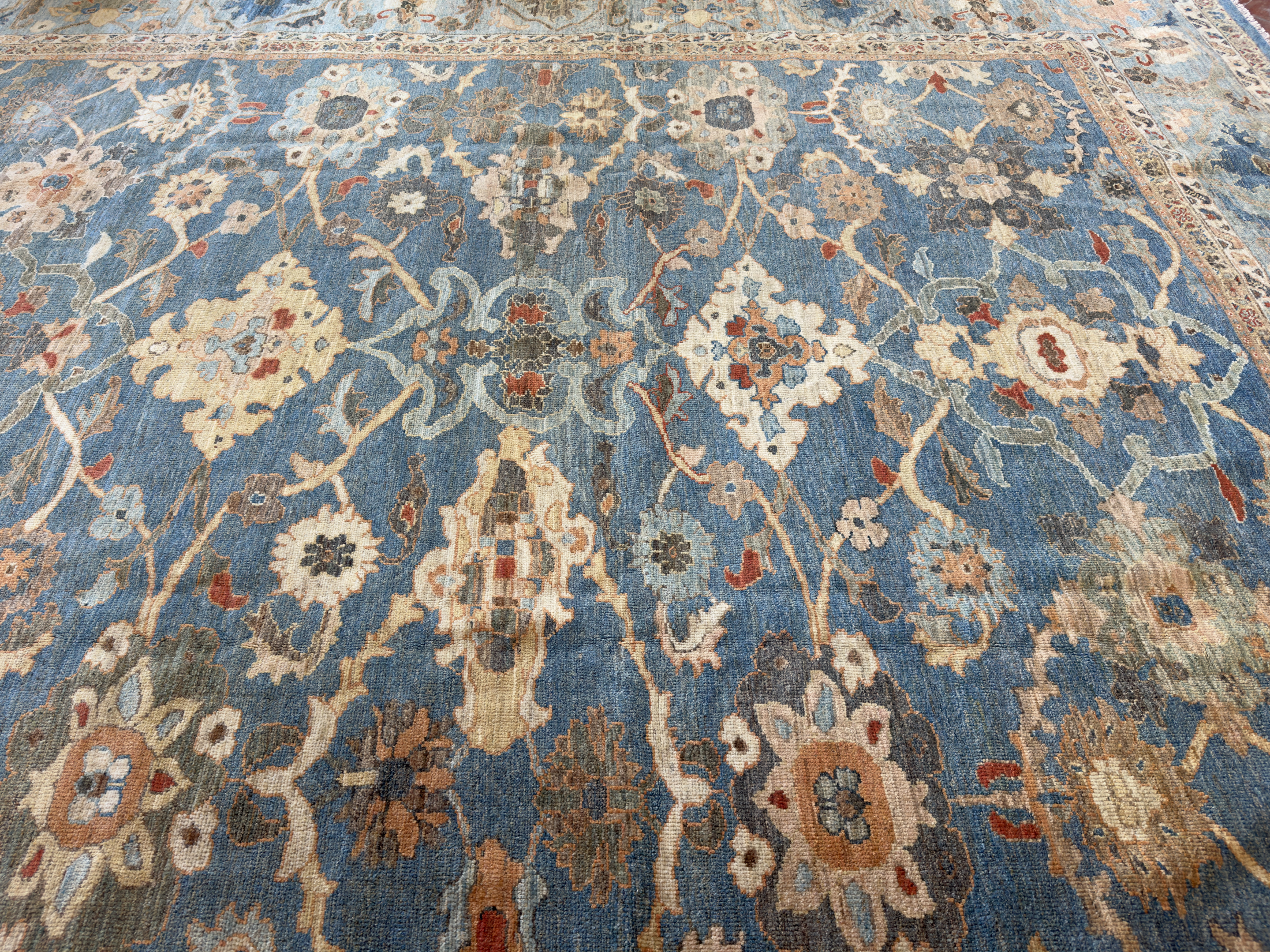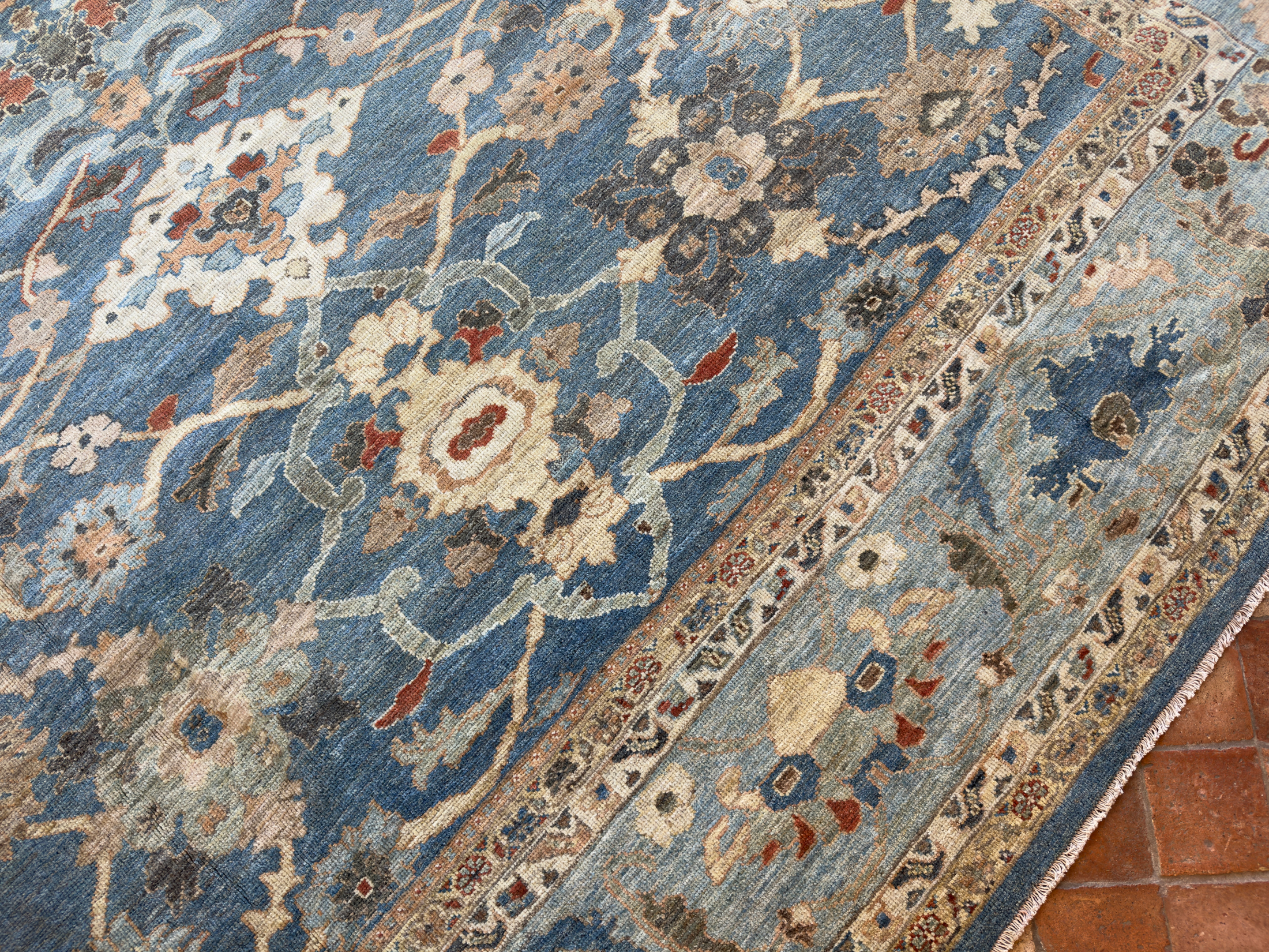 A stunning large scale contemporary Sultanabad carpet, with amazing colours, hand-woven all with natural wool and dyes. A lovely variety of indigo blues, soft gold tones, grey tones, and orange and red dyes. Soft pinks too, along with sage greens, a great palette of natural dyes, all hand-woven with excellent soft wool.