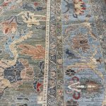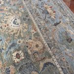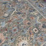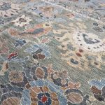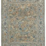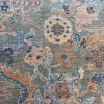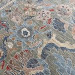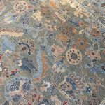 Woven with exquisite colours and a rare green background, this is one of the most expensive dyes to make, still today.  Soft gold tones, pale blues, grey tones, and faded pinks and hints of warmer red dyes.   We have a large collection of beautiful contemporary carpets and rugs alongside our antique carpet and rug collection.