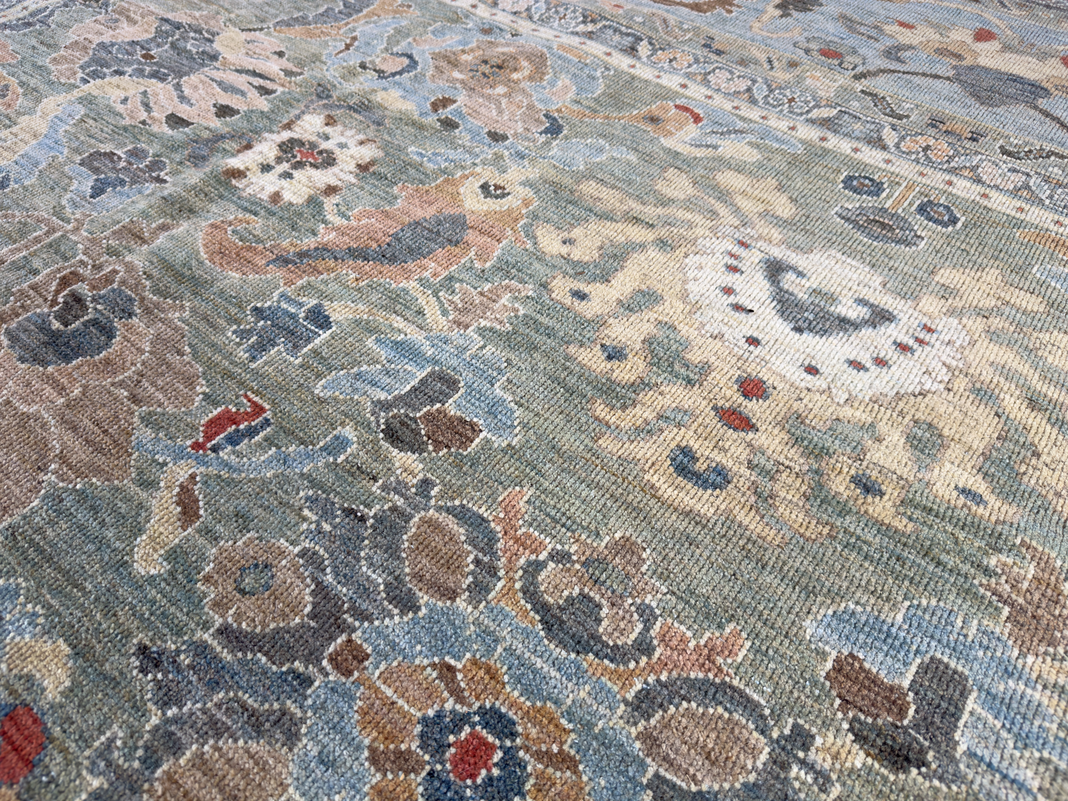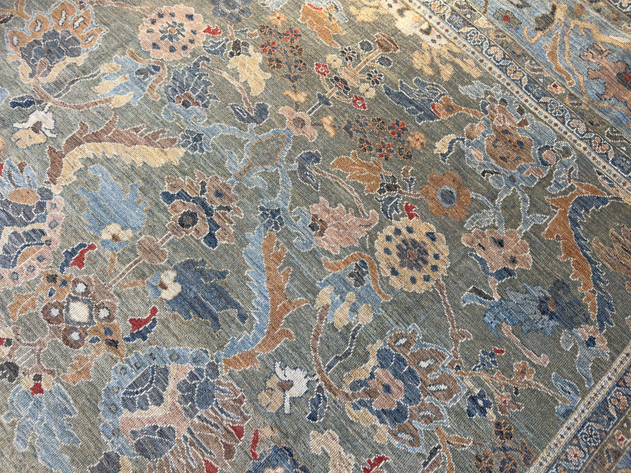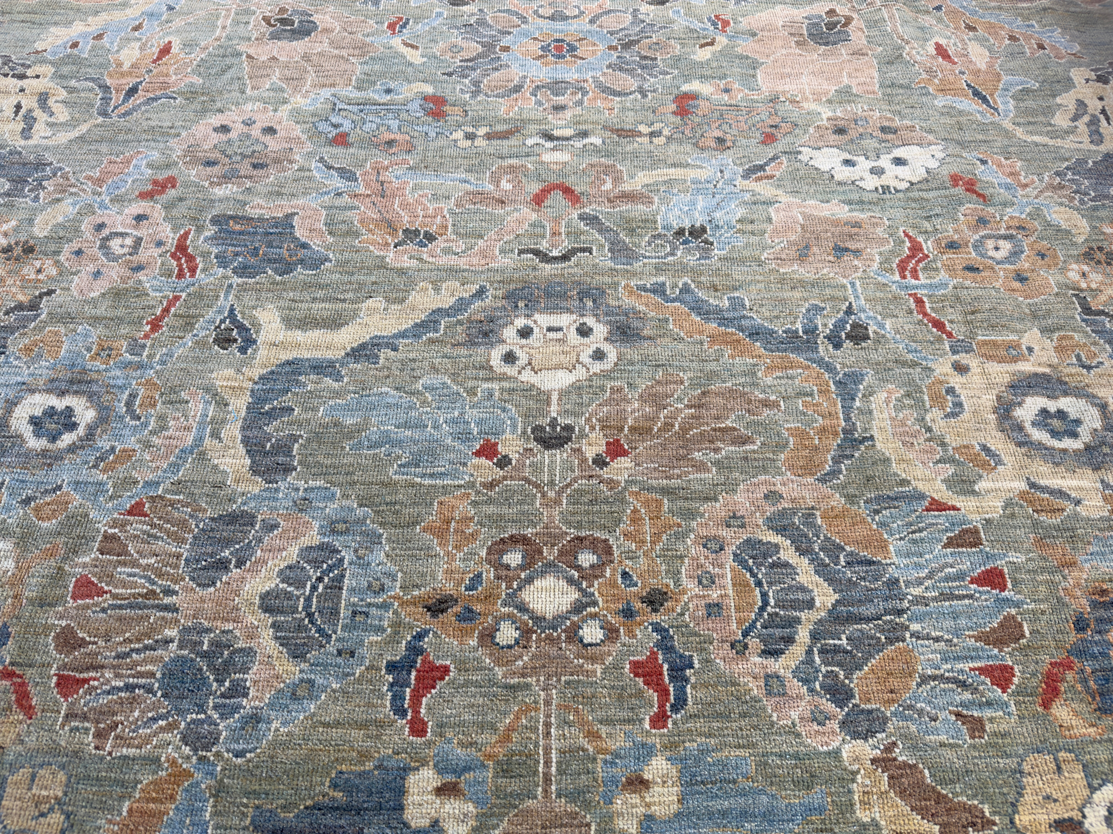 An oversize contemporary carpet using a wonderful large scale palmette floral pattern, this amazing design is taken from an antique Ziegler carpet.  These Sultanabad carpets are all hand-woven with the best hand-spun wool and natural dyes.  The pile height is cut low to medium high, making them look more like an antique carpet and not brand new.  This means placing them in any room, they look like they have always lived there and timeless in their look.