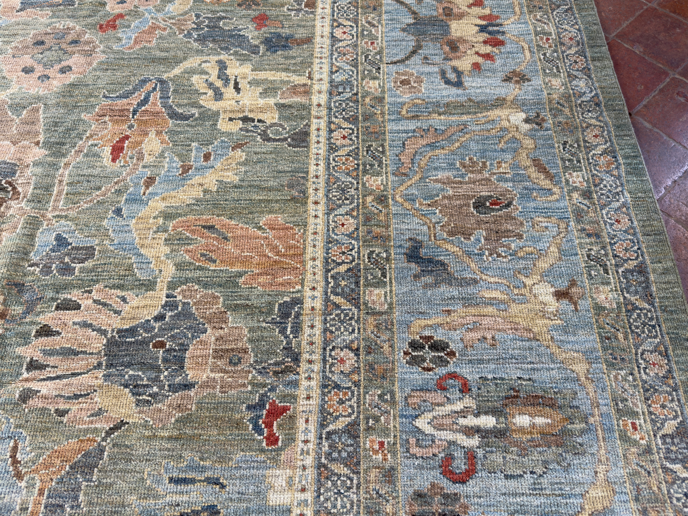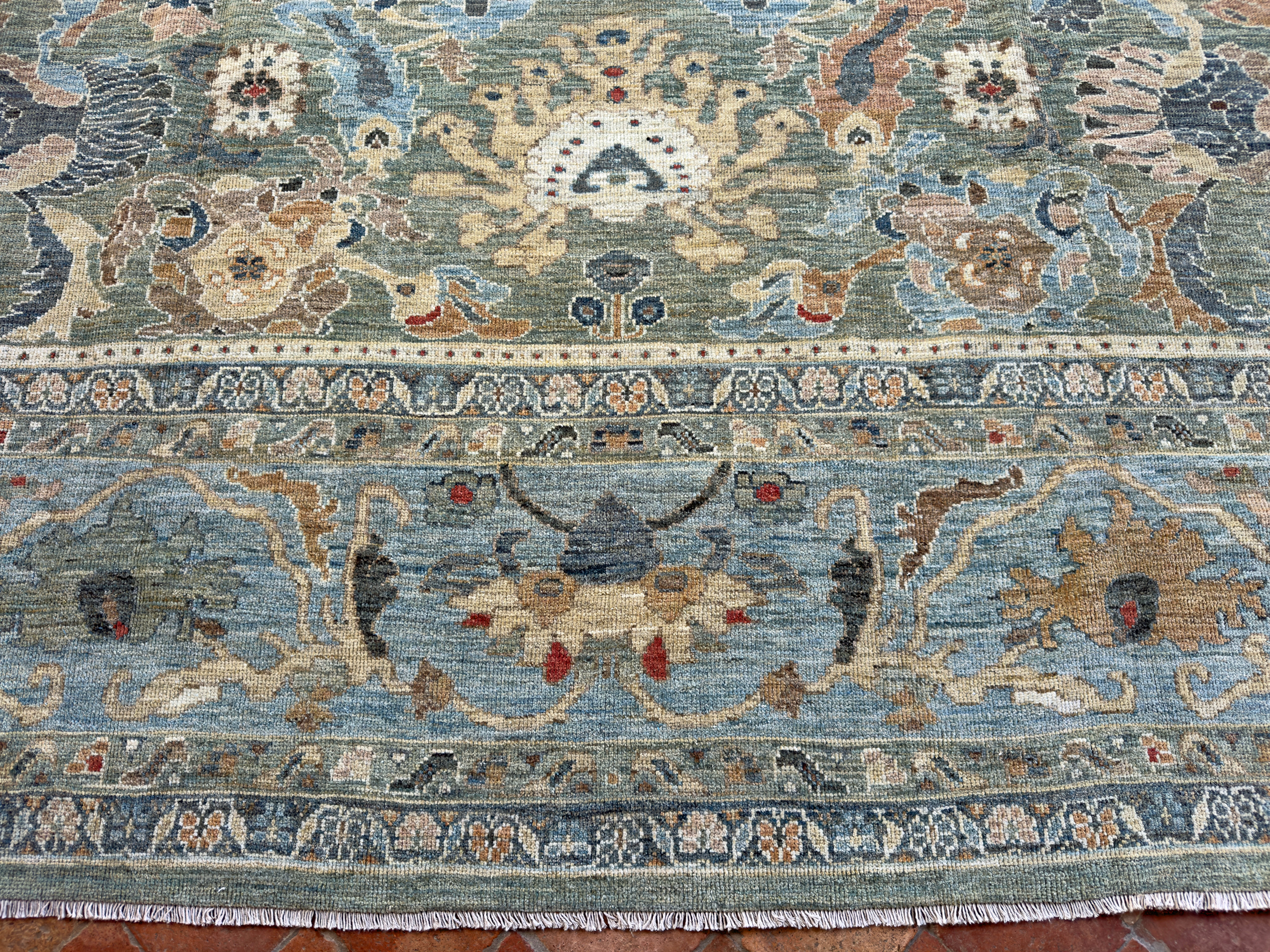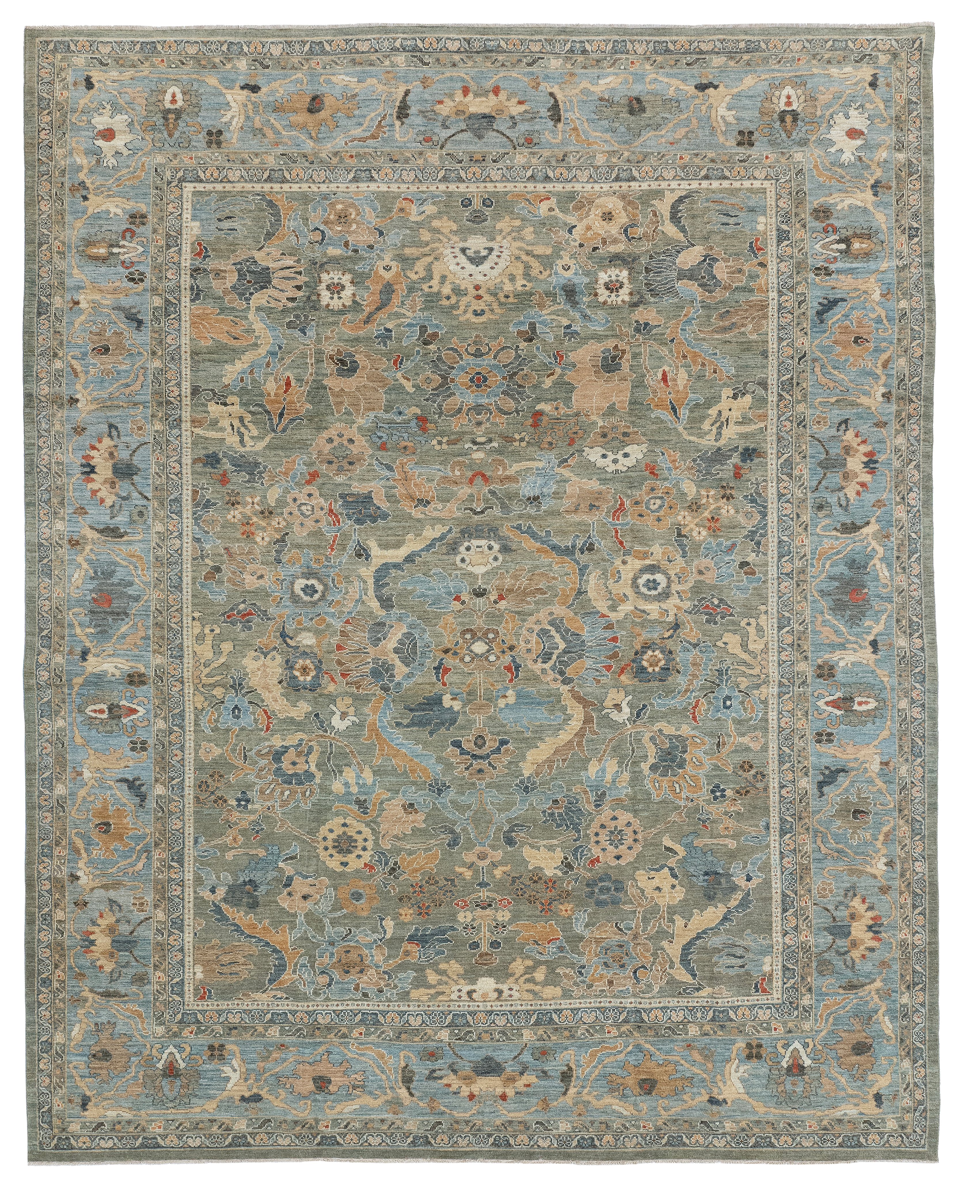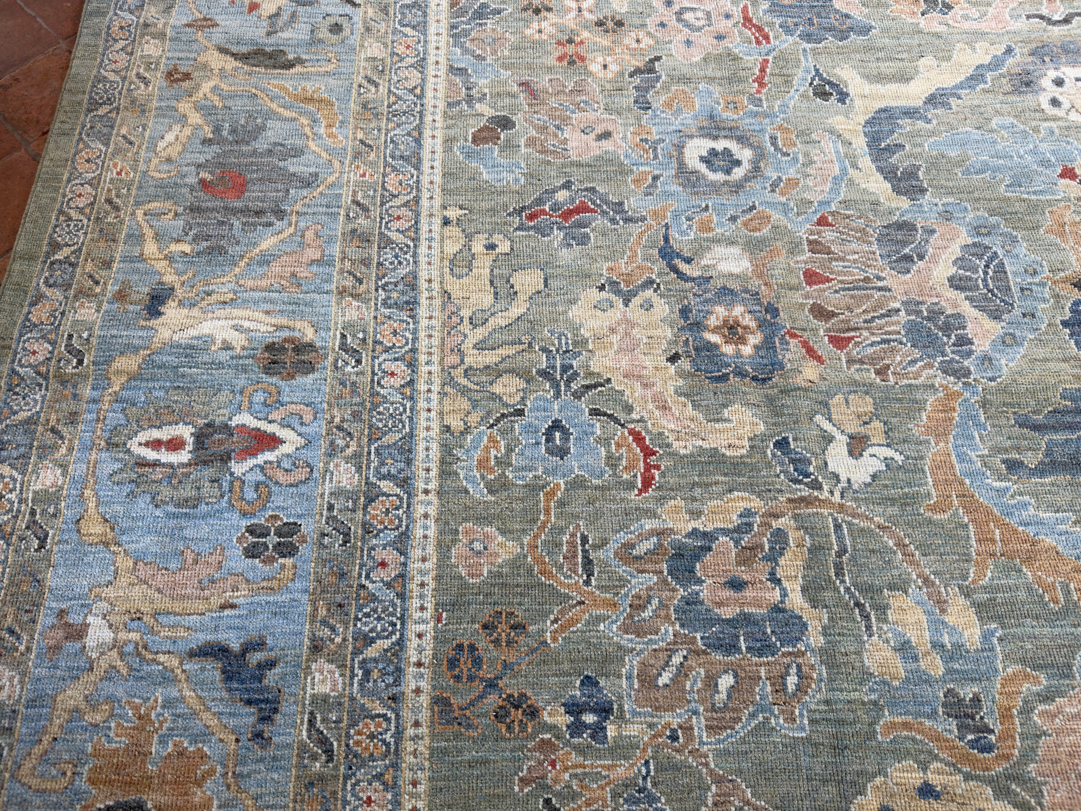 An oversize contemporary carpet using a wonderful large scale palmette floral pattern, this amazing design is taken from an antique Ziegler carpet.  These Sultanabad carpets are all hand-woven with the best hand-spun wool and natural dyes.  The pile height is cut low to medium high, making them look more like an antique carpet and not brand new.  This means placing them in any room, they look like they have always lived there and timeless in their look.