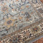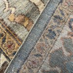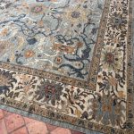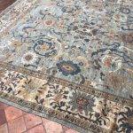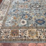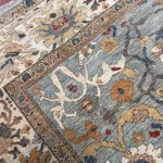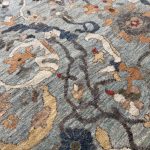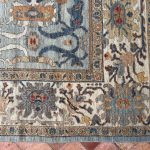 Faded natural dyes and an ancient scrolling vine design in the main field, this contemporary carpet is a wonderful looking piece. With an ivory off-white border, the main field colour is various pale blues and grey tones, this gives the carpet great depth and an antique look.