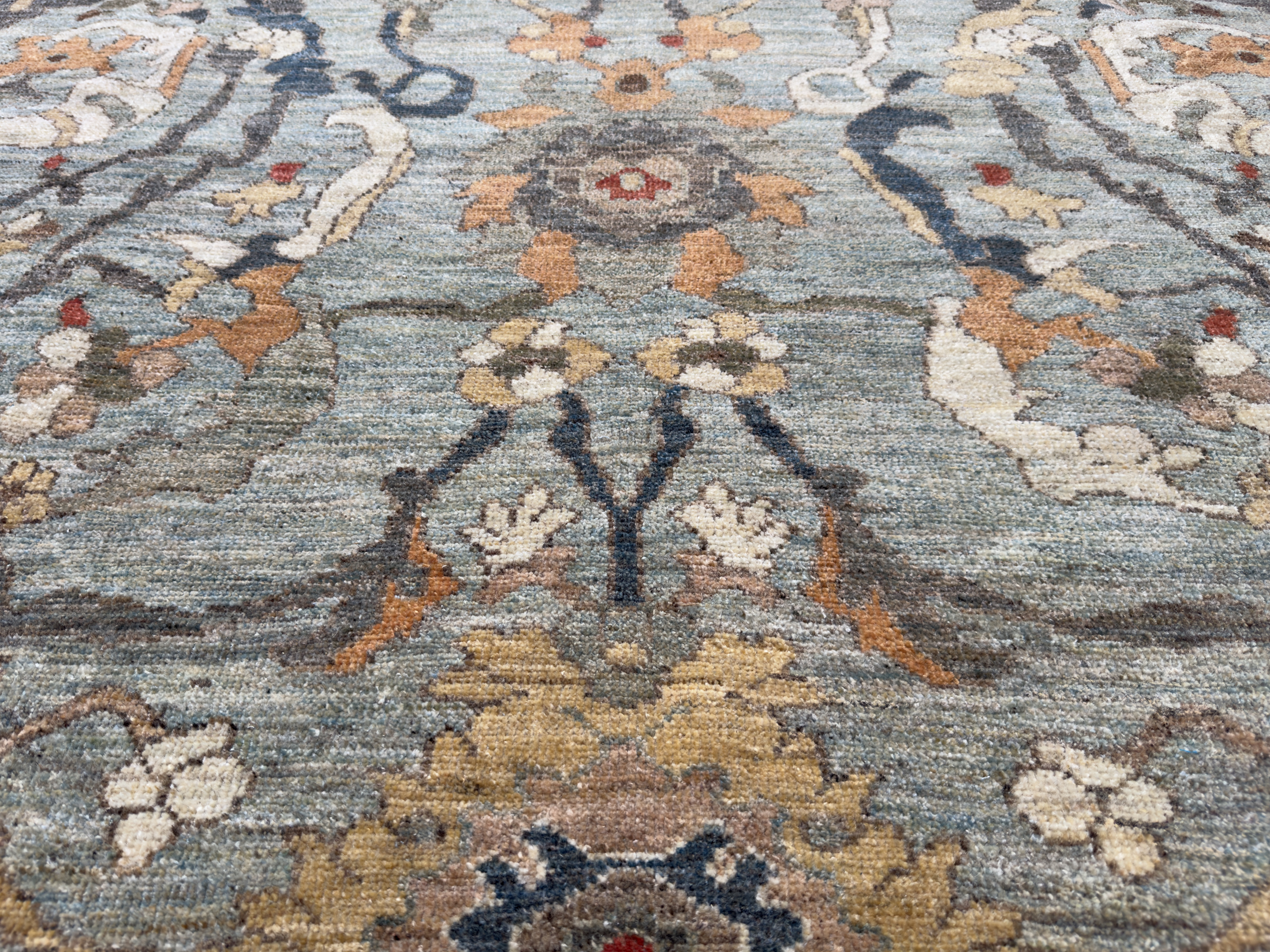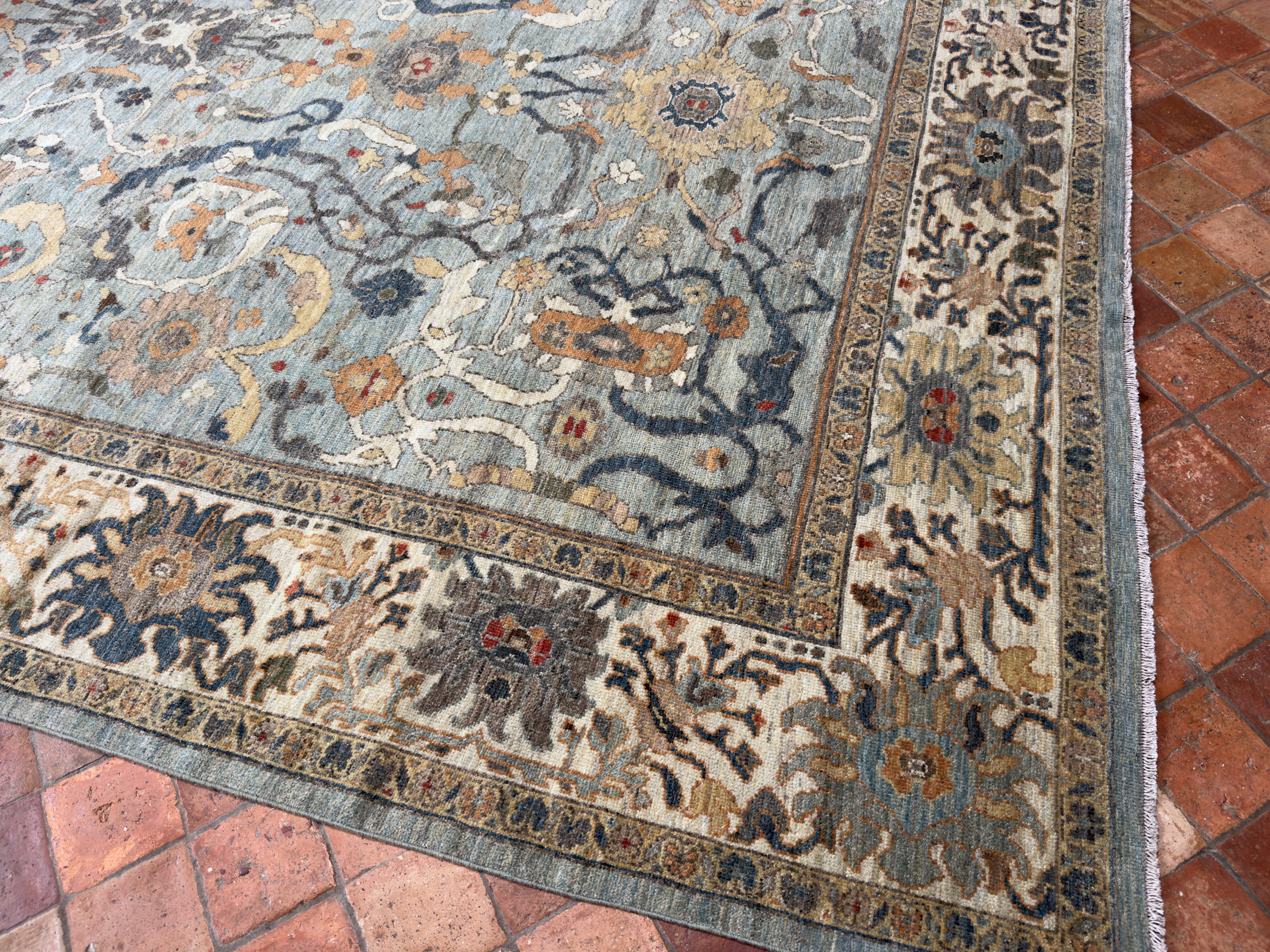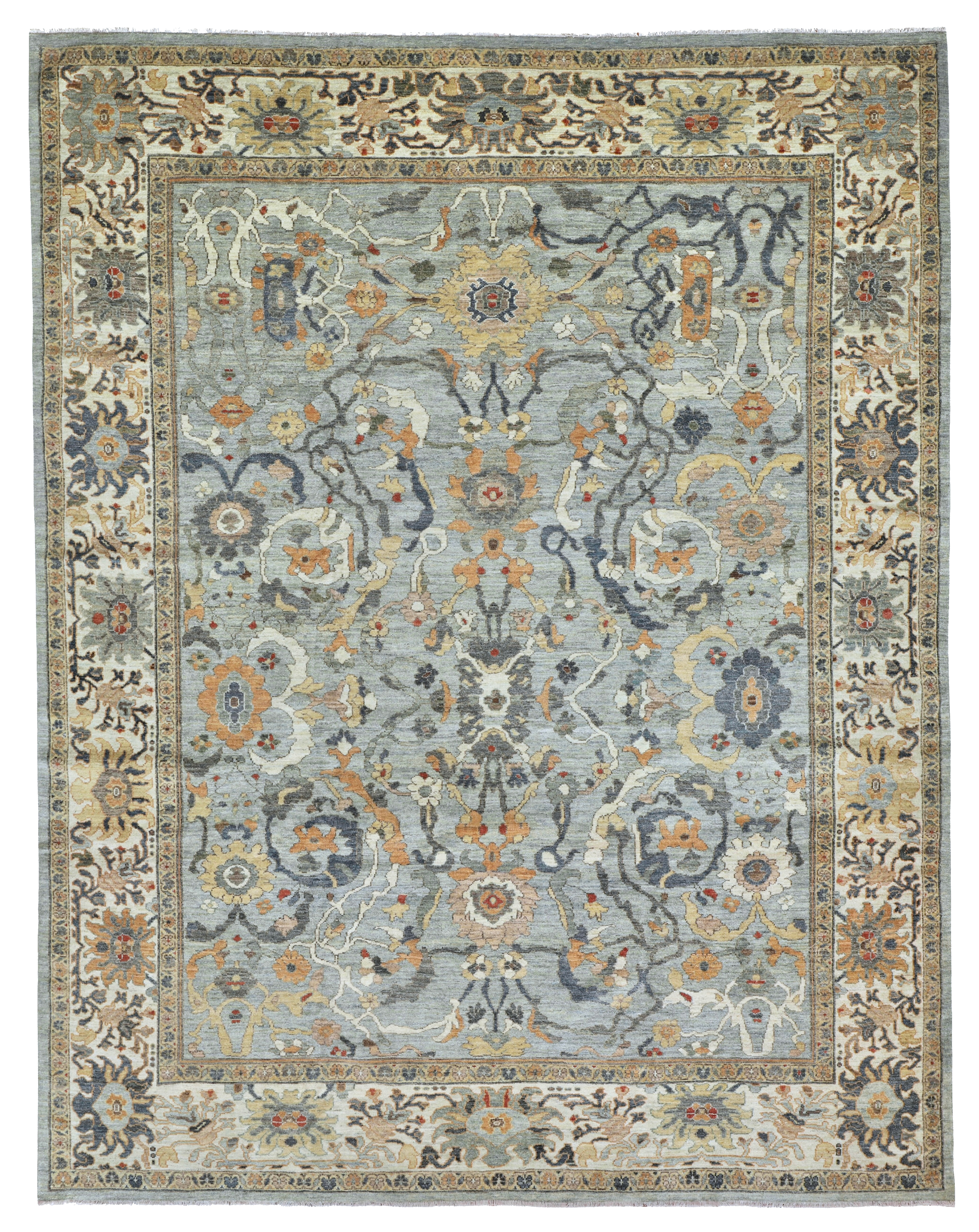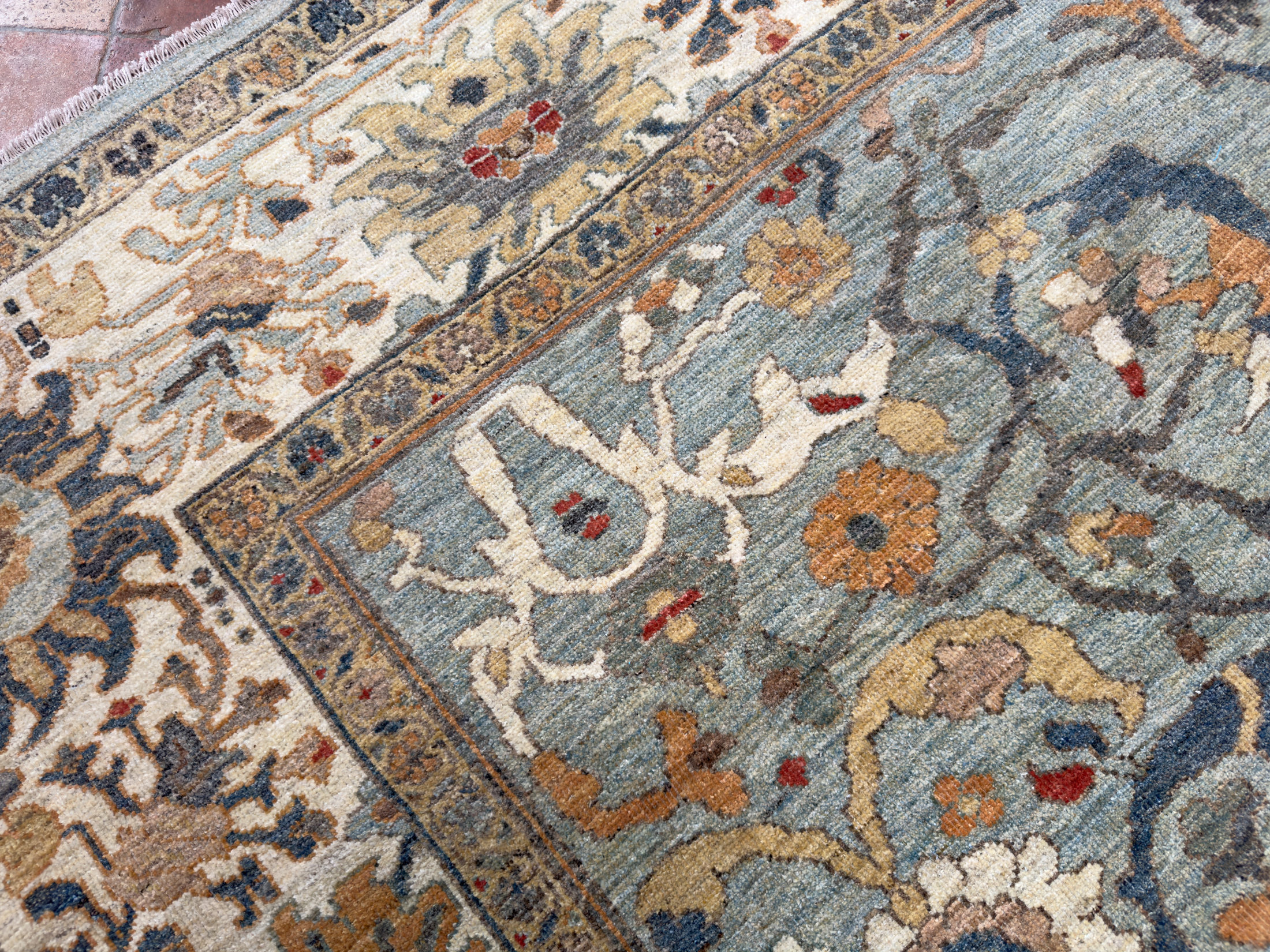 Faded natural dyes and an ancient scrolling vine design in the main field, this contemporary carpet is a wonderful looking piece. With an ivory off-white border, the main field colour is various pale blues and grey tones, this gives the carpet great depth and an antique look.