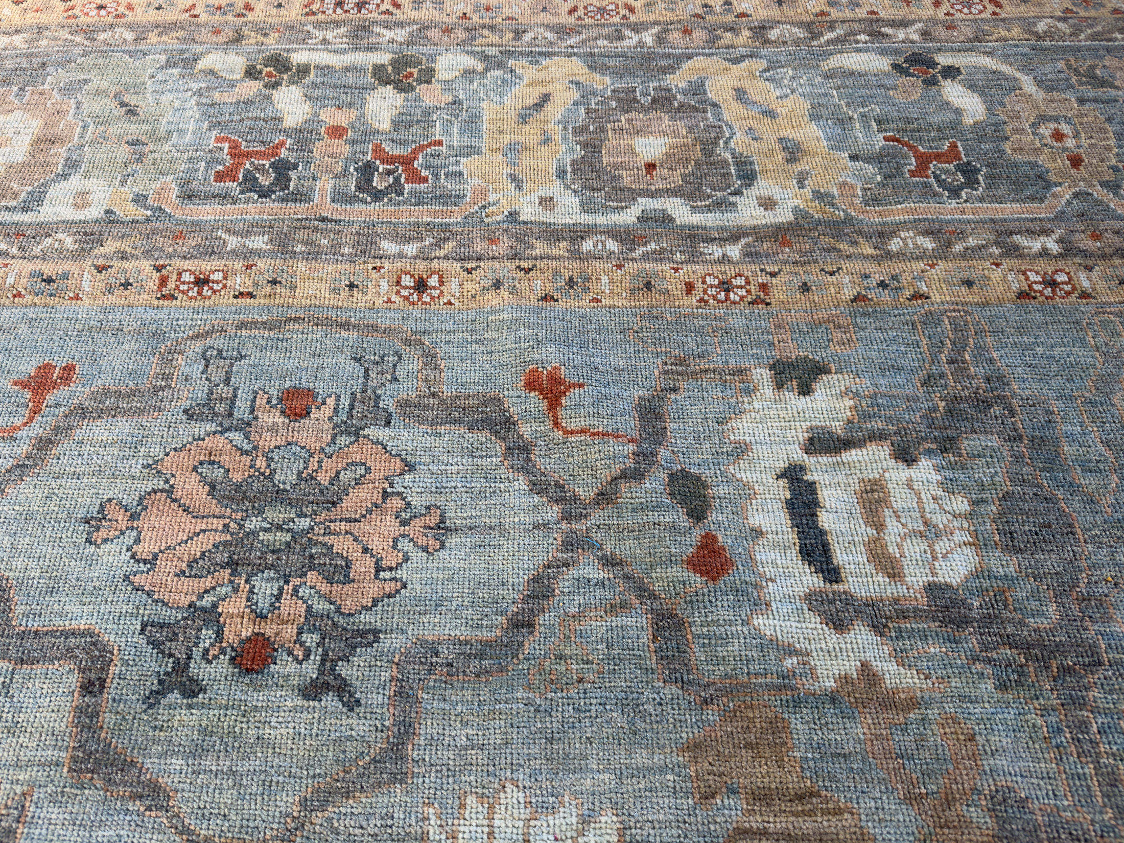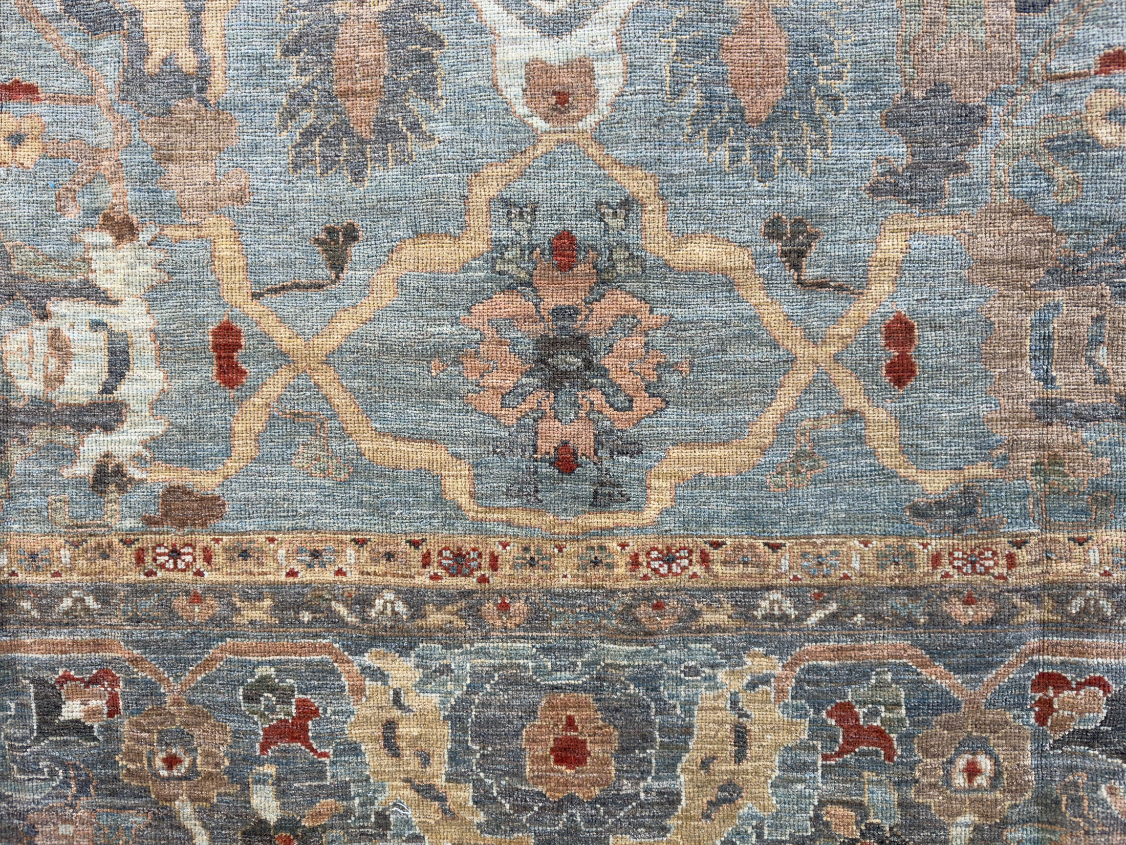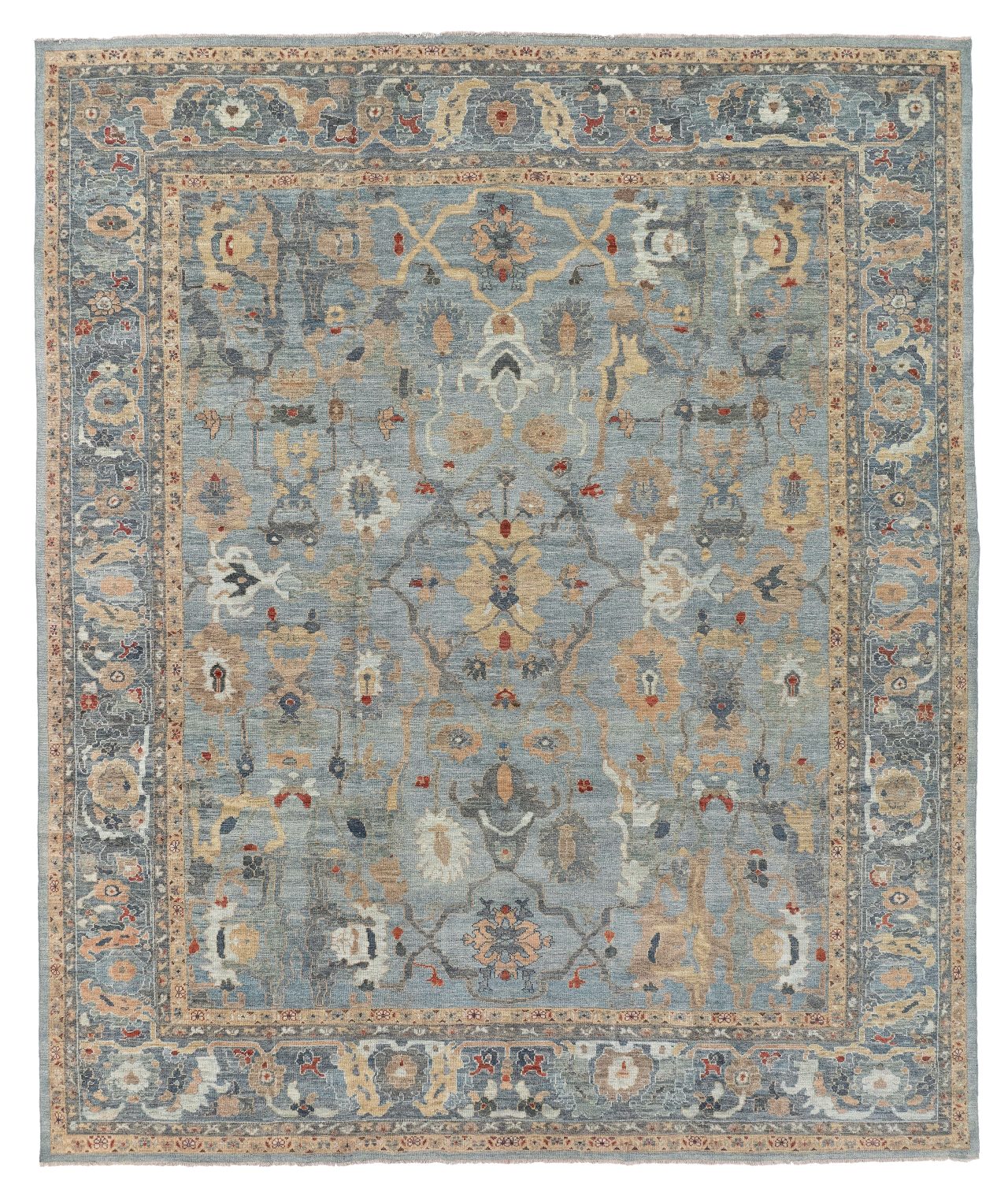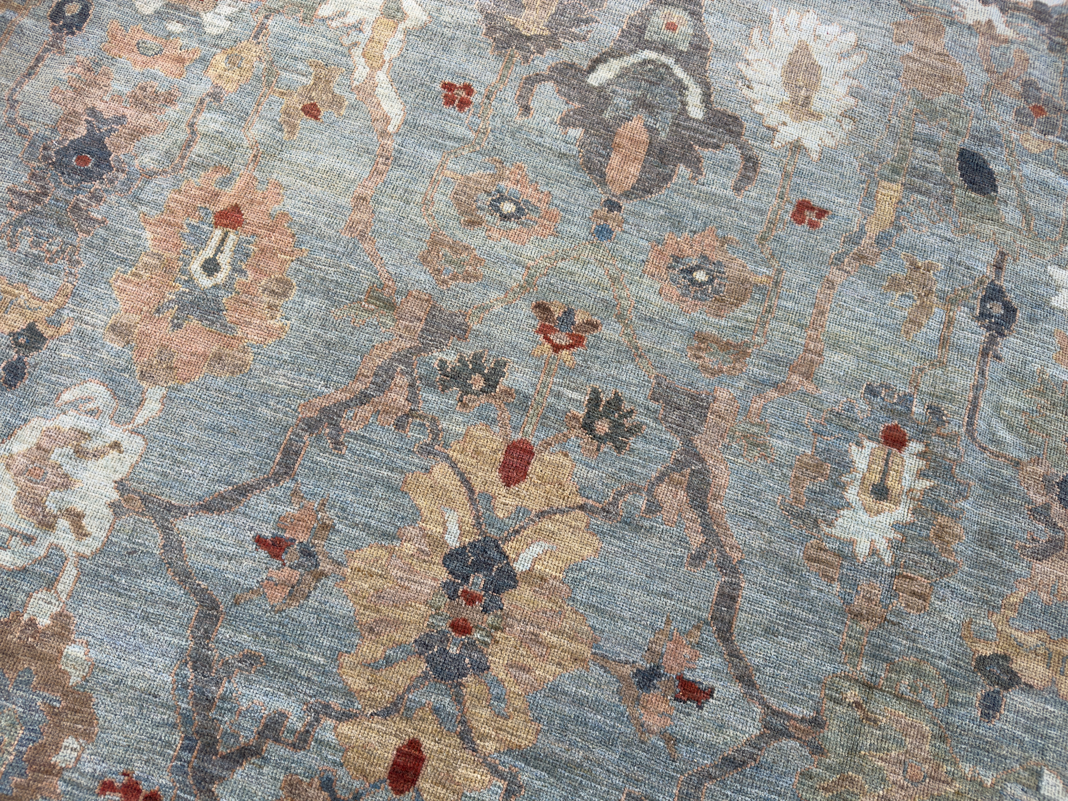 A majestic contemporary carpet using an antique Sultanabad design. These Sultanabad carpets are all hand-woven with the best hand-spun wool and natural dyes. The pile height is cut low to medium high, making them look more like an antique carpet and not brand new. This means placing them in any room, they look like they have always lived there and timeless in their look.