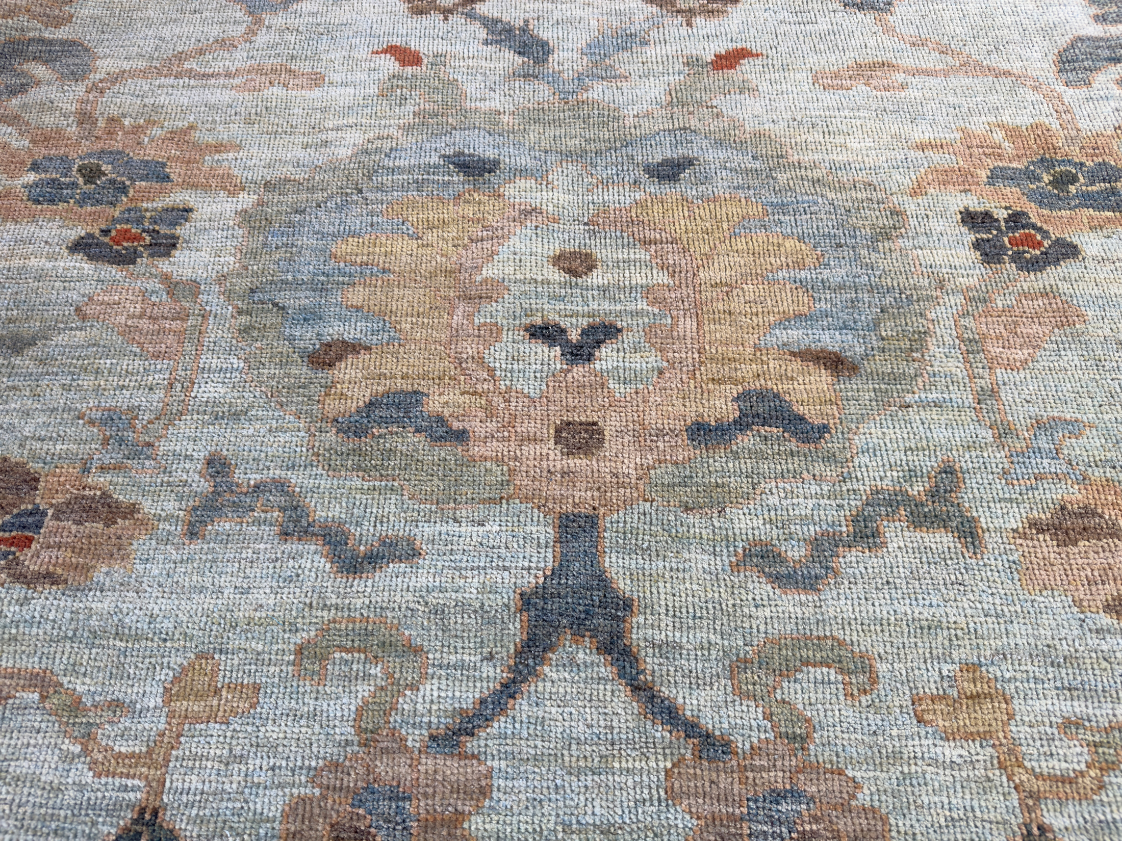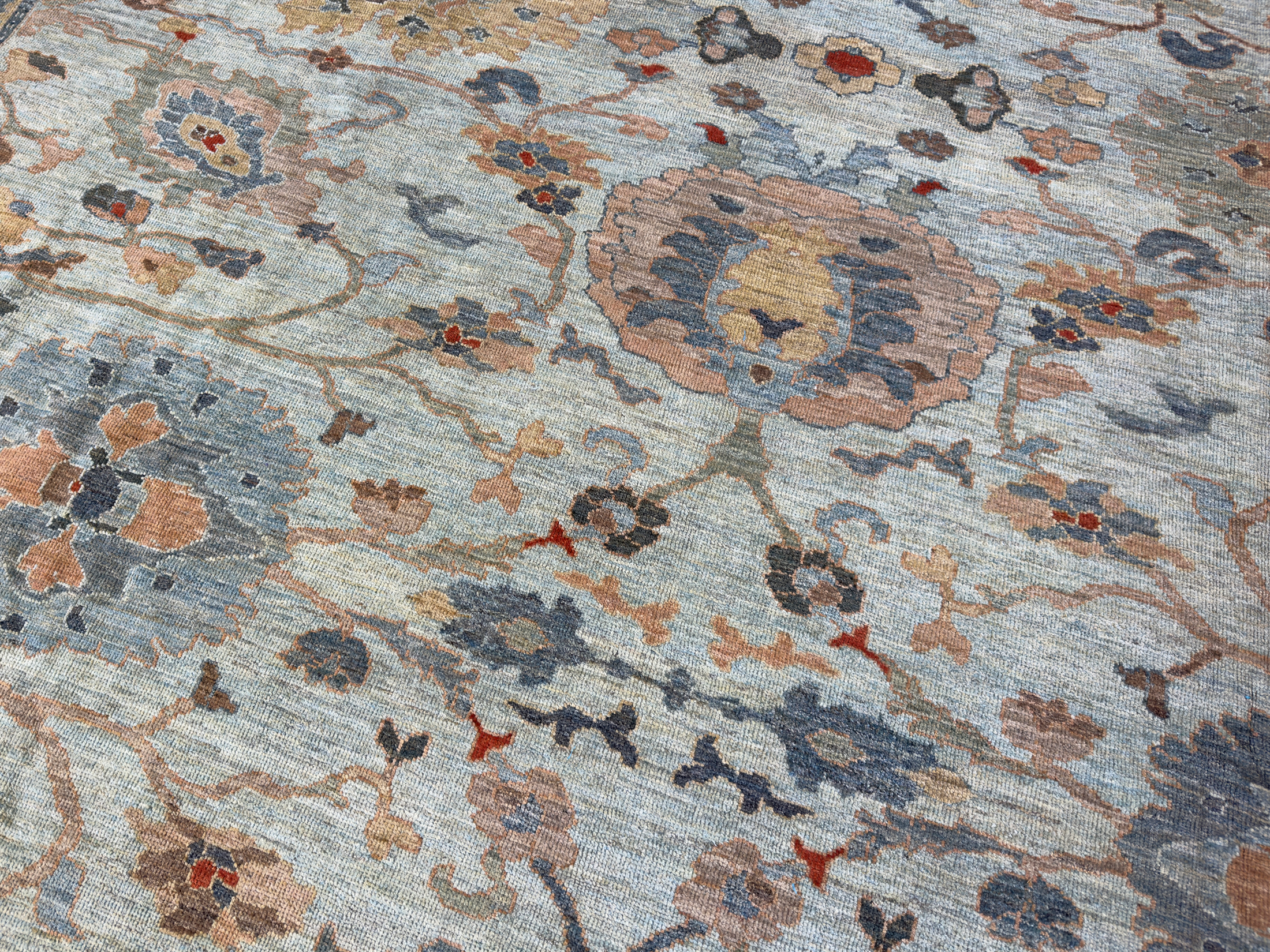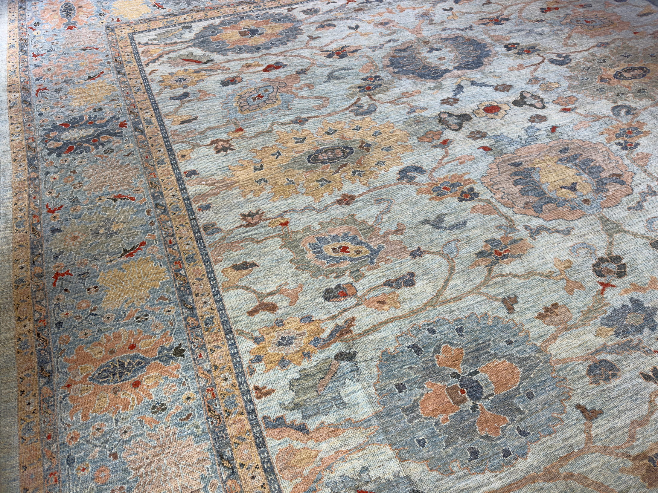 An oversize contemporary carpet using a wonderful large scale palmette floral pattern, this amazing design is taken from an antique Ziegler carpet. These Sultanabad carpets are all hand-woven with the best hand-spun wool and natural dyes. The pile height is cut low to medium high, making them look more like an antique carpet and not brand new. This means placing them in any room, they look like they have always lived there and timeless in their look.