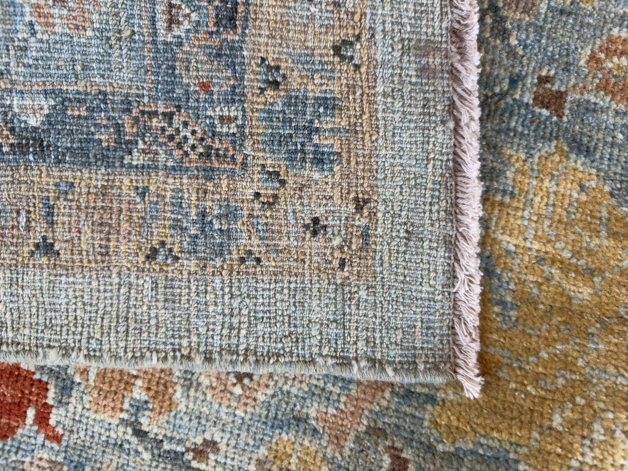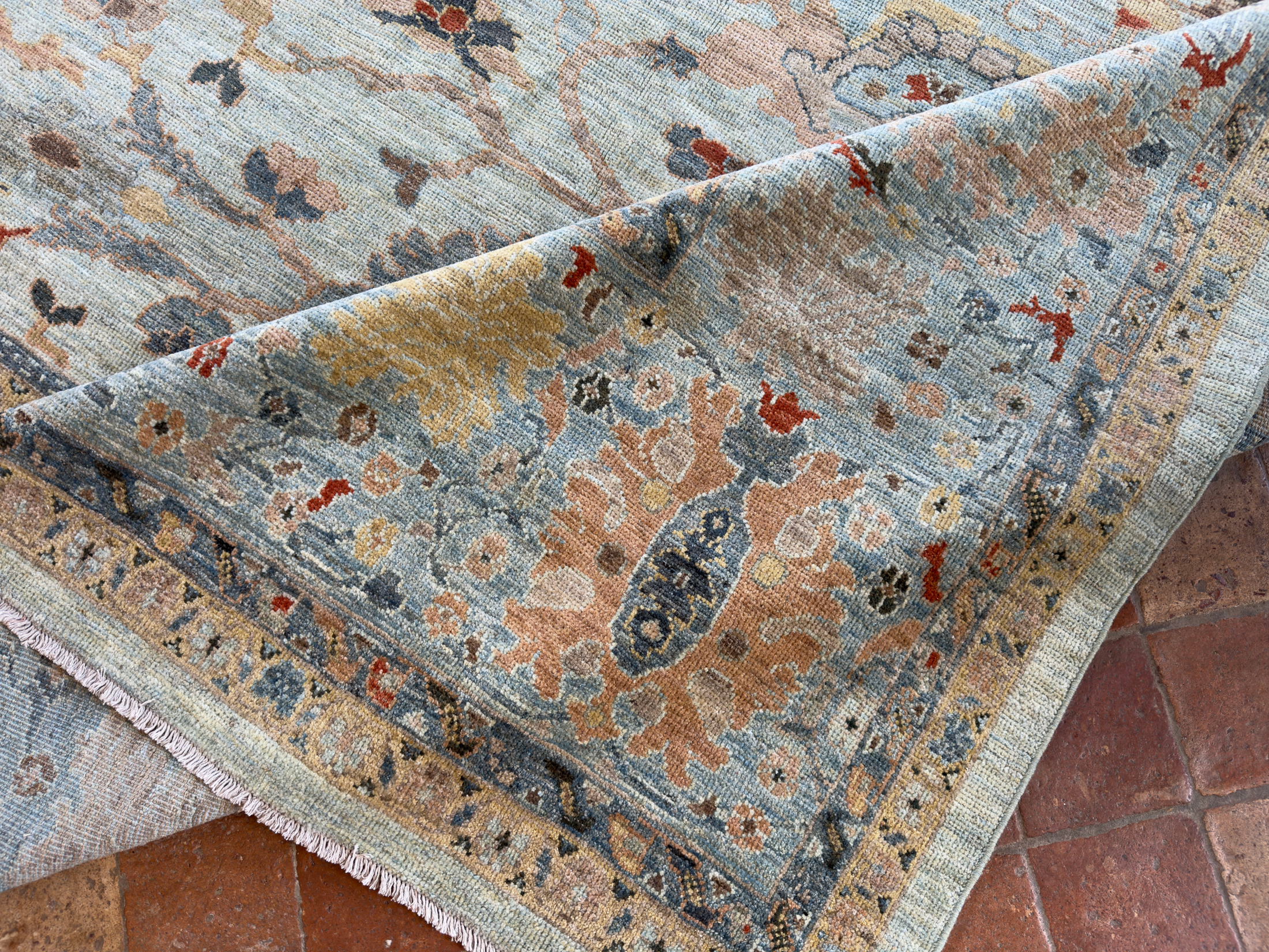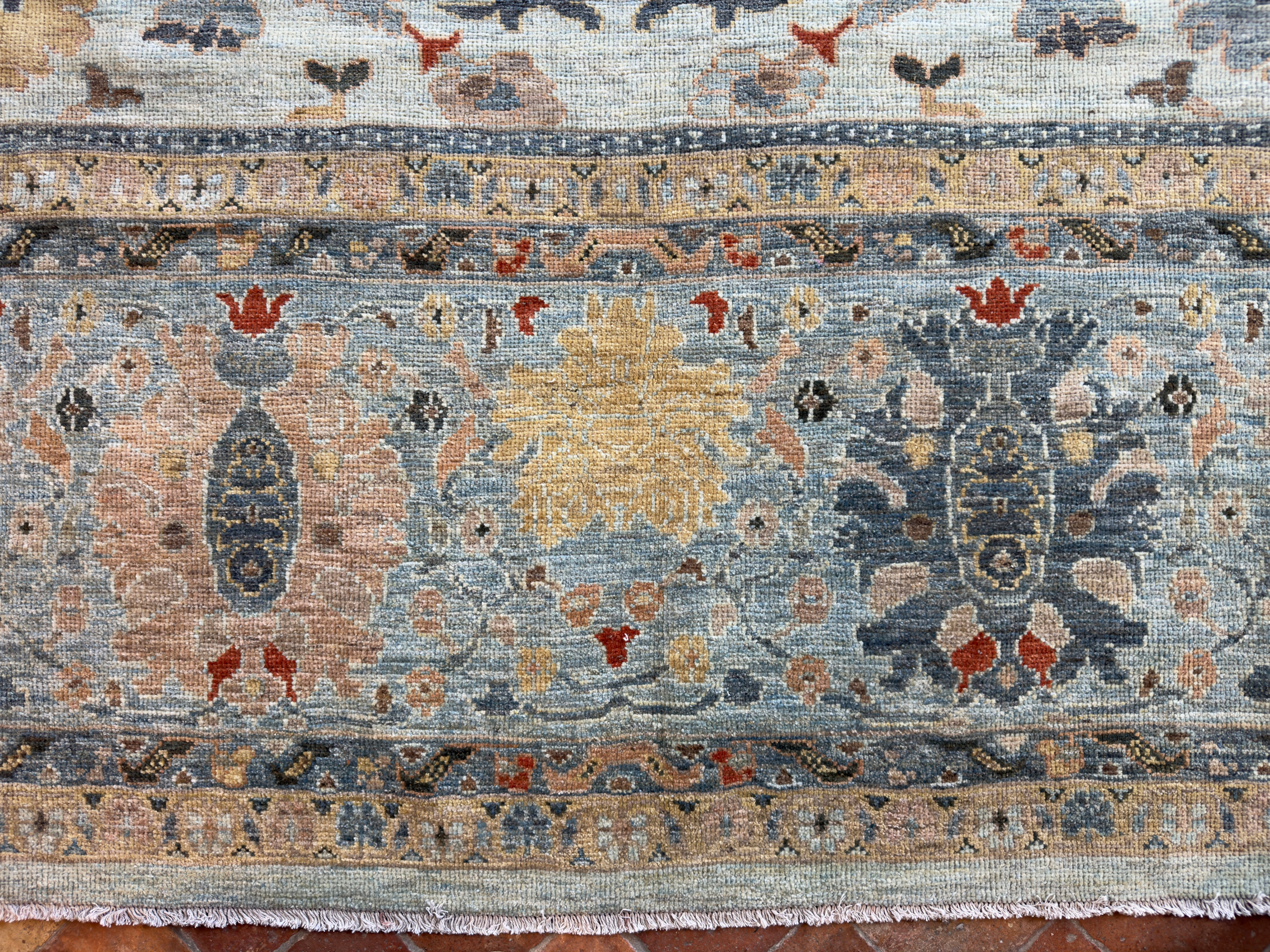 Woven with exquisite colours of indigo blues, soft gold tones, grey tones, and faded pinks and hints of warmer red dyes. The background is a mixture of pale blues and greys, giving it great depth, the border is a delightful pale blue. We have a large collection of beautiful contemporary carpets and rugs alongside our antique carpets and rugs.