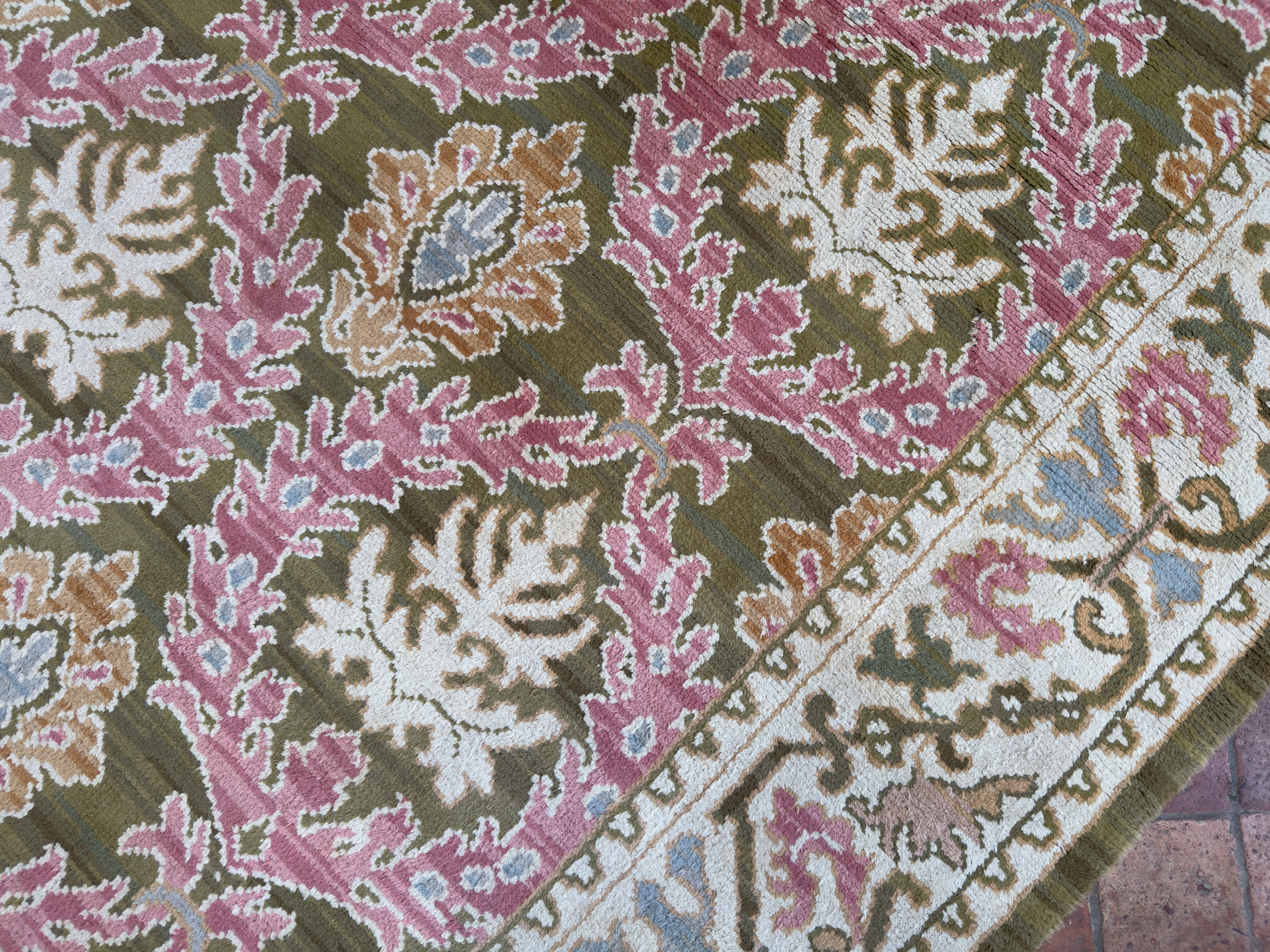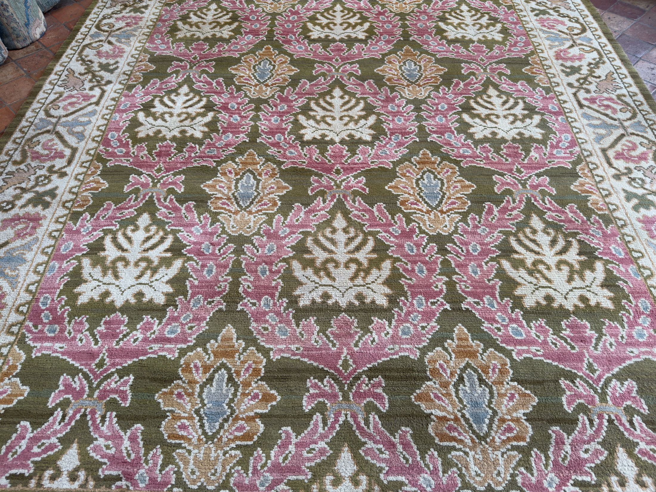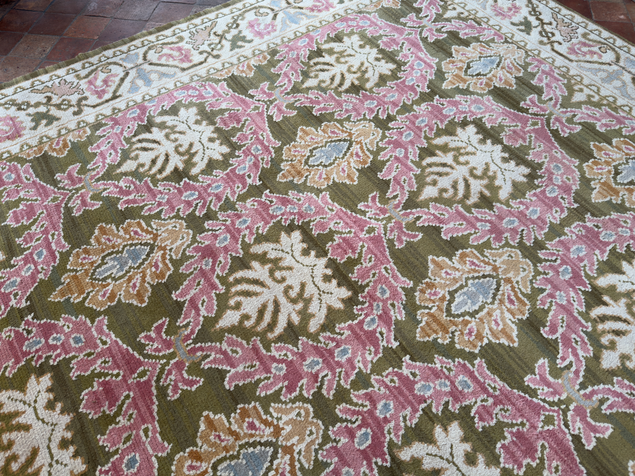 We offer the service of viewing our carpets & rugs in-situ in London, Surrey, Hampshire and all over the UK & Europe by appointment.  Request a home visit to choose a convenient day and time to view this beautiful pale antique Spanish carpet in situ to see if it works with your interior.