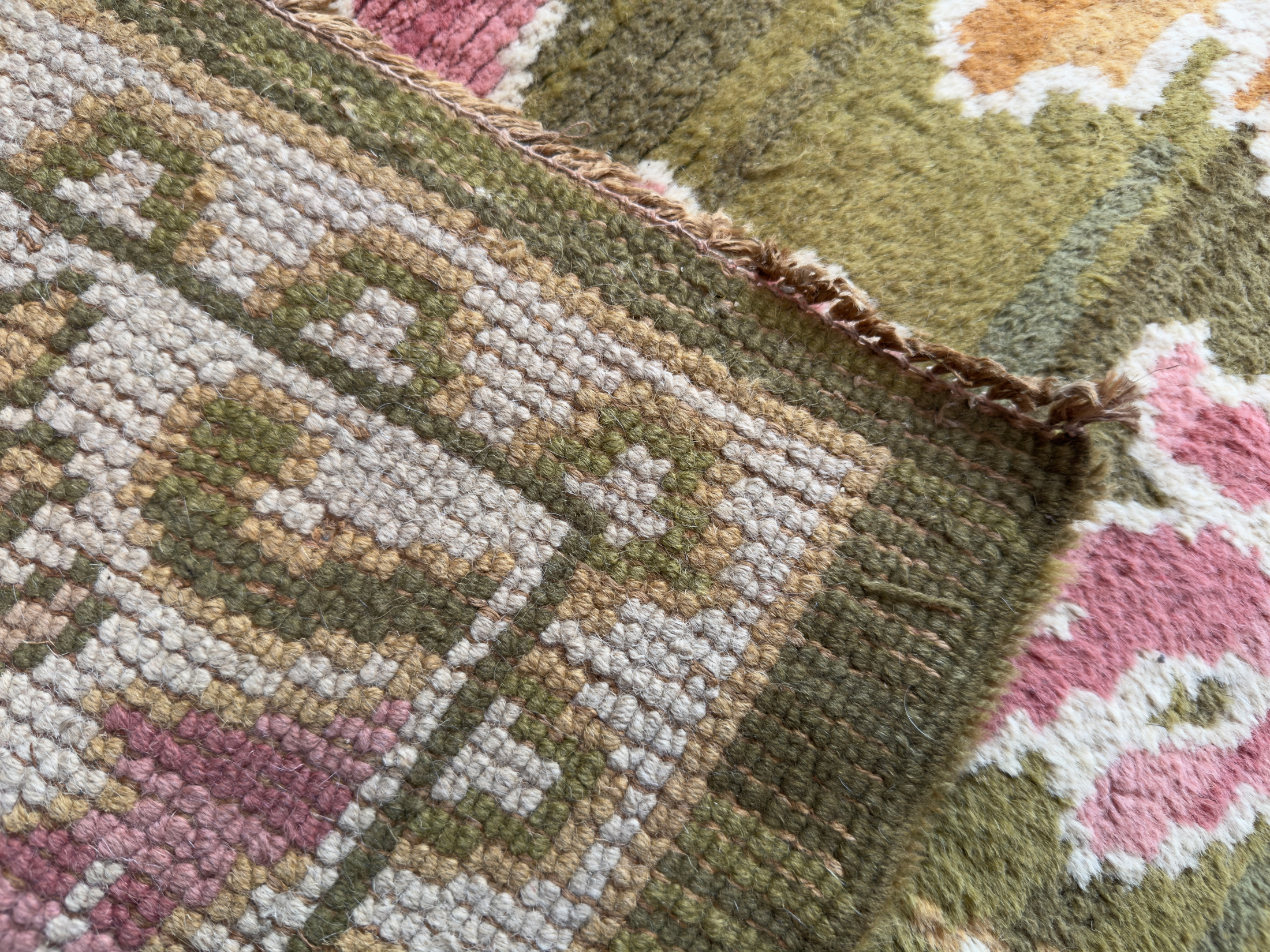 Dating from the 1920-30’s this is an exceptional piece, in brilliant original condition all over, original fringes and sides, the wool pile is consistent and high all over this beautiful and interesting carpet.
