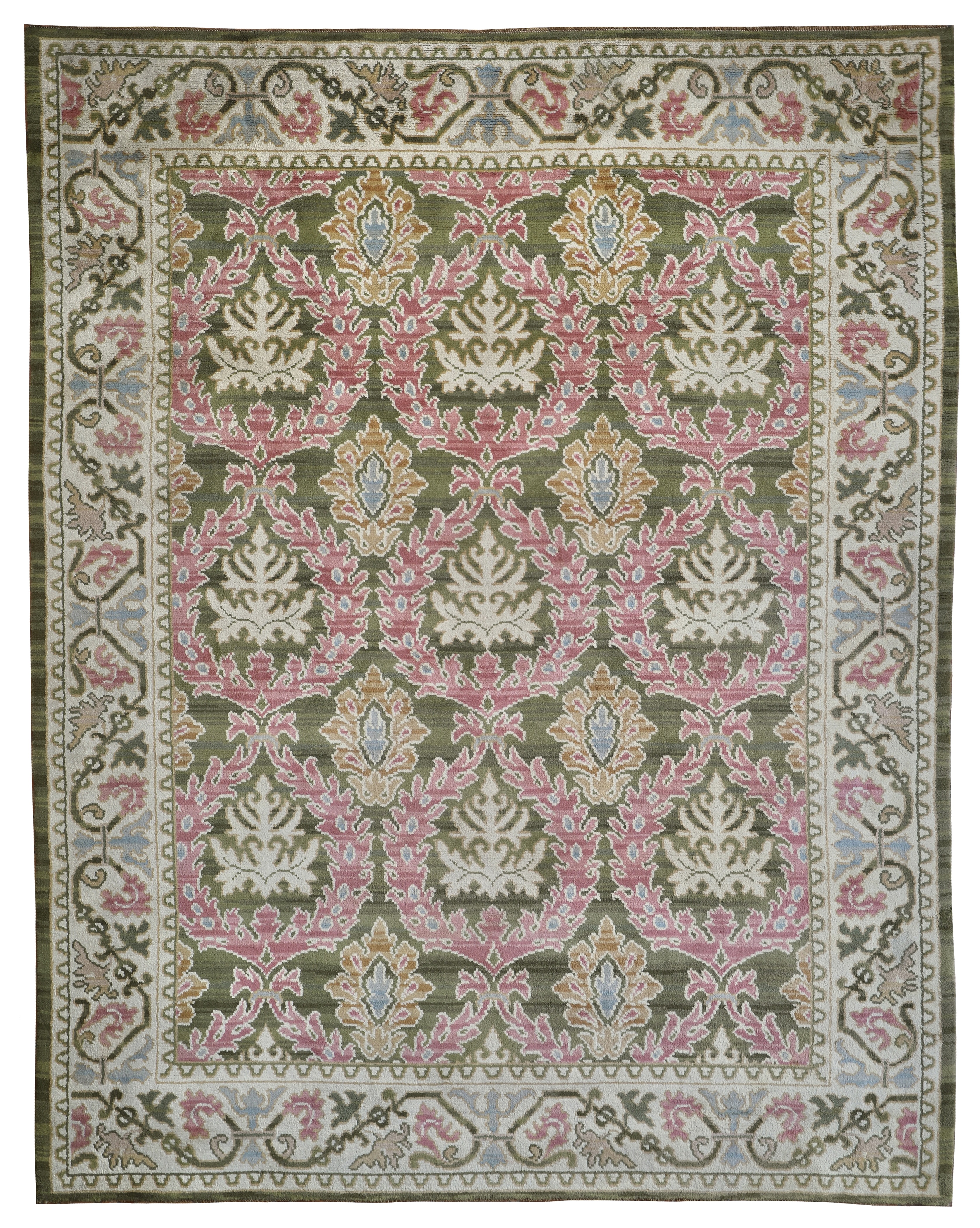 A super decorative antique Spanish Cuenca carpet with a large scale Damask influence in the design, woven with wool rather than piled they are knotted in staggered stages. Handwoven in the city of Cuenca, between Madrid and Valencia, especially in the 17th and 18th centuries but also more recently as is this early 20th century example.  This is woven on a jute foundation too, and the pile is dense and luxurious, ideal for a bedroom to add warmth and character and luxury underfoot.