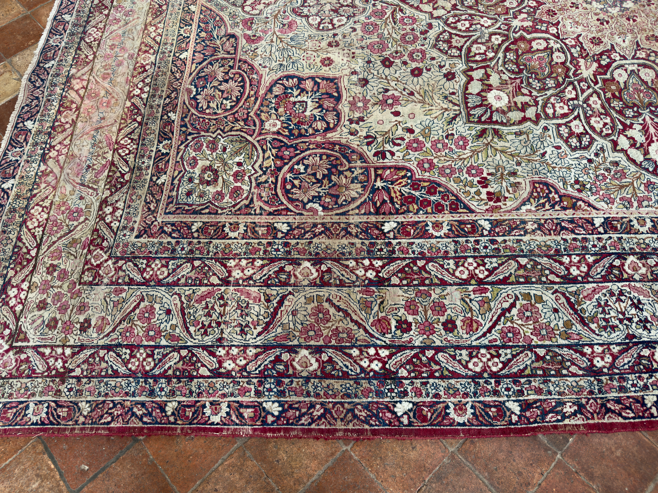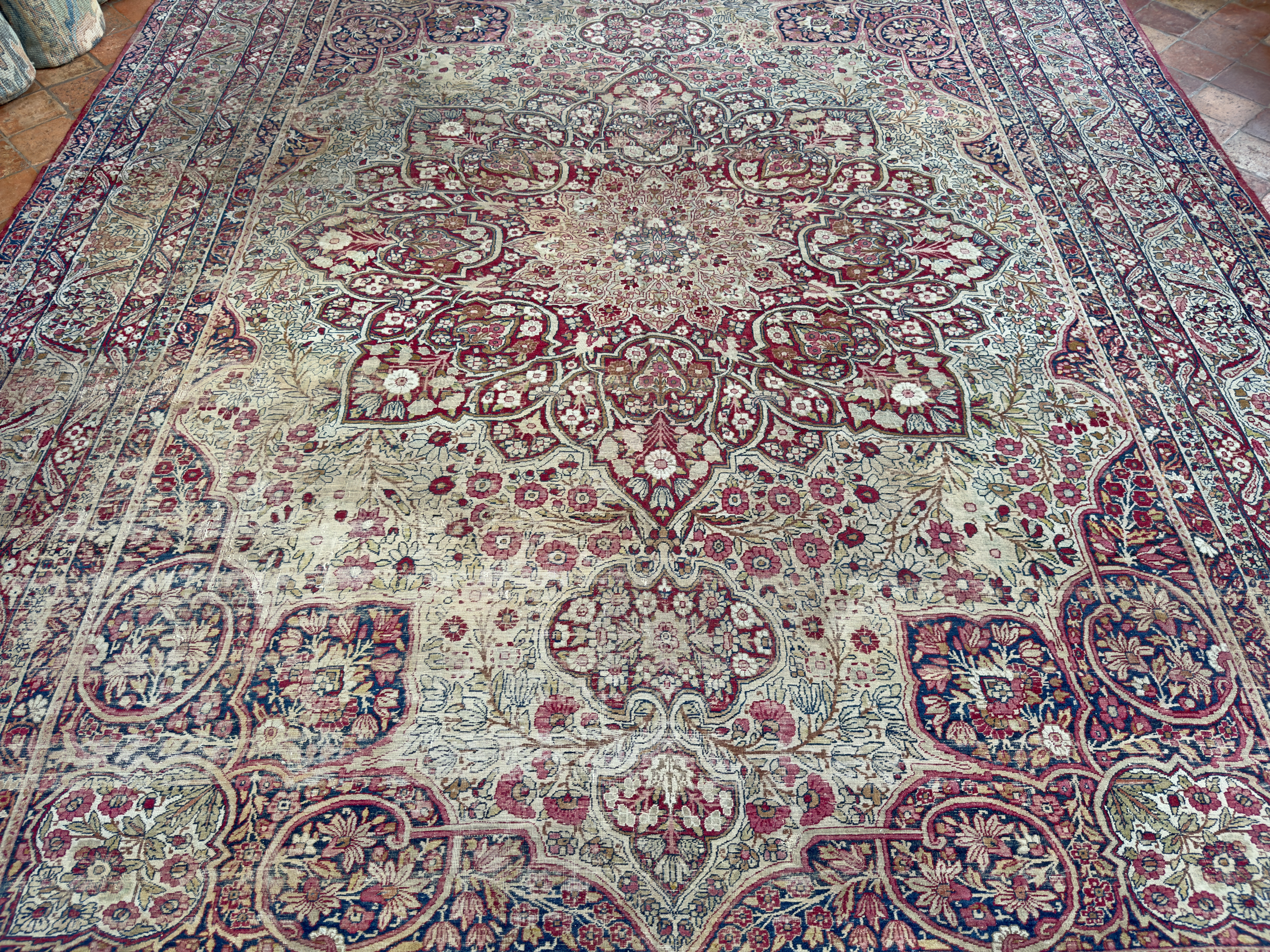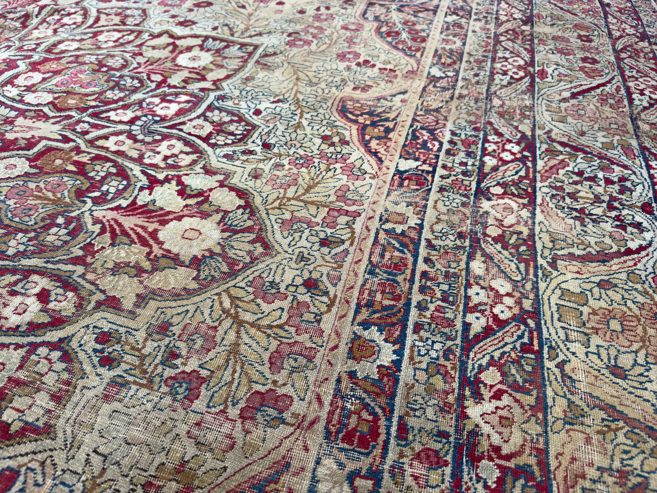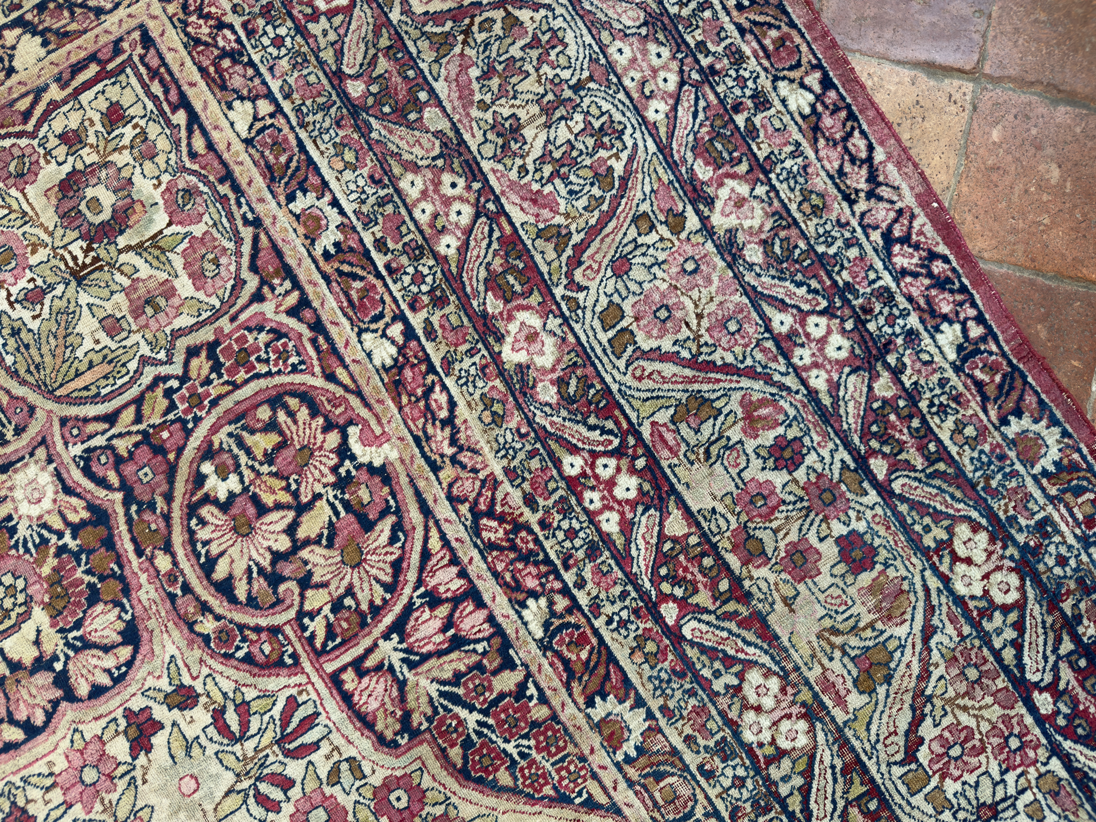 Book in a showroom visit by appointment or request to view this lovely distressed antique Kirman carpet at home soon. Or please request a home visit, we travel all over the UK showing our carpets and rugs in situ to help you select the ideal carpet for your home.