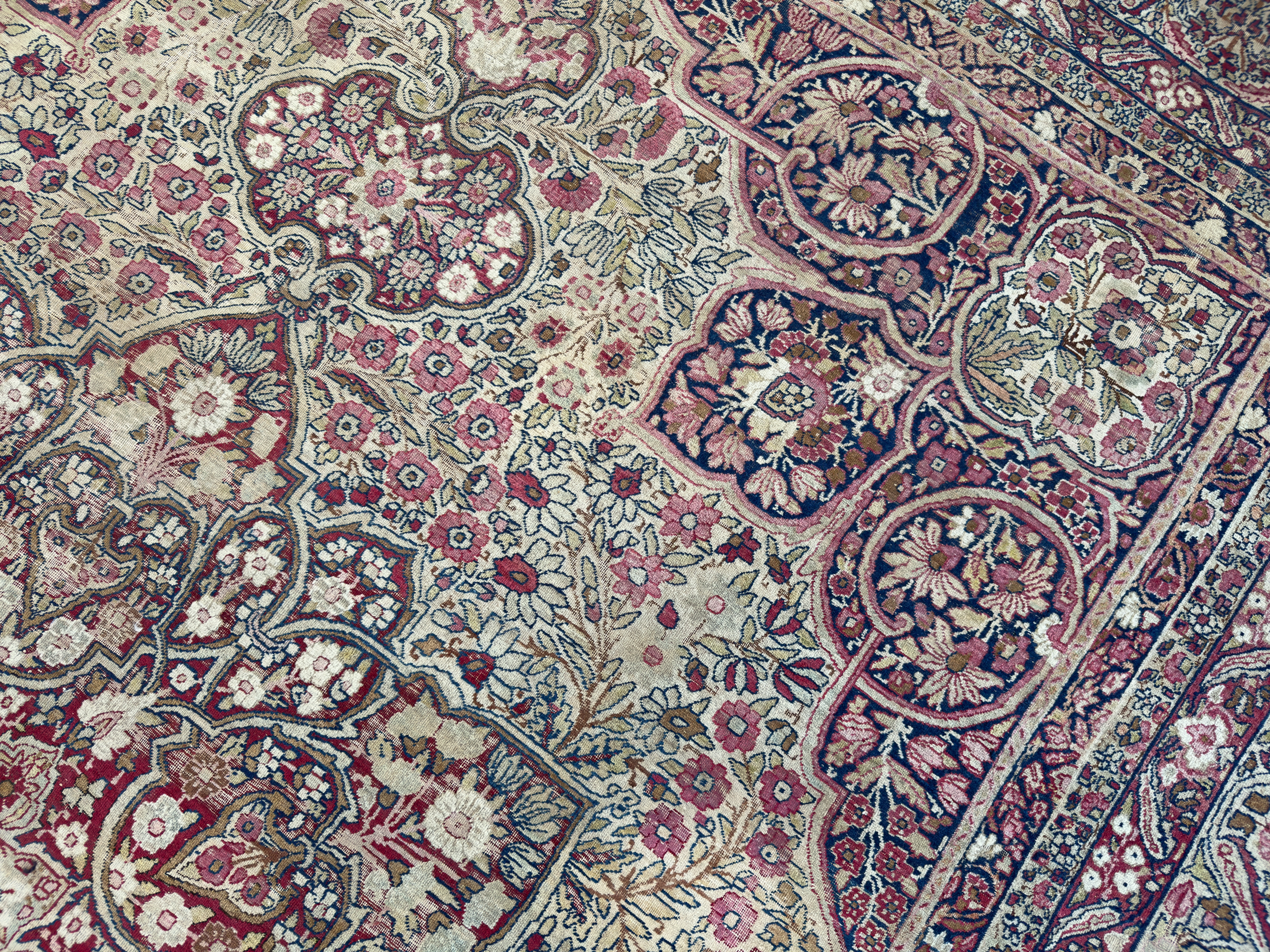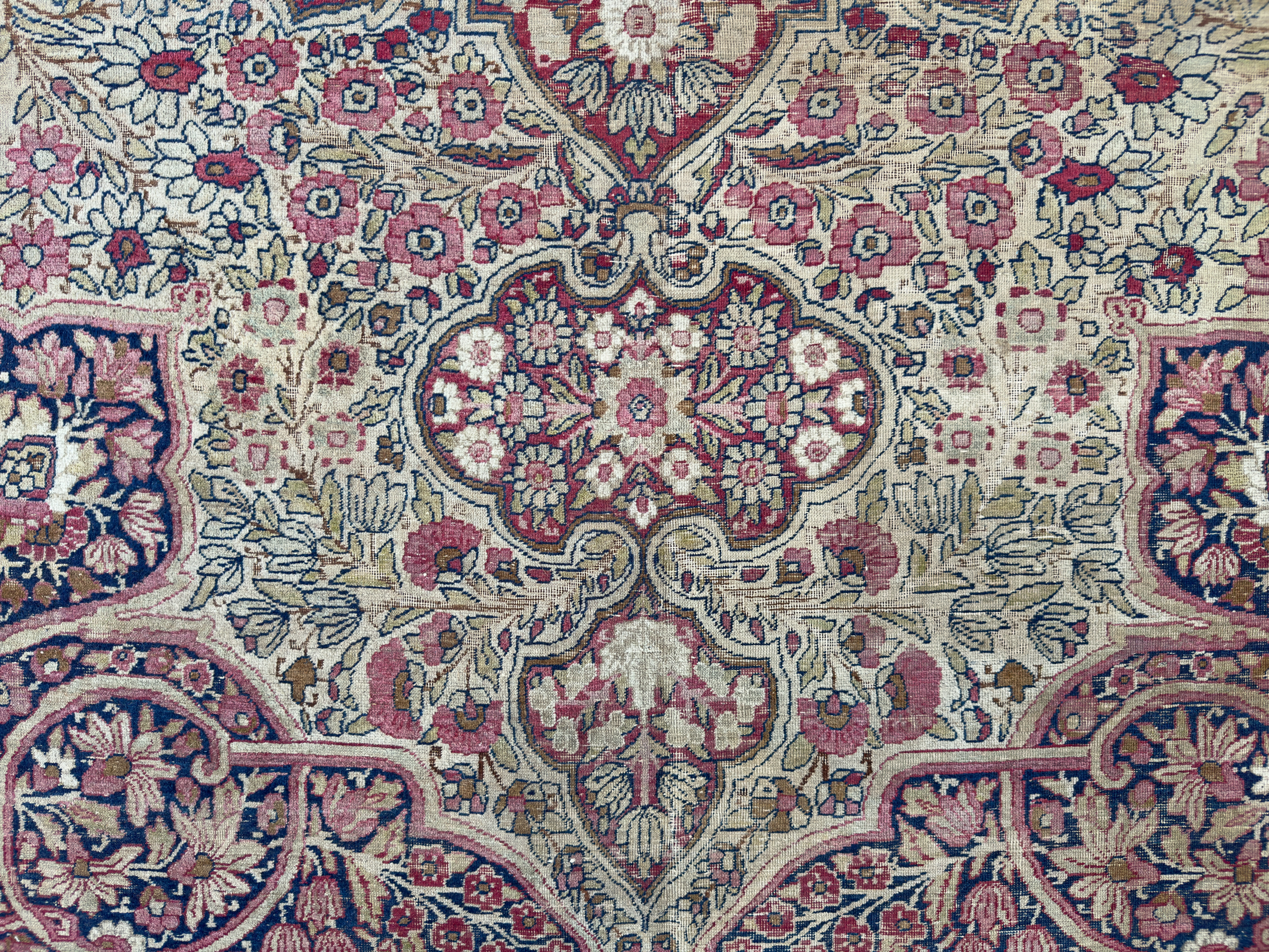 A fine and beautiful distressed antique Kirman carpet, a delicate floral design with soft pinks and blues. An incredibly decorative and interesting carpet, the detailing is exquisite all woven by hand around 120 years ago.