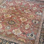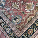 A wonderful distressed antique Mahal carpet, with an all over large tulip floral design – this is an ancient design and connecting leaves and vines flow around it beautifully.  Amazing greens, gold tones, pale blues and pink tones, the contrasting dark blue almost black border works so well with the whole composition and warm red terracotta background palette.  A great almost square size too, which we rarely find, woven around 140 years ago.