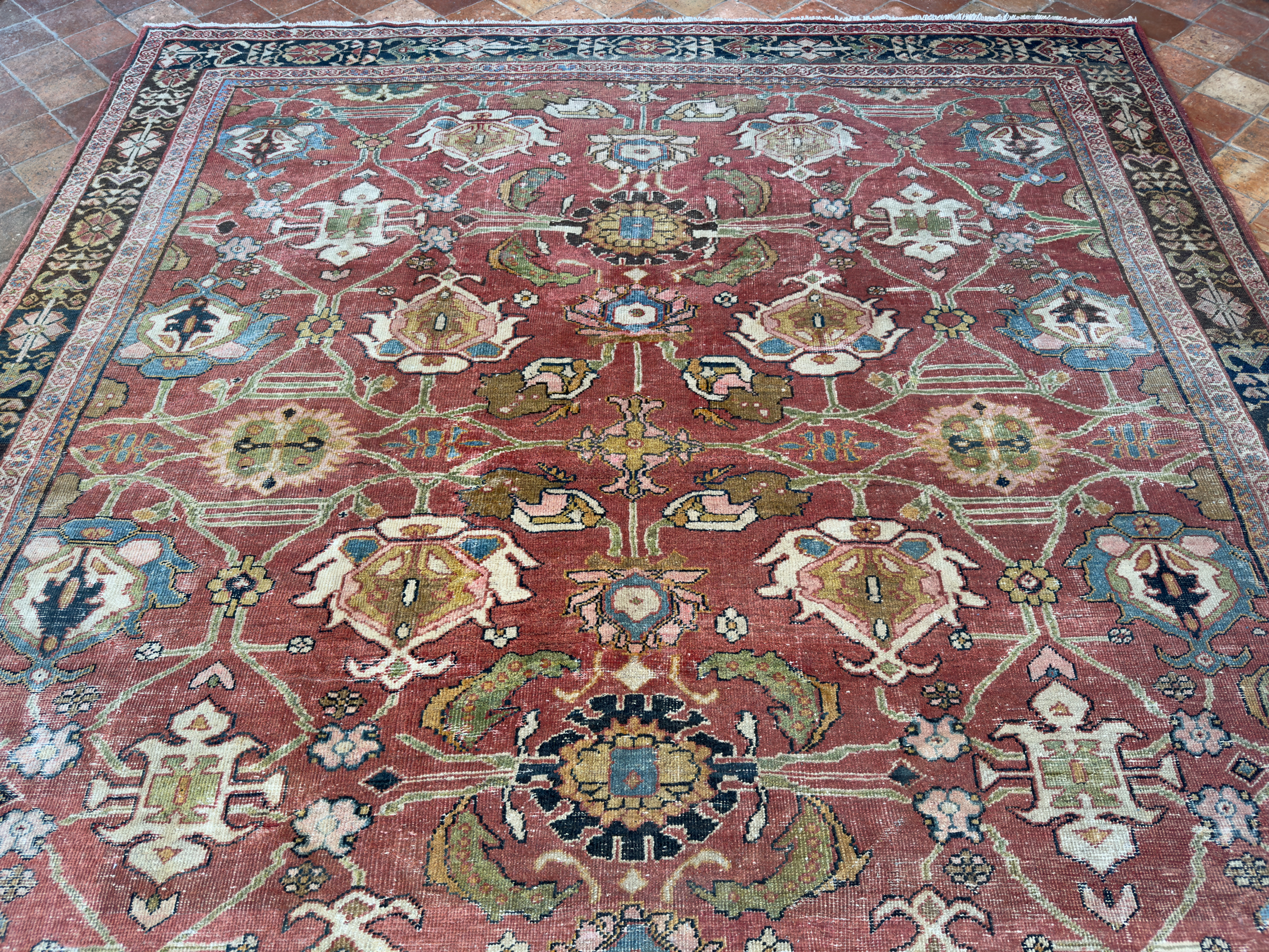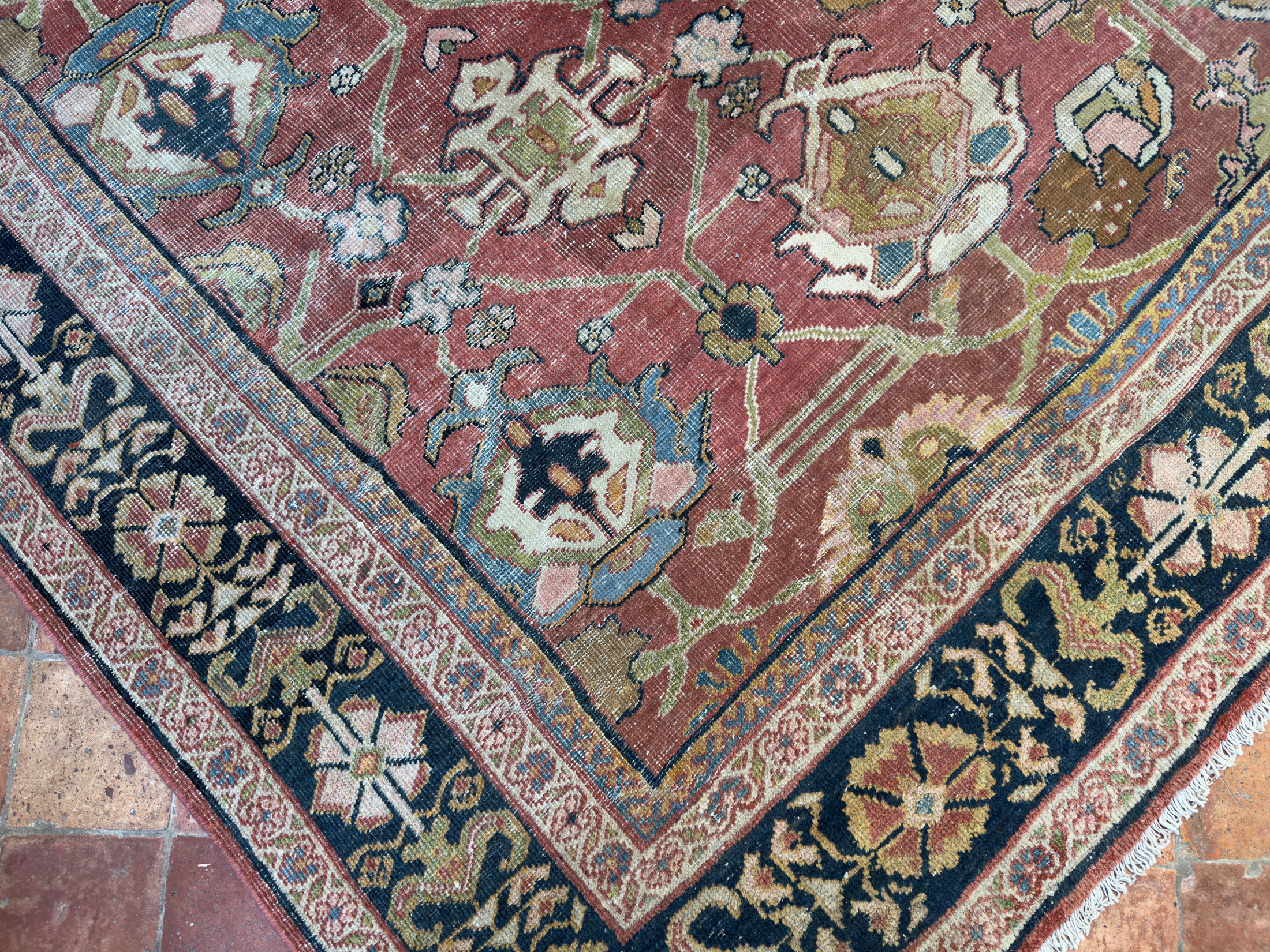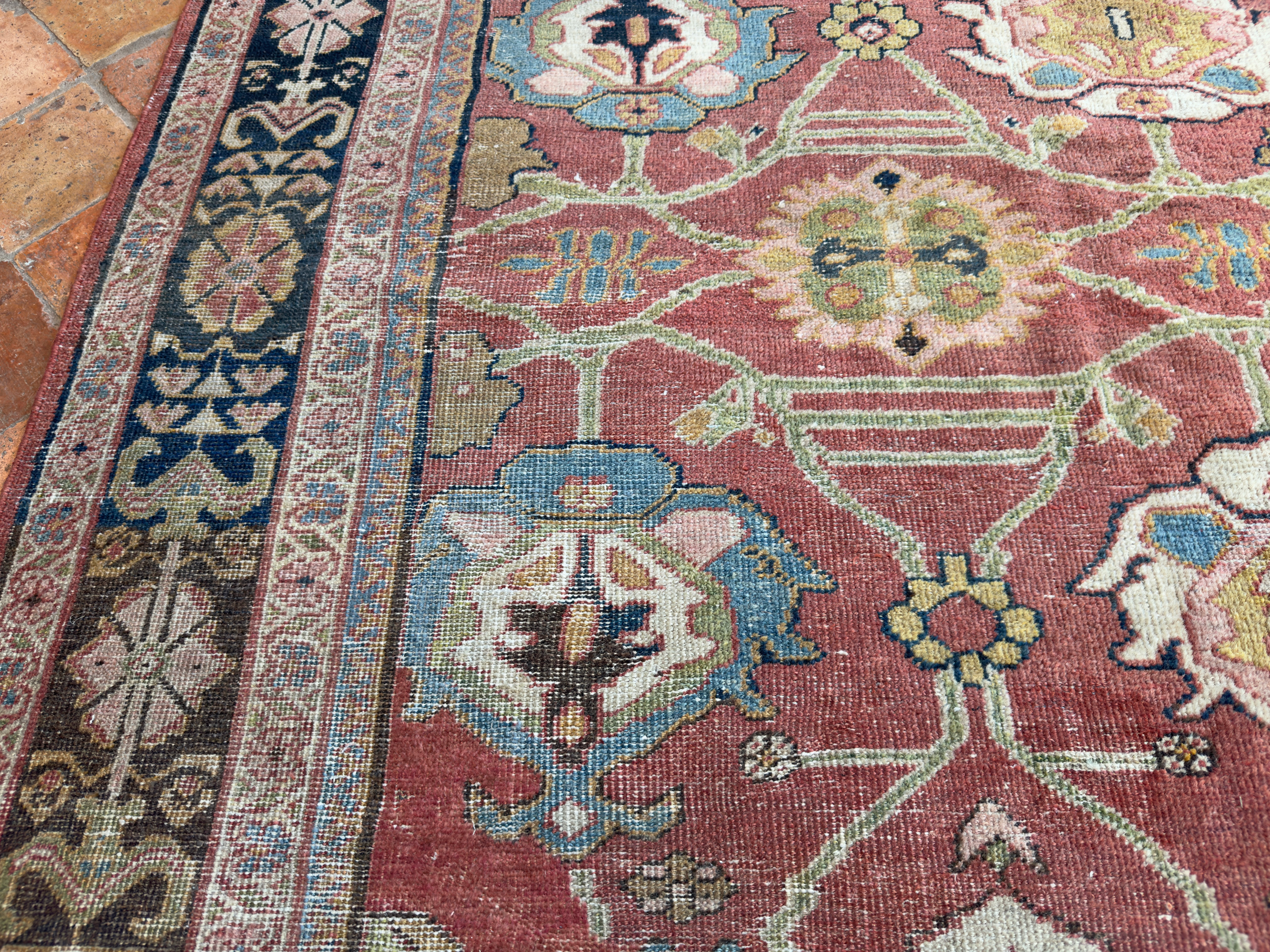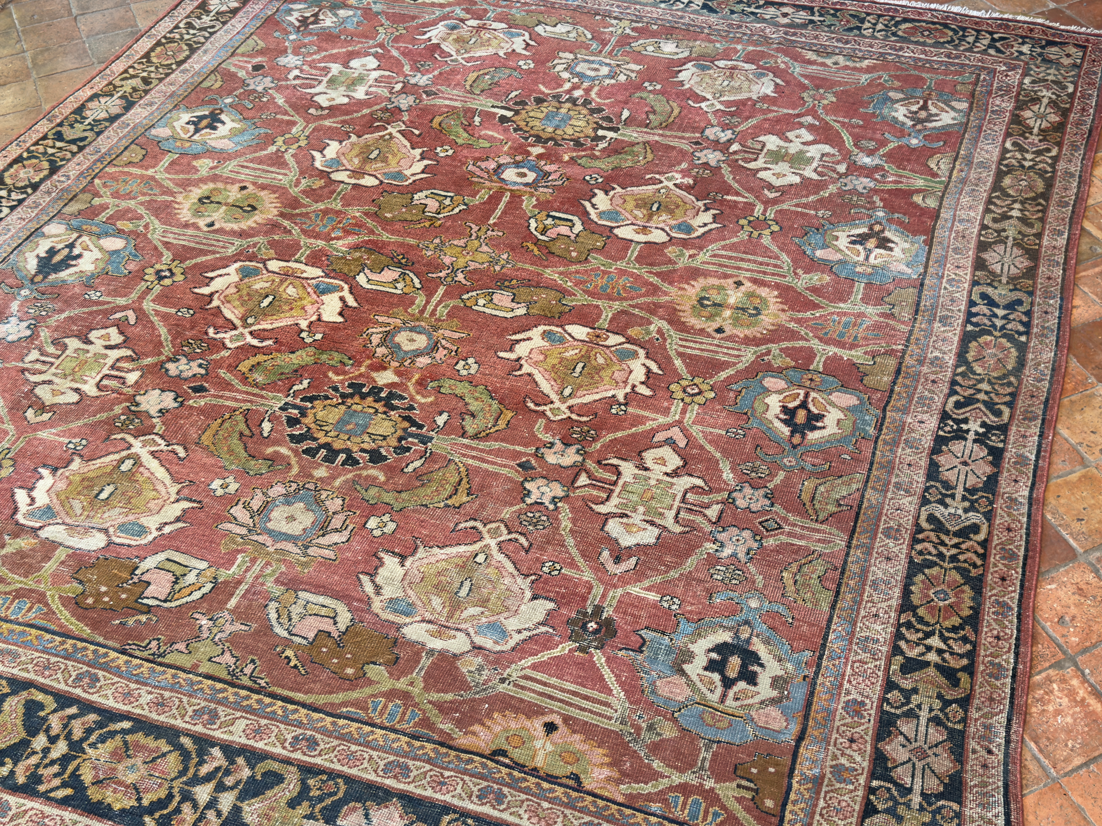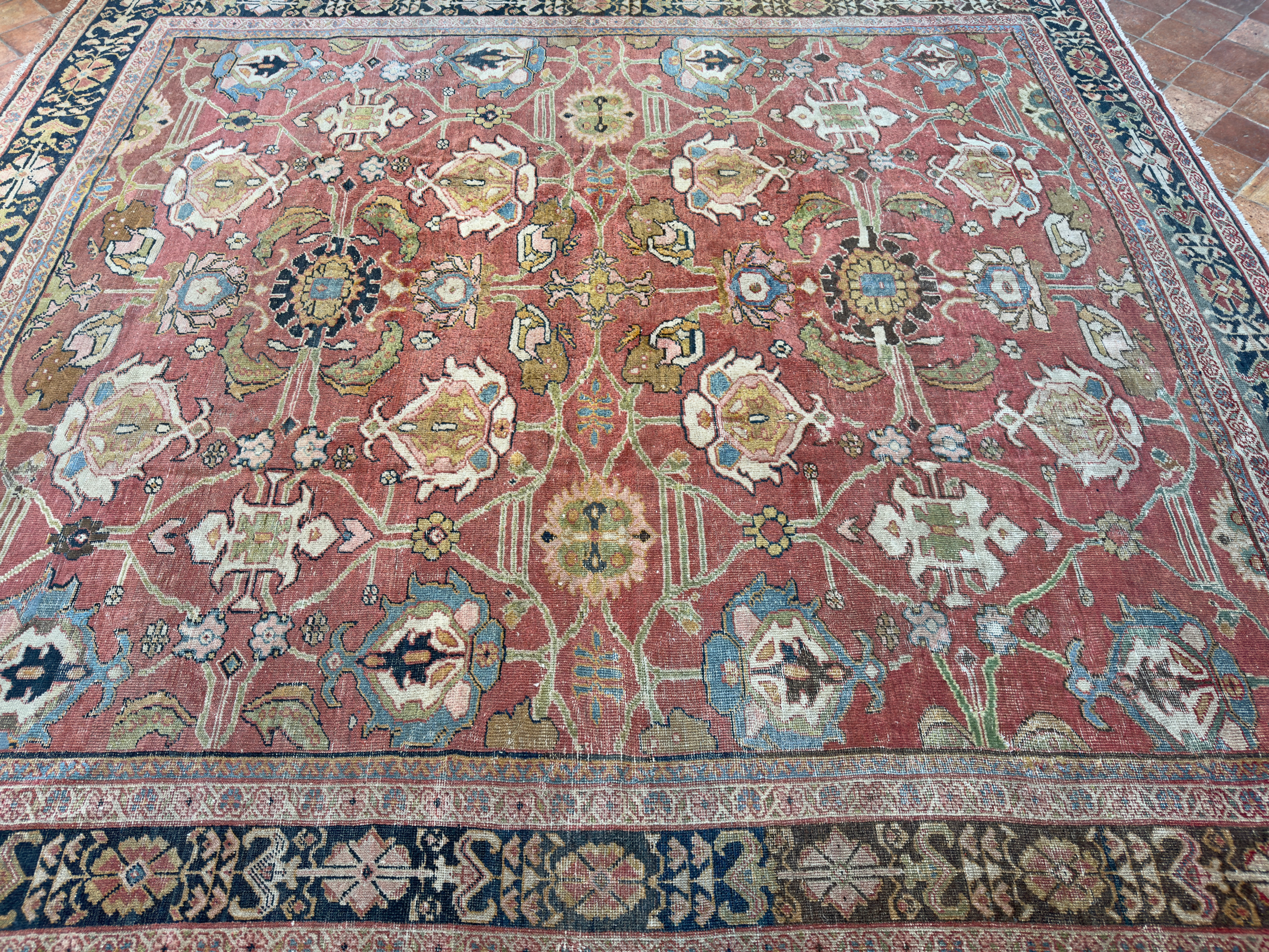 A wonderful distressed antique Mahal carpet, with an all over large tulip floral design – this is an ancient design and connecting leaves and vines flow around it beautifully.  Amazing greens, gold tones, pale blues and pink tones, the contrasting dark blue almost black border works so well with the whole composition and warm red terracotta background palette.  A great almost square size too, which we rarely find, woven around 140 years ago.