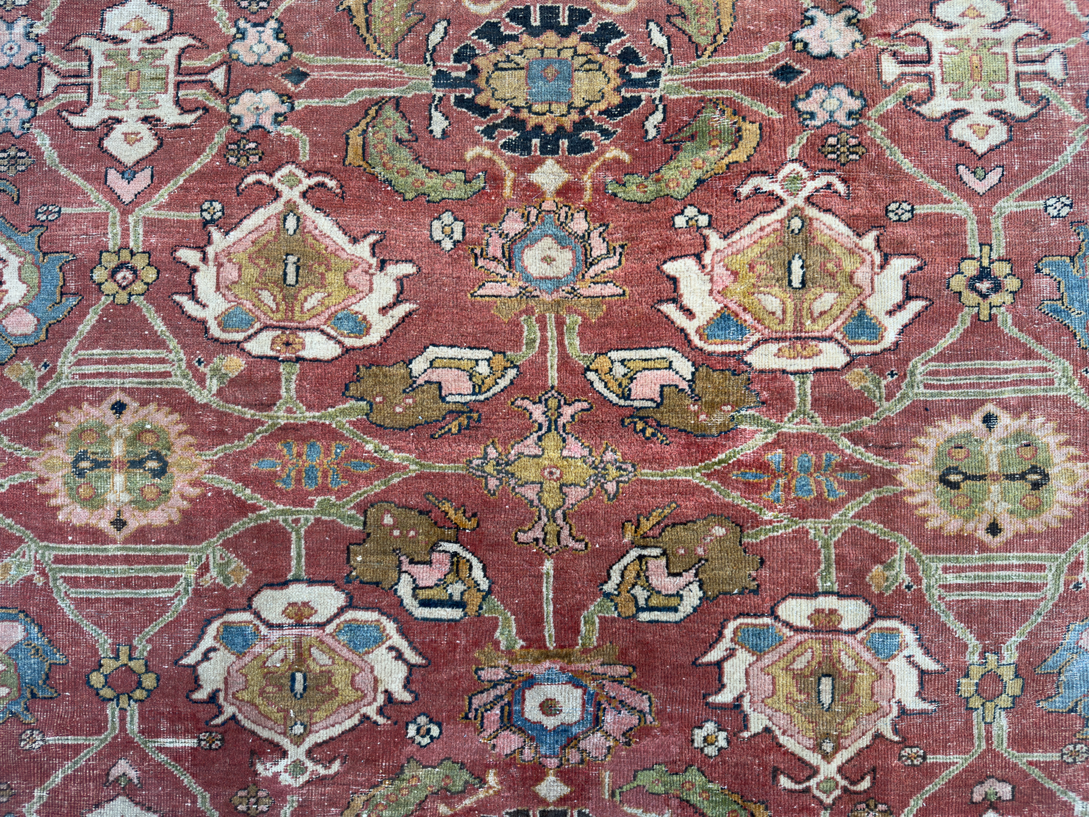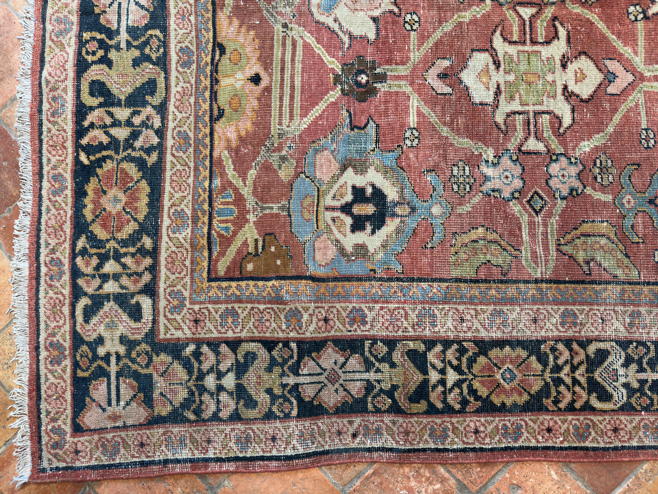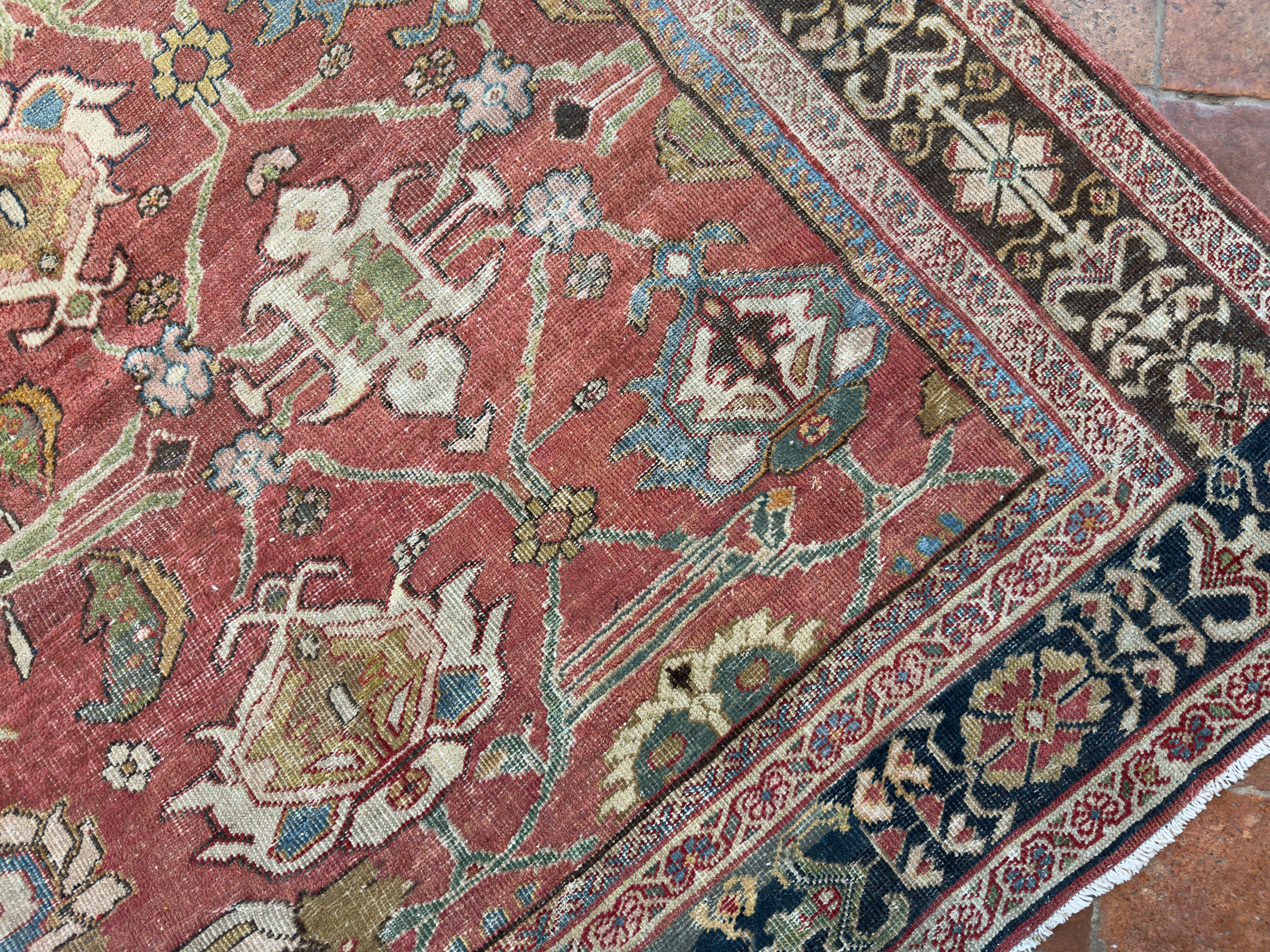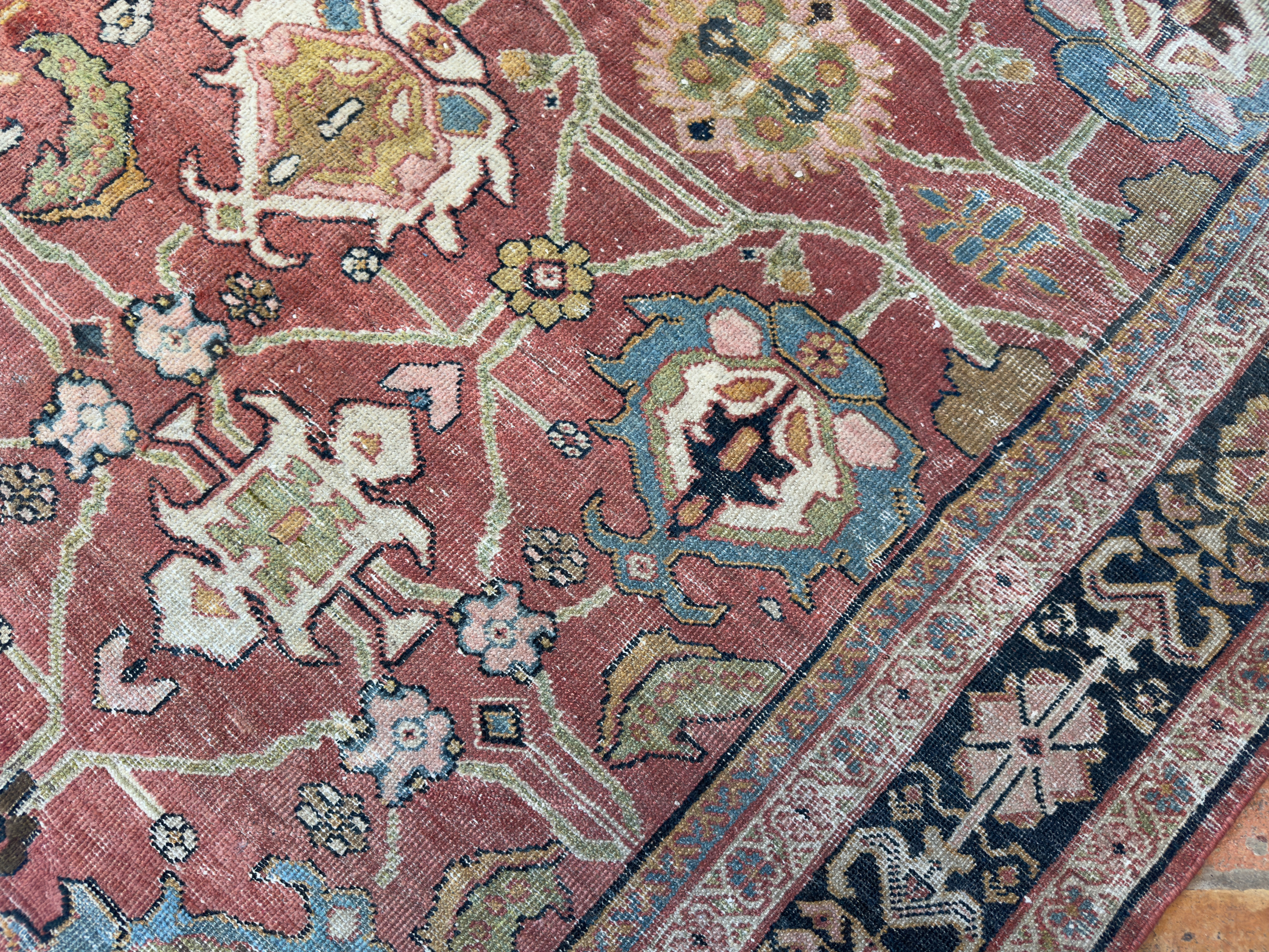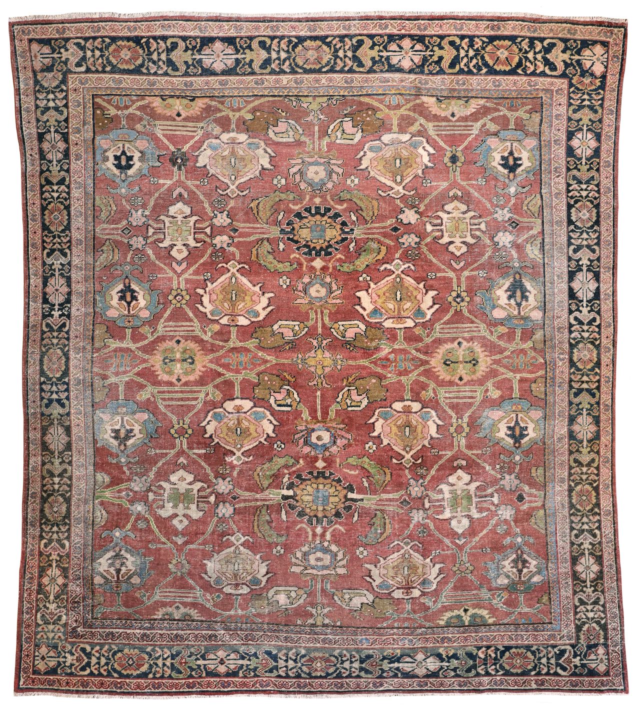 A wonderful distressed antique Mahal carpet, with an all over large tulip floral design – this is an ancient design and connecting leaves and vines flow around it beautifully.  Amazing greens, gold tones, pale blues and pink tones, the contrasting dark blue almost black border works so well with the whole composition and warm red terracotta background palette.  A great almost square size too, which we rarely find, woven around 140 years ago.