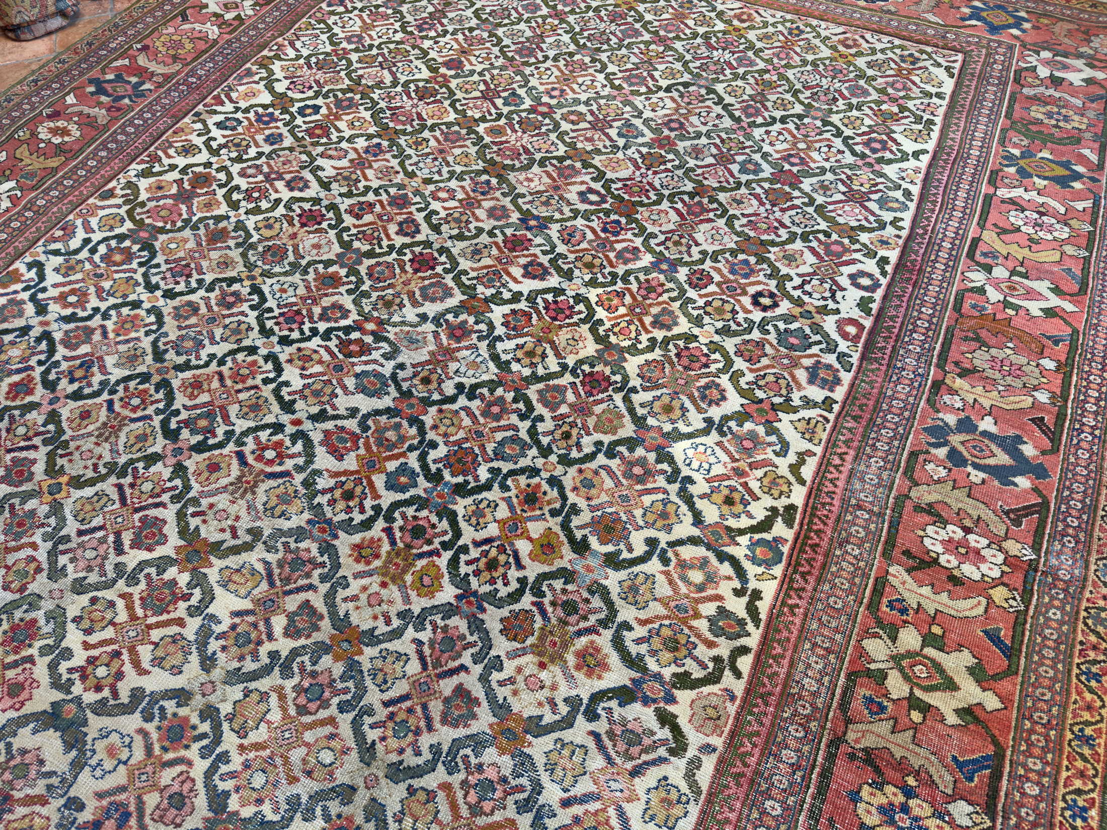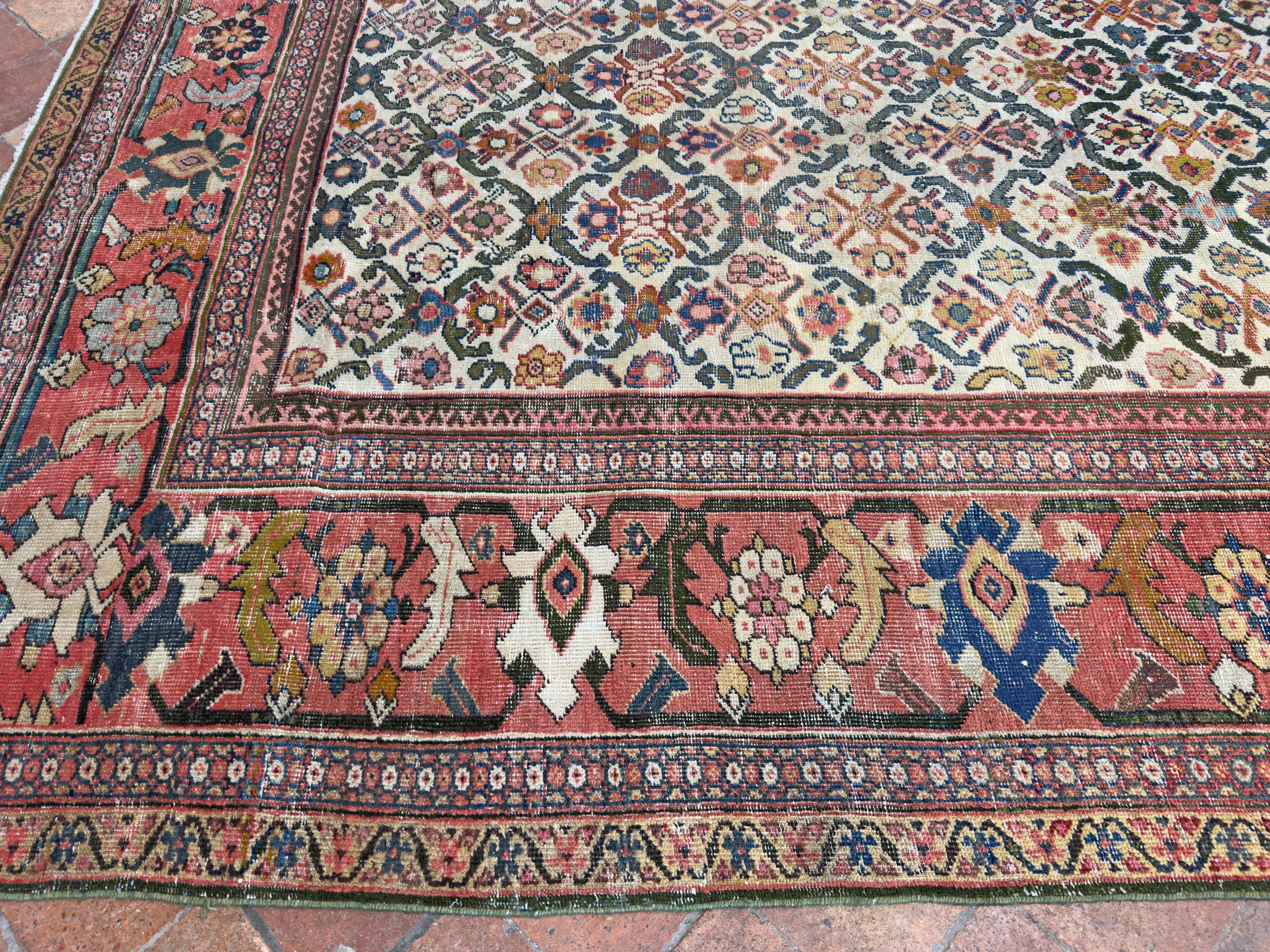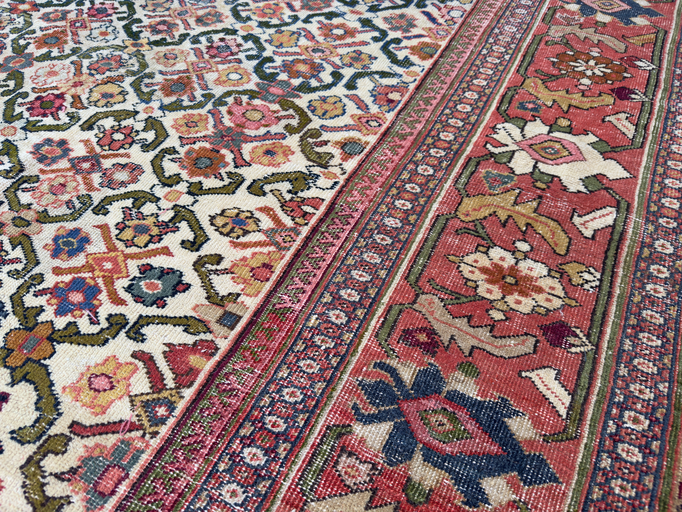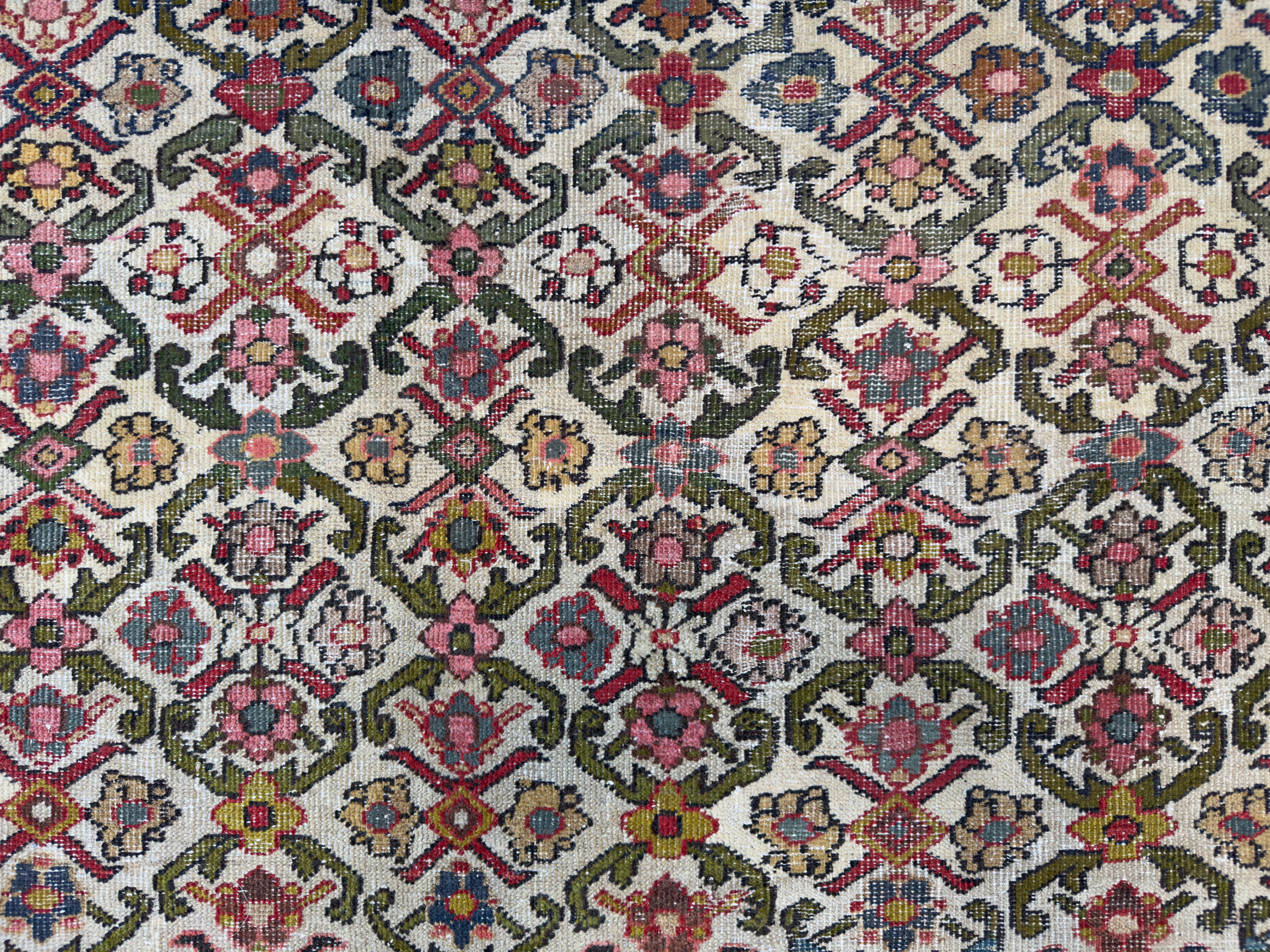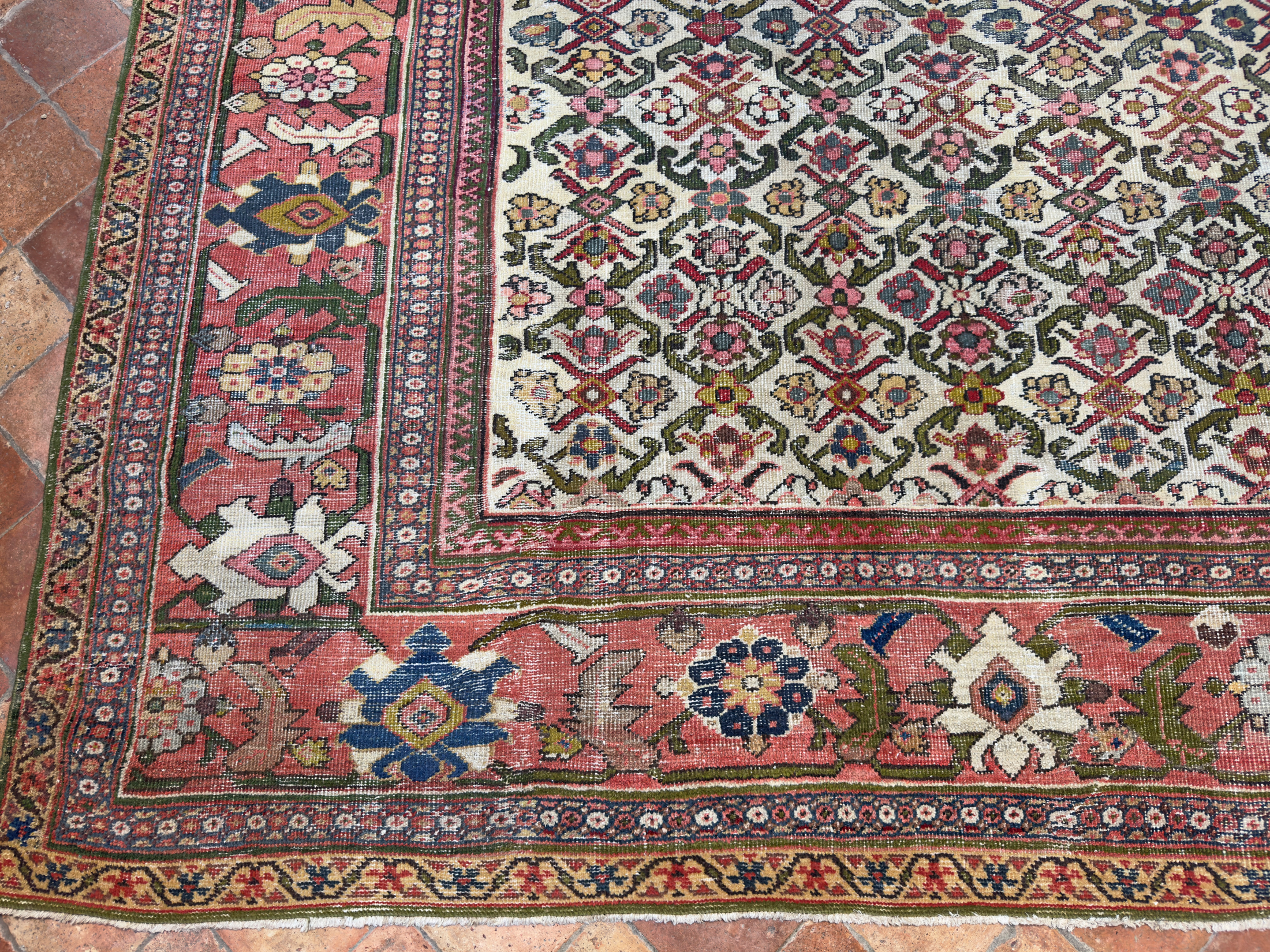 This is a very beautiful and slightly distressed antique Mahal carpet, with the hard to find ivory background colour. Using wonderful pale greens, blues and pinks for the all over design. A soft pink tone light border is a great contrasting colour to the ivory off-white background.