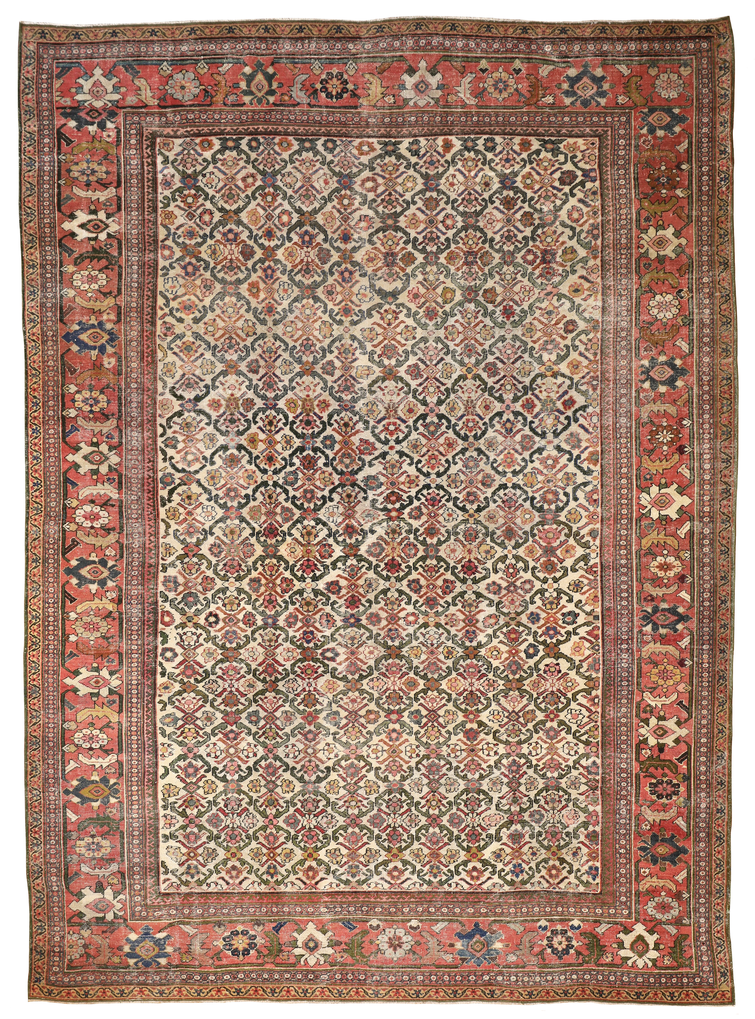 Mahal carpets were produced in Sultanabad, Persia which is now Arak in the centre of Iran. Mahal and Sultanabad rugs were made in the same area as the earliest Fereghans and Sarouks, but they are very different in form and structure. Floral motifs and overall designs of vinescrolls and palmettes remain consistent with the influences of western colour palettes and are all characteristics of Ziegler carpets.
