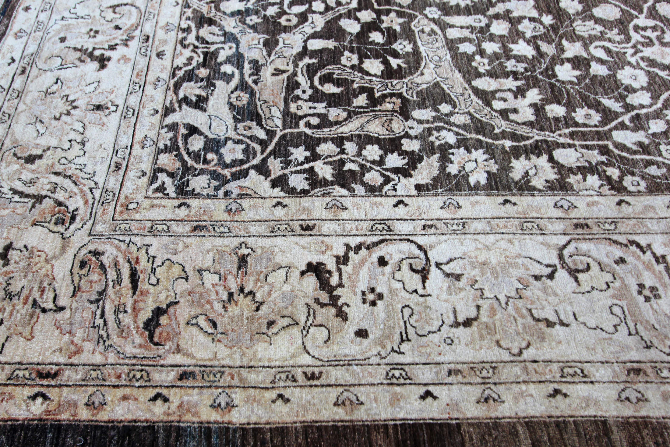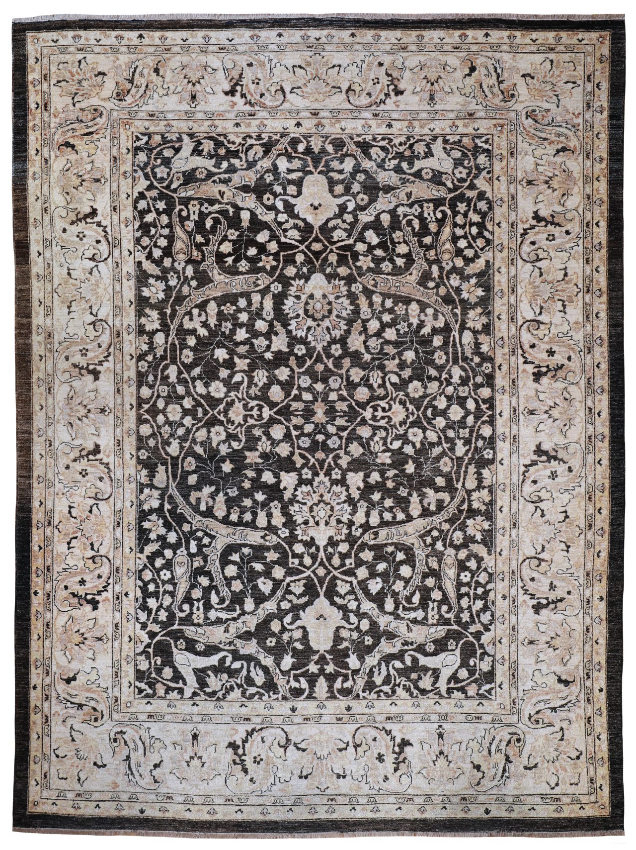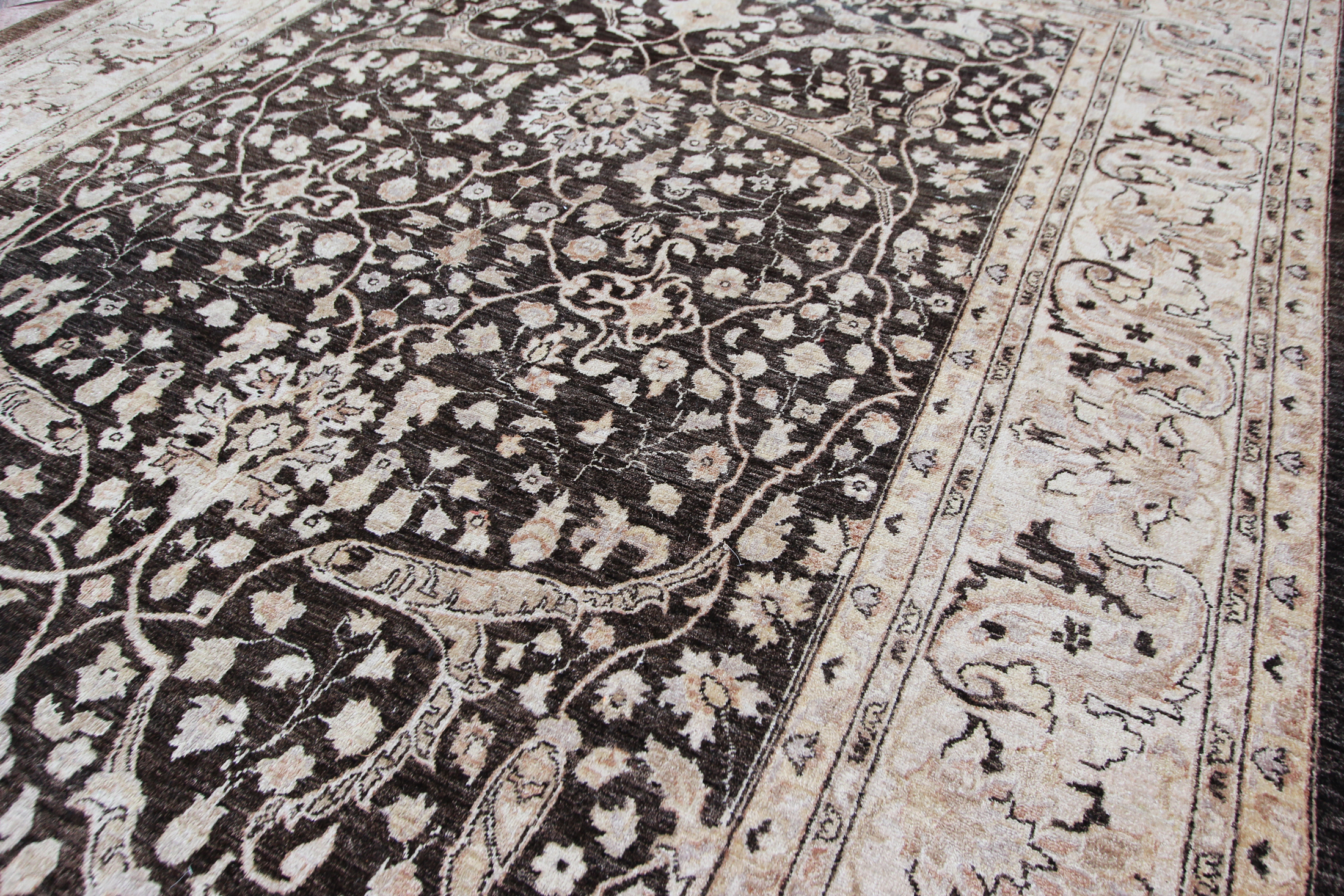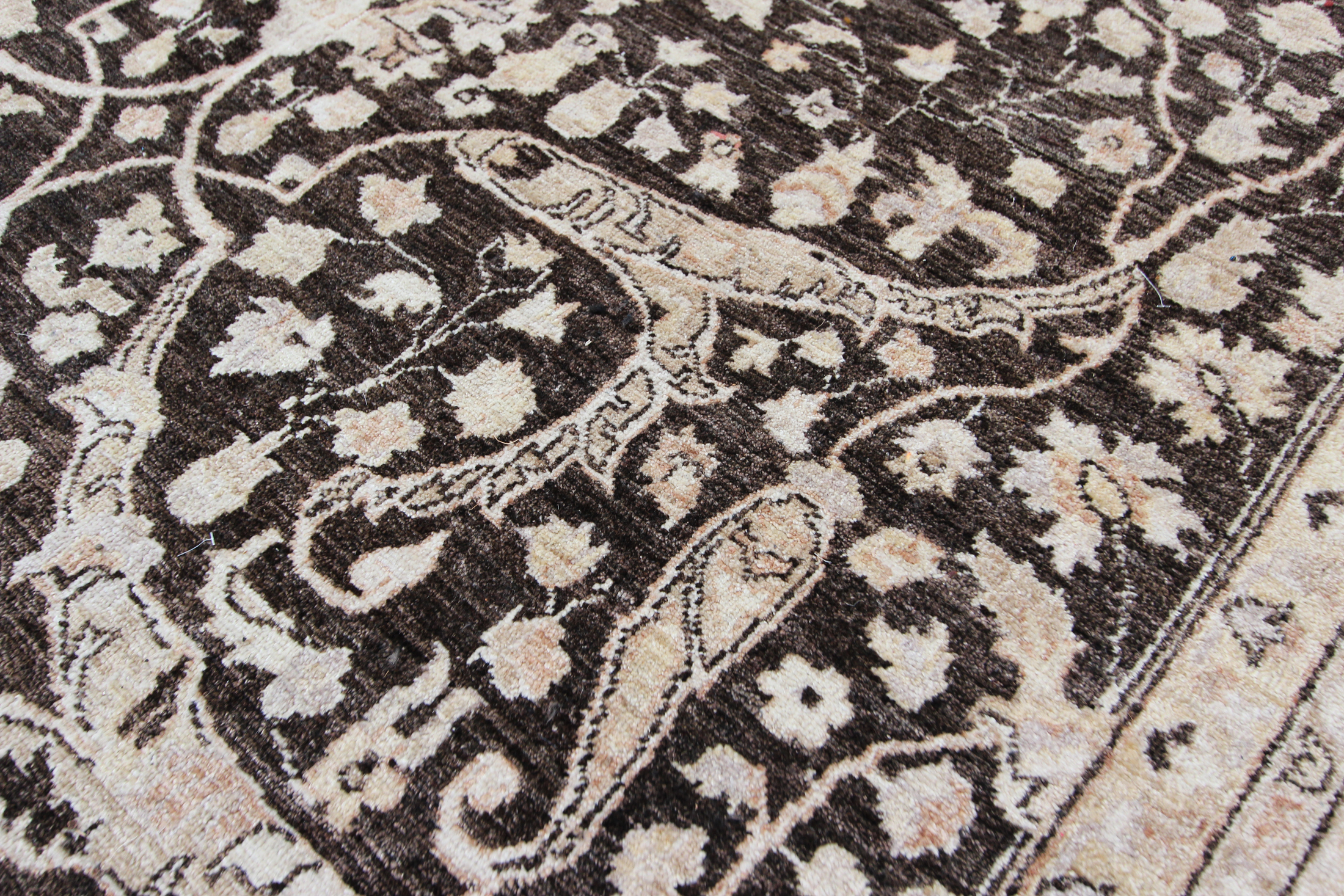 With a design taken from an antique Bidjar Garrus design from late 19th century, this is a beautiful vintage carpet hand-woven using natural dyes and soft hand-spun wool. Woven around 1990, this piece has been washed by our workshop and is ready to use. An unusual background colour of brown to black tones, with soft gold colours and off-whites, an easy palette to work with if you are not looking for too much colour, this could work in a contemporary or traditional room.