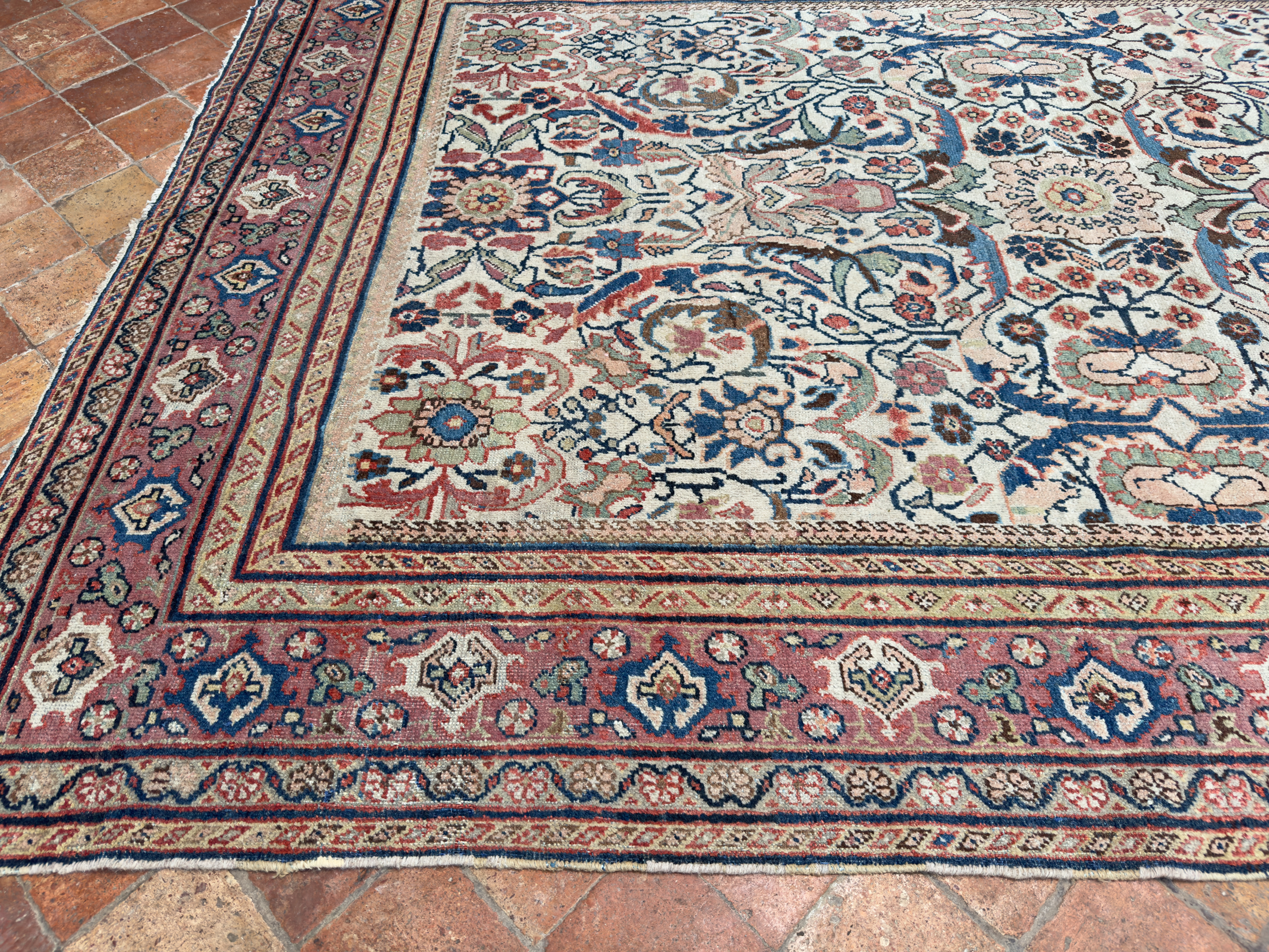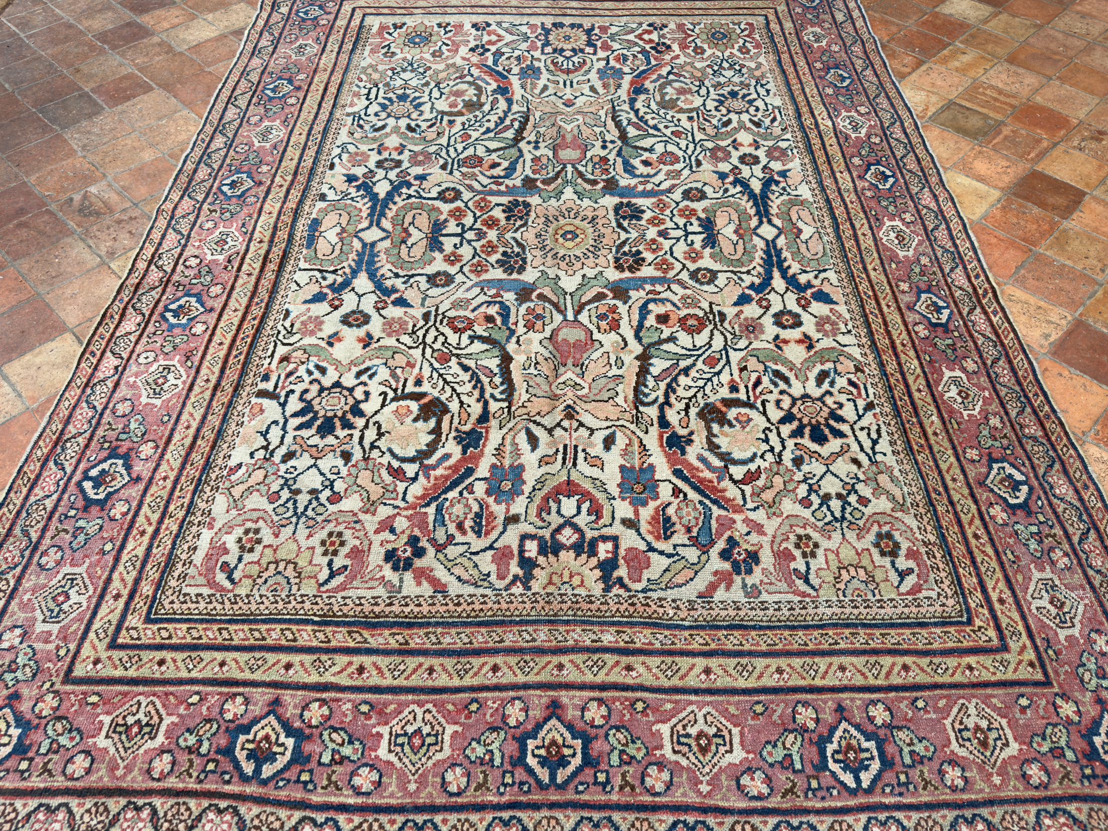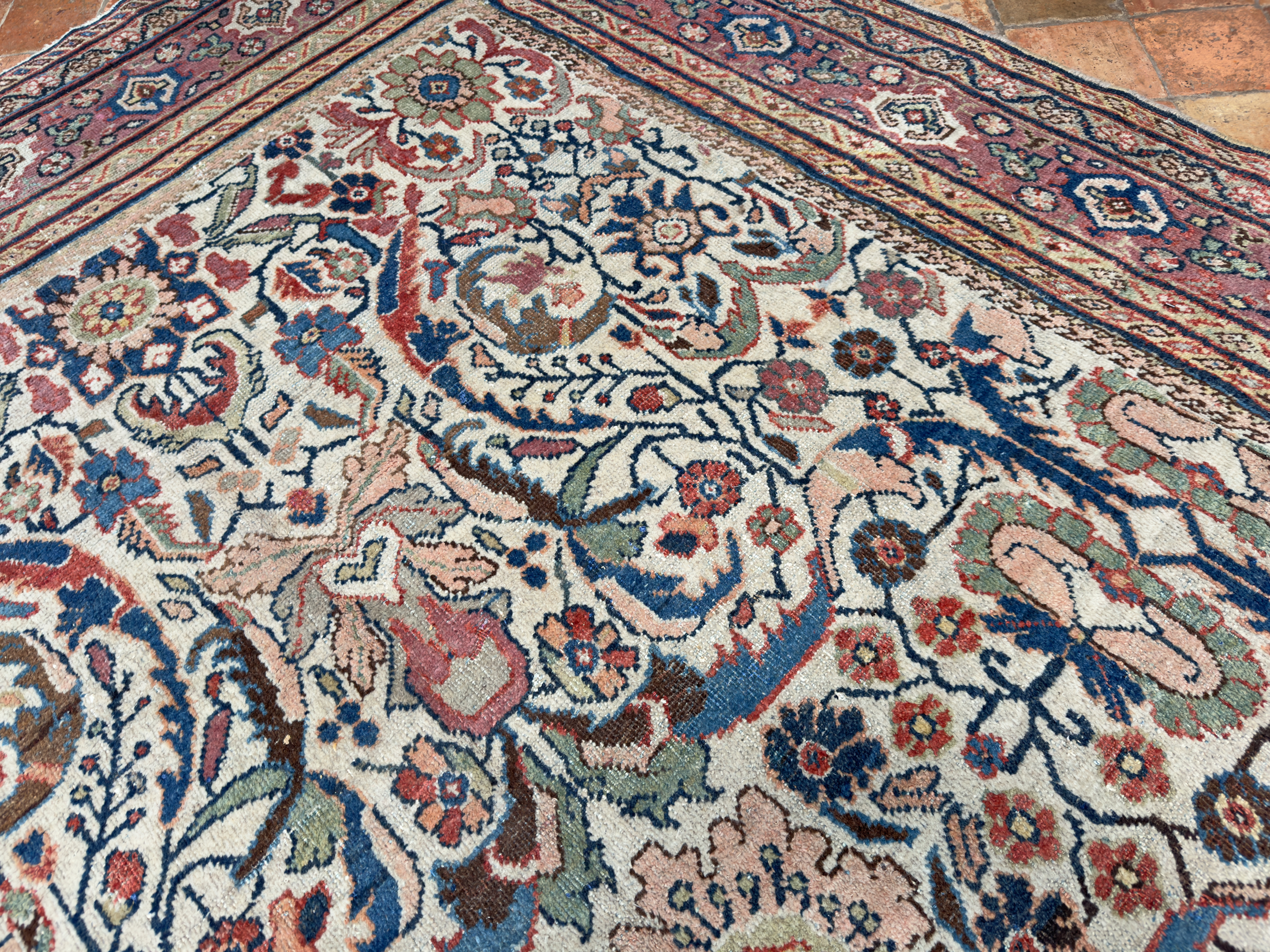 We love to help customers and interior designers source the ideal carpet for a room, if this beautiful antique Mahal carpet is of interest please contact us to arrange a time to view it in-situ or at our barn showroom in Crondall, Surrey.