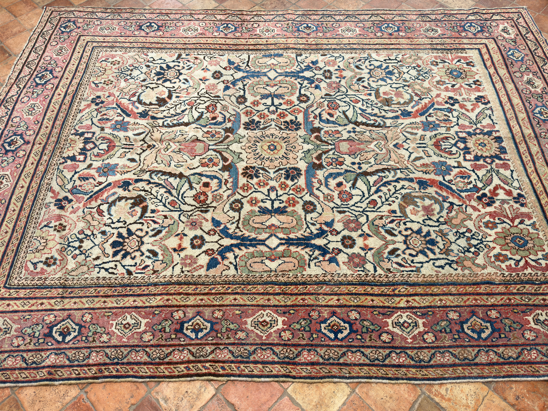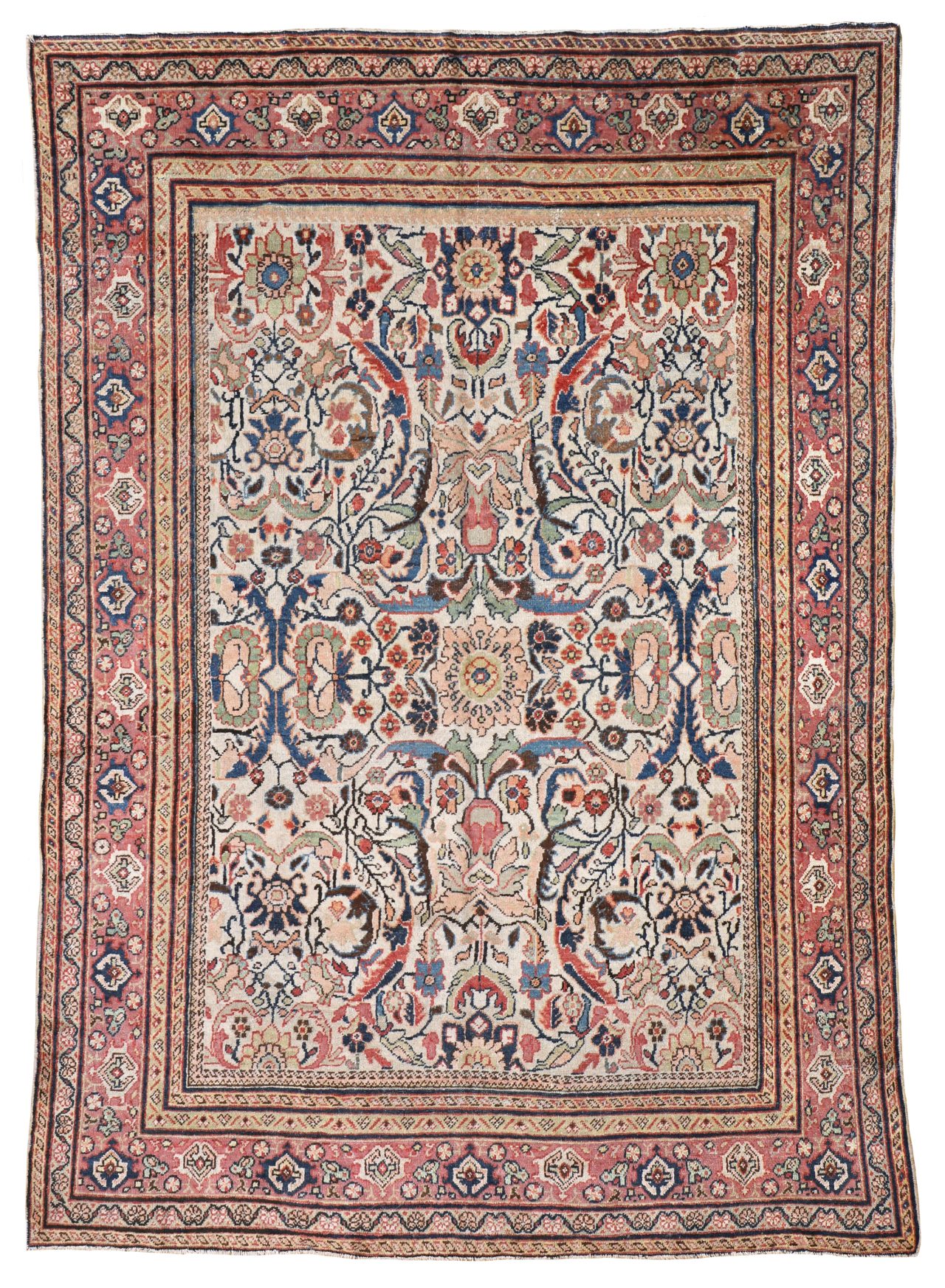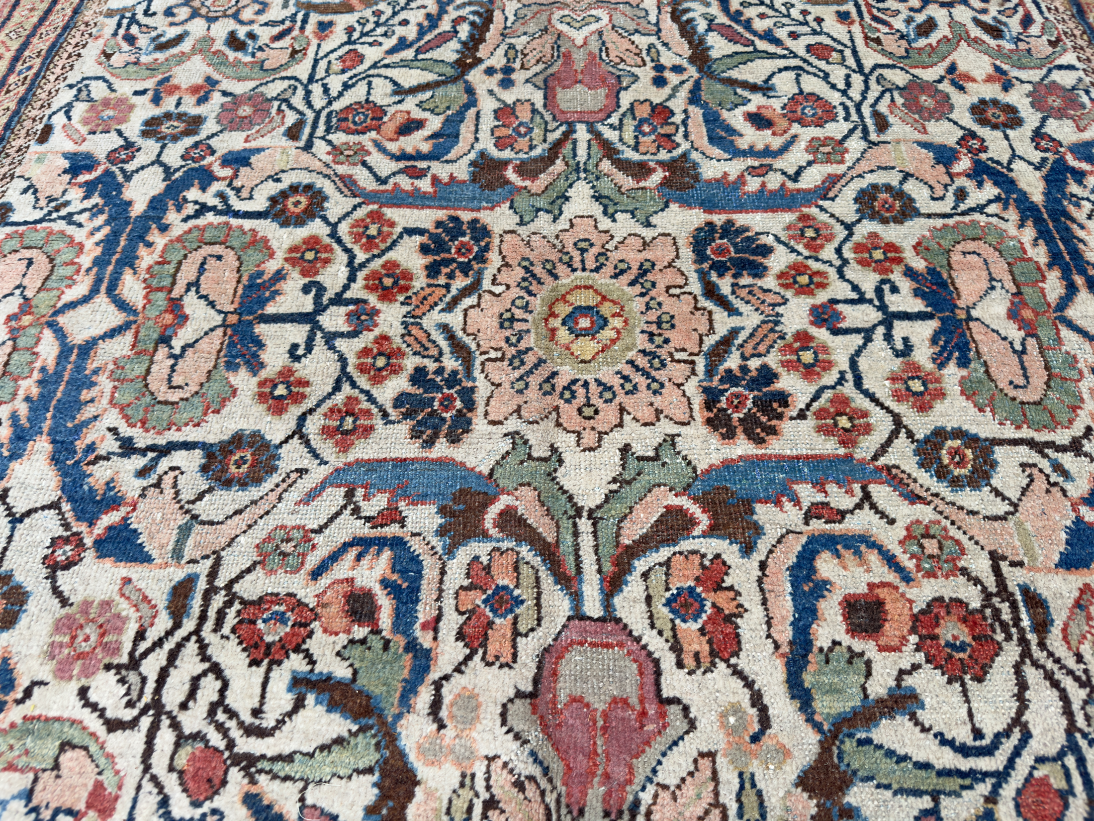 Mahal carpets were produced in Sultanabad, Persia which is now Arak in the center of Iran. Mahal and Sultanabad rugs were made in the same area as the earliest Fereghans and Sarouks, but they are very different in form and structure. Floral motifs and overall designs of vine scrolls and palmettes remain consistent with the influences of western color palettes and are all characteristics of Ziegler carpets.