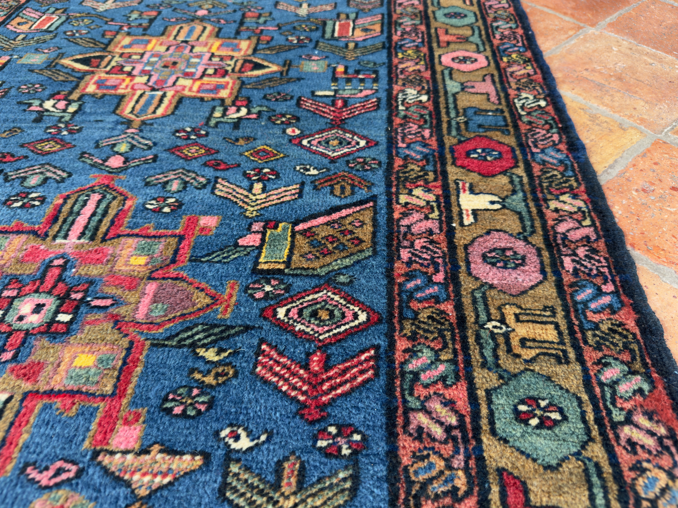 North West Persian origin, this type is impossible to name to particular tribe or village, they use several attributes from the Caucasus (the colours in particular) along with bold motifs similar to Persian decorative carpets such as Ziegler and Sultanabad. The one thing we can be sure is that the weave is of North Persian origin going into Azerbaijan, this paragraph below is from a reputable carpet publication, it helps clarify the sometimes difficult task of specifying an exact weaving area.