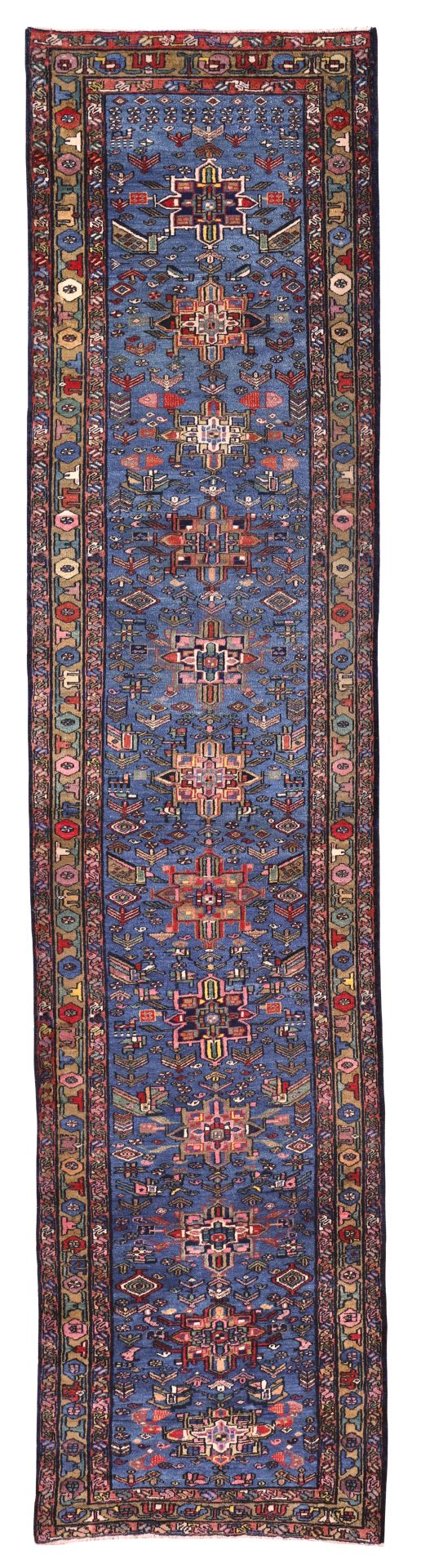 A very beautiful Antique Karaja runner woven with a stunning pale blue background, full of warm reds, greens, soft pinks and tribal motifs.
