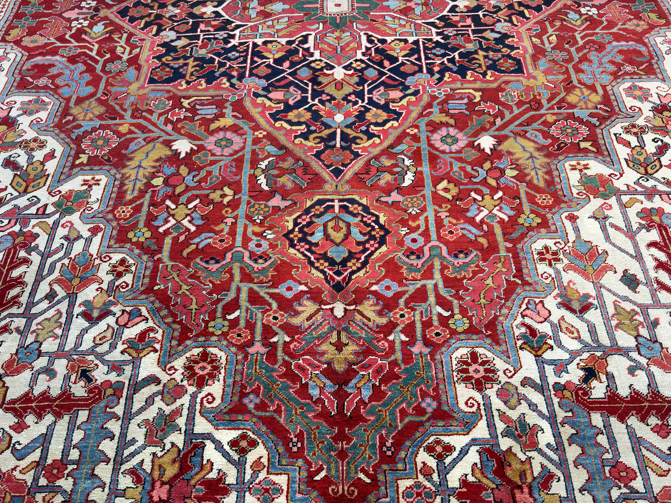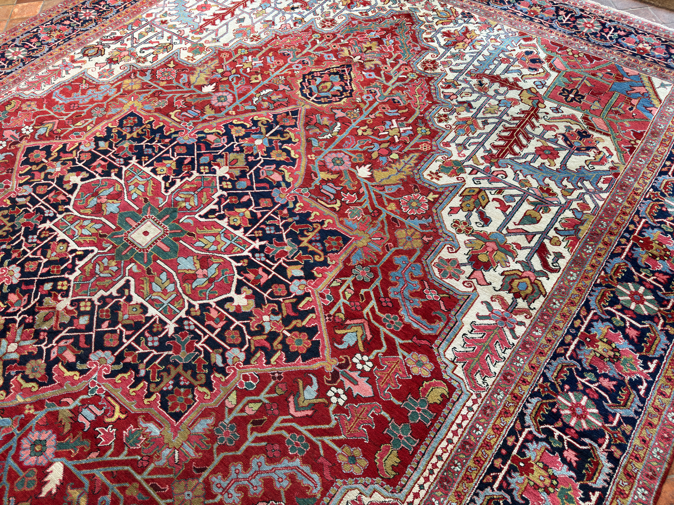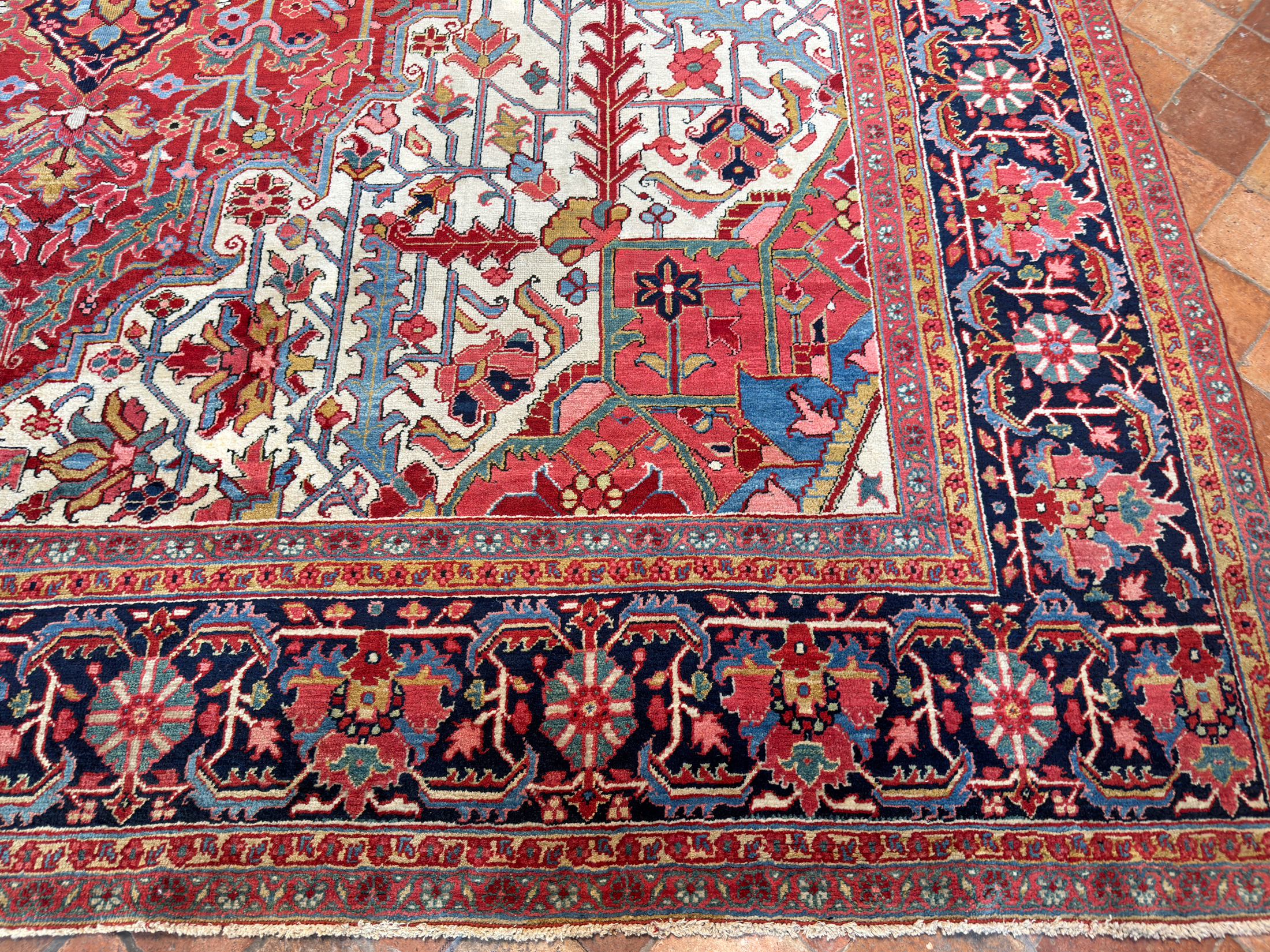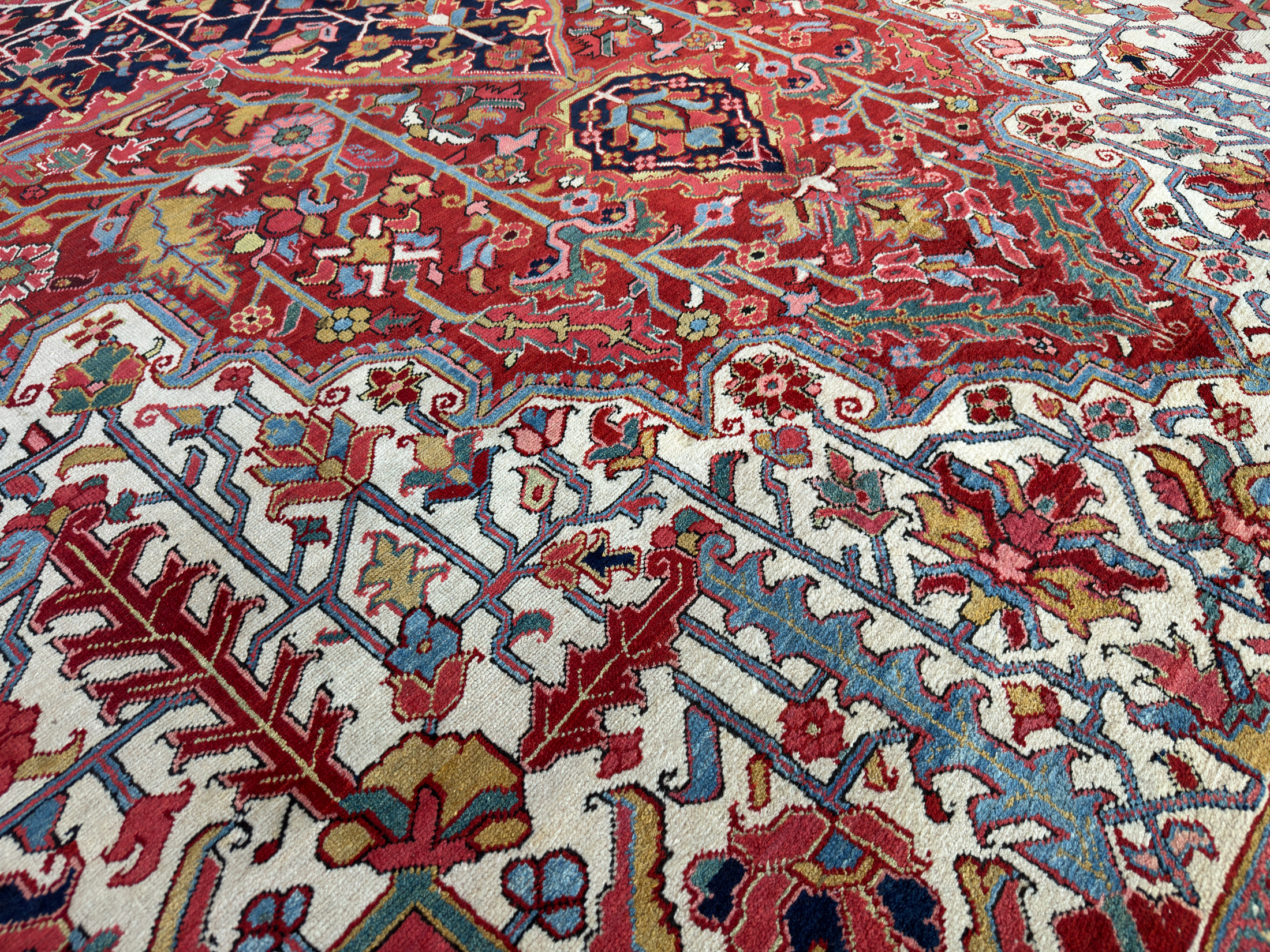 An amazing large antique Heriz carpet, woven around 120 years ago and full of beautiful rich natural dyes we would expect from this fabulous weaving area in the north of Persia. We love Heriz when they have the four white corner spandrels, this always lifts the palette and allows the pale blues, greens and golden yellows to shine and enhance the composition of the carpet. With large scale leaves and floral motifs, geometric in style, this Heriz carpet has been drawn with expertise and woven with skill from the best weavers around the turn of the 20th century.