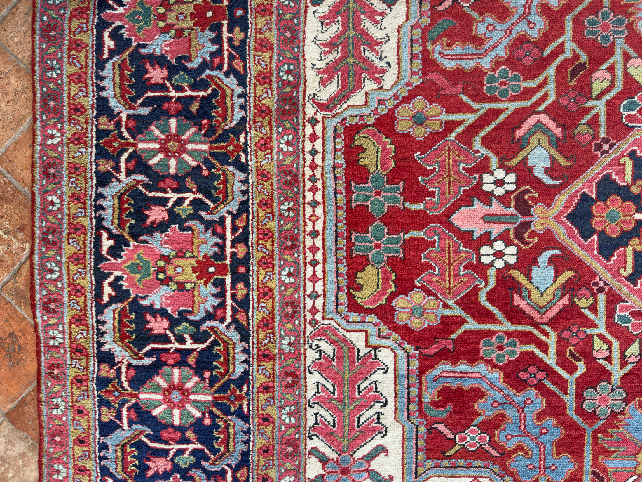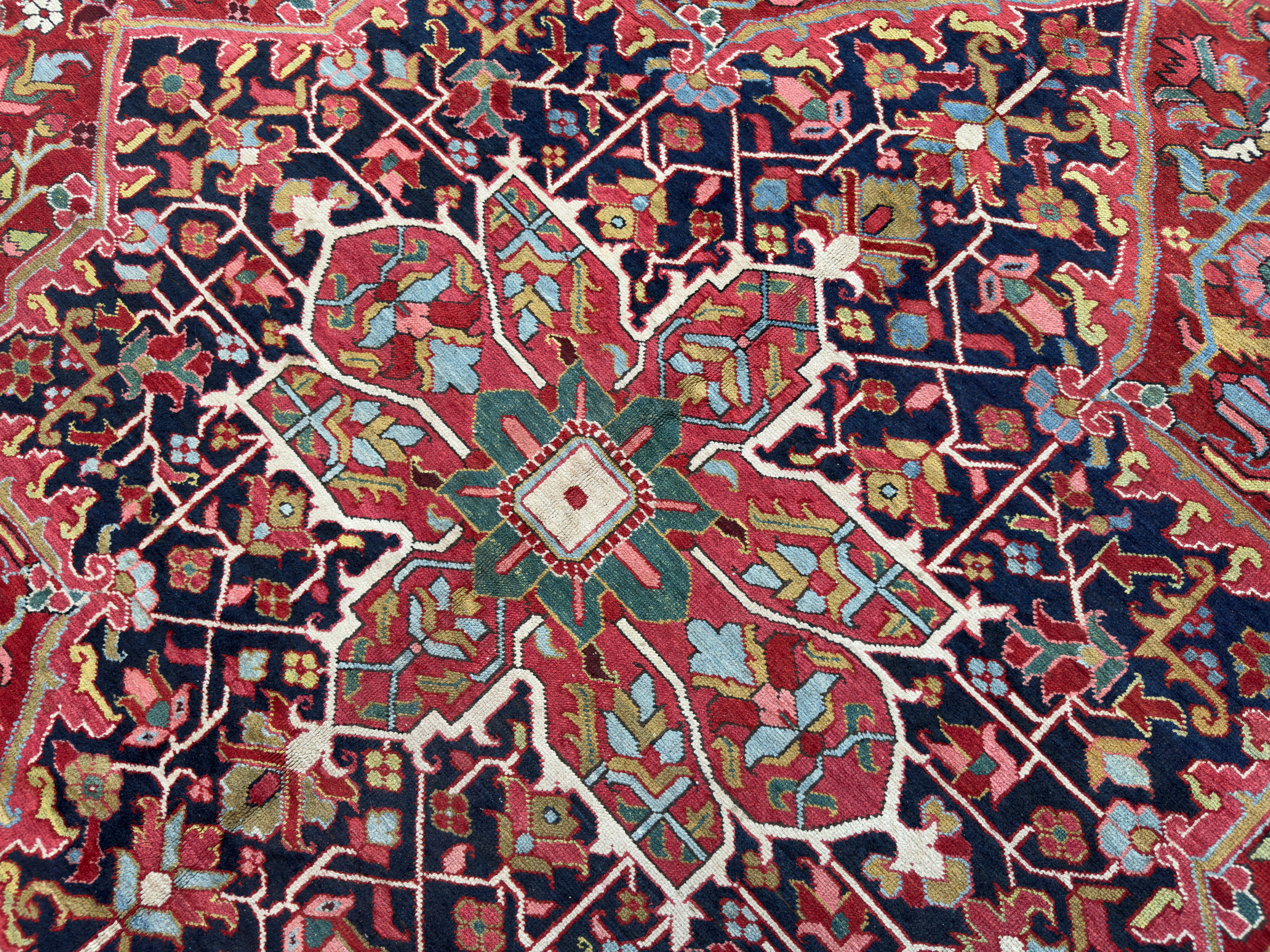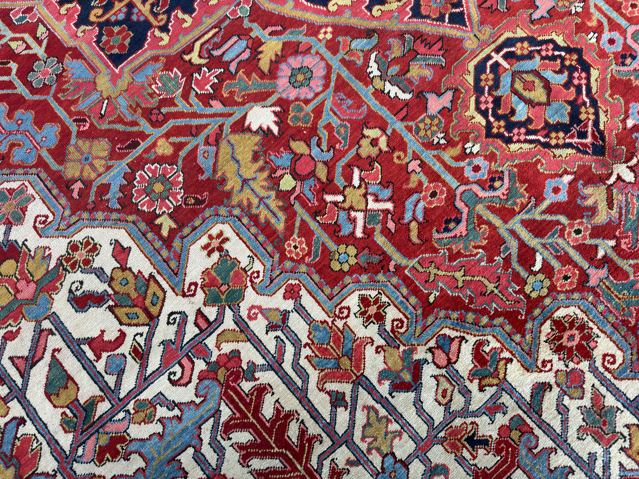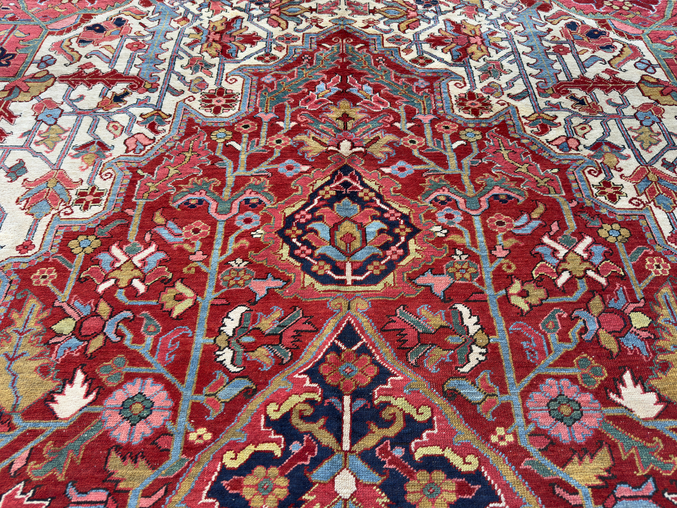 An amazing large antique Heriz carpet, woven around 120 years ago and full of beautiful rich natural dyes we would expect from this fabulous weaving area in the north of Persia. We love Heriz when they have the four white corner spandrels, this always lifts the palette and allows the pale blues, greens and golden yellows to shine and enhance the composition of the carpet. With large scale leaves and floral motifs, geometric in style, this Heriz carpet has been drawn with expertise and woven with skill from the best weavers around the turn of the 20th century.