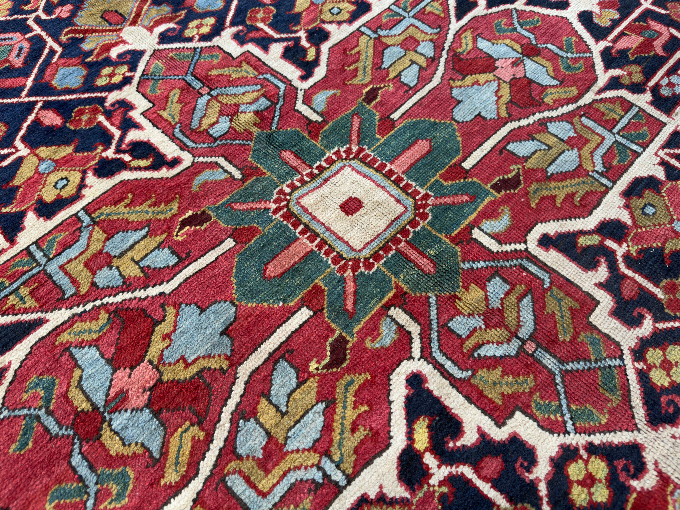 The reason Heriz rugs are so tough is that Mount Sabalan is located close to Heriz and sits on a major deposit of copper. Traces of copper in the drinking water for the sheep produces high quality wool that is far more resilient than wool from other areas.