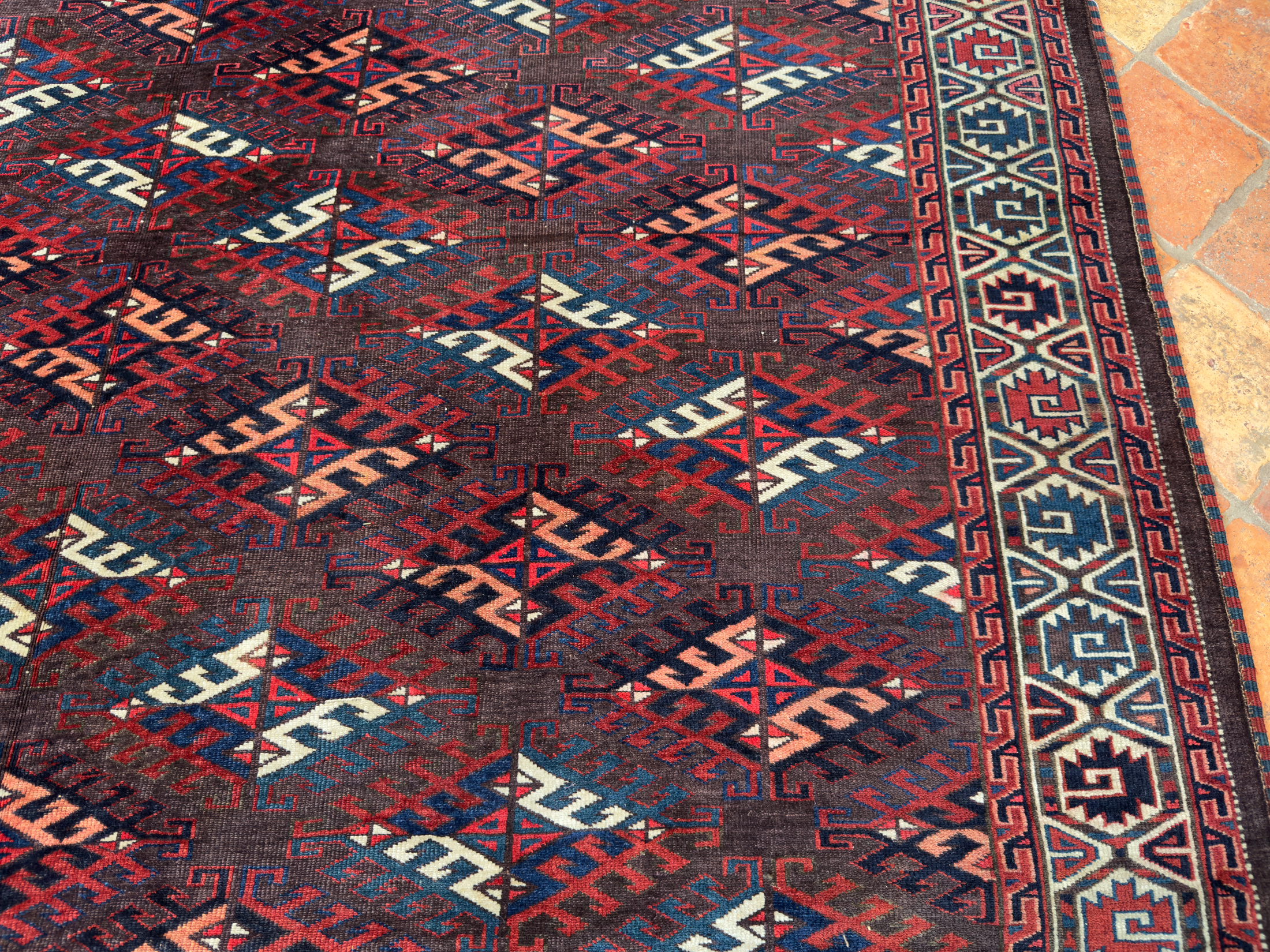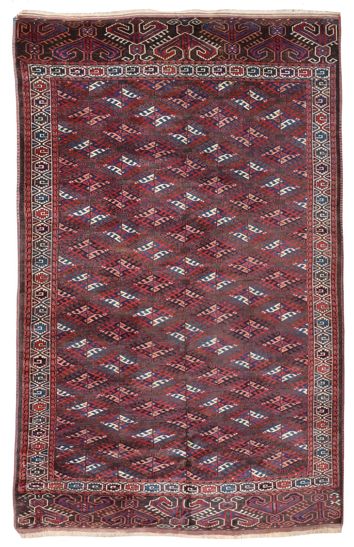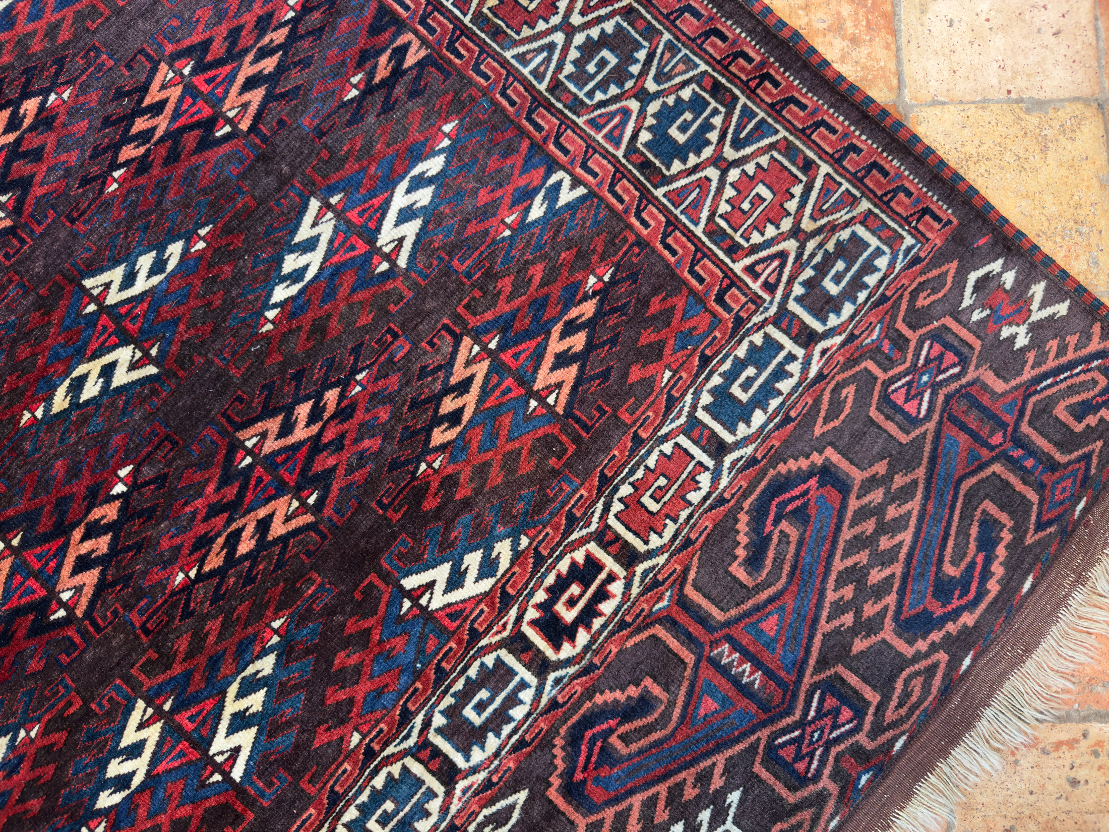 Yomud also spelt Yomut is a large Turkmen tribe group, and one of the five major tribes of Turkmenistan.  Their Gul motif includes rhombuses and octagons with serrated edges, and are distinctive against the other Tekke tribes.  Dyes consist of deep chocolate browns, reds and some green and blues.  They are often finer than most Turkmen pieces, and this Yomud carpet is very fine and has a tight weave and in good condition.