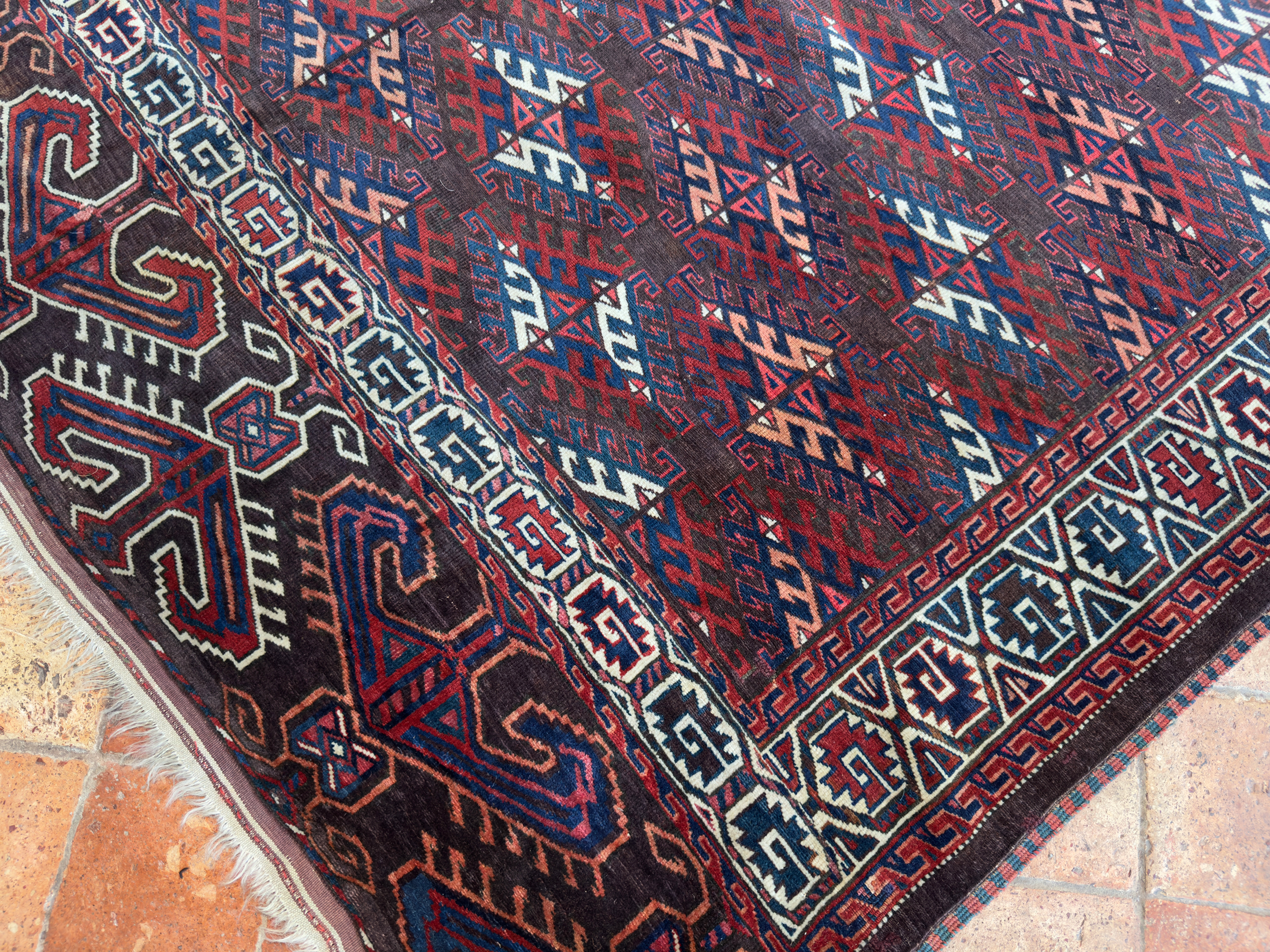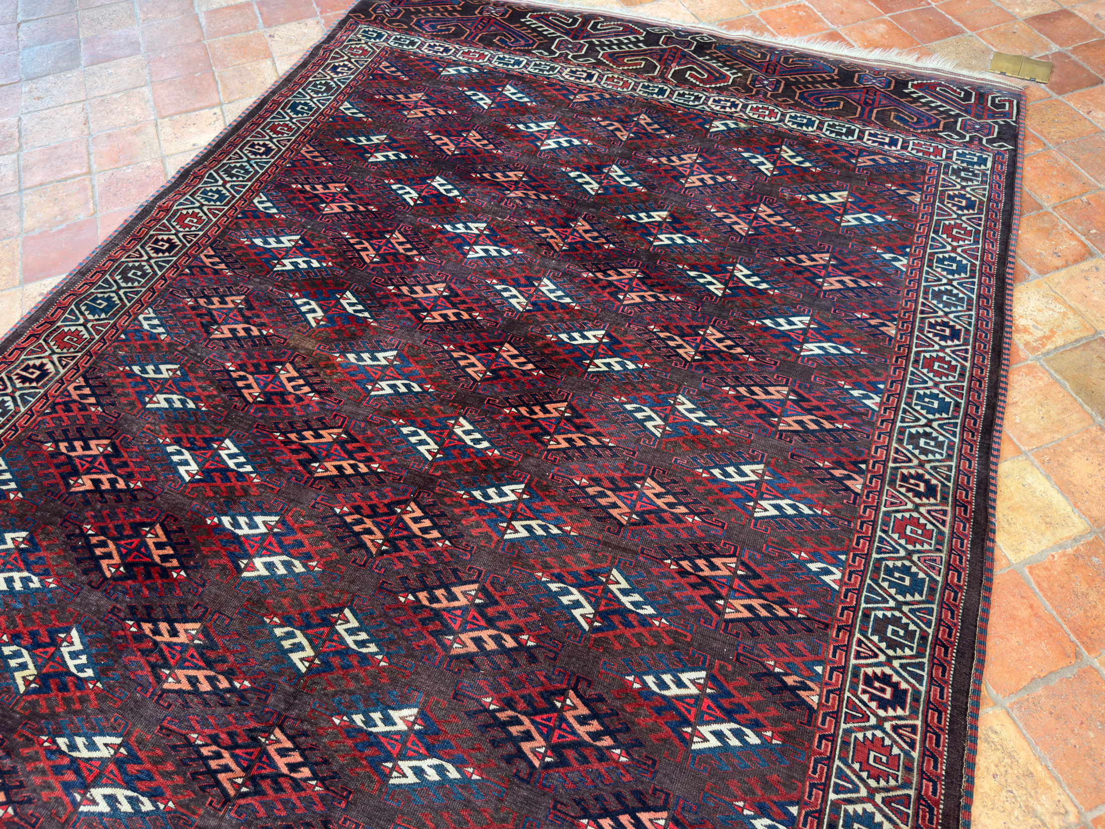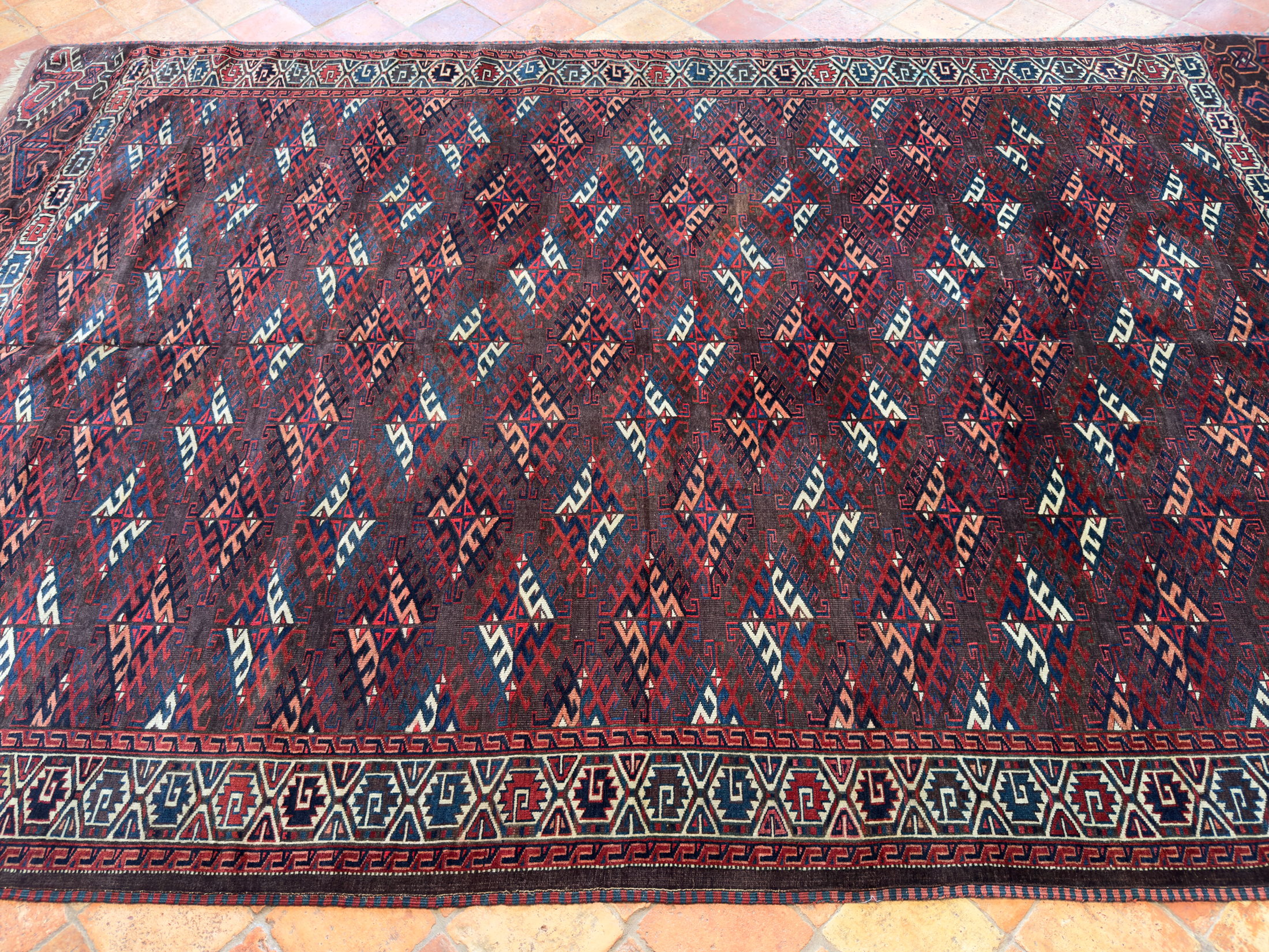 Yomud also spelt Yomut is a large Turkmen tribe group, and one of the five major tribes of Turkmenistan.  Their Gul motif includes rhombuses and octagons with serrated edges, and are distinctive against the other Tekke tribes.  Dyes consist of deep chocolate browns, reds and some green and blues.  They are often finer than most Turkmen pieces, and this Yomud carpet is very fine and has a tight weave and in good condition.