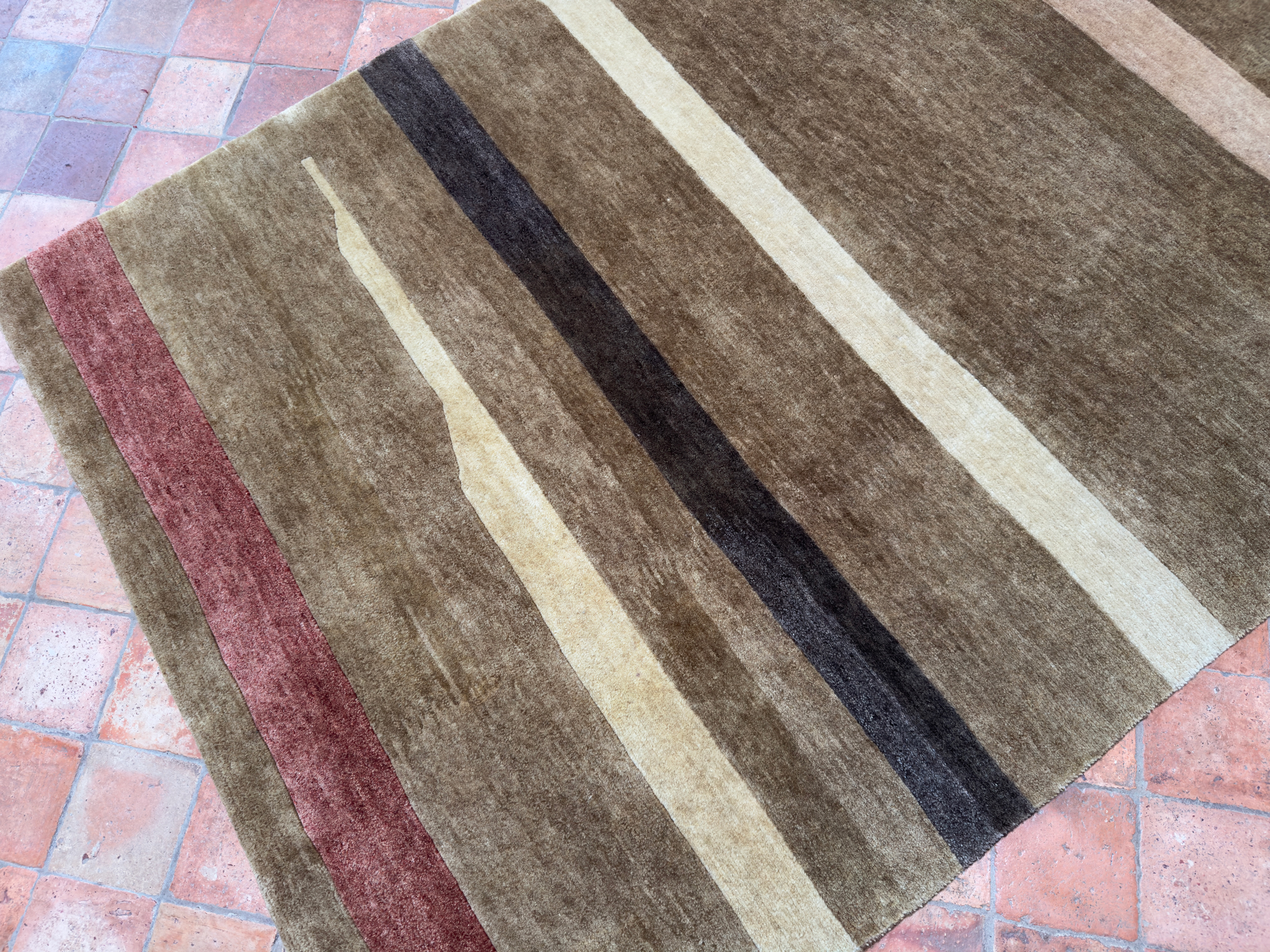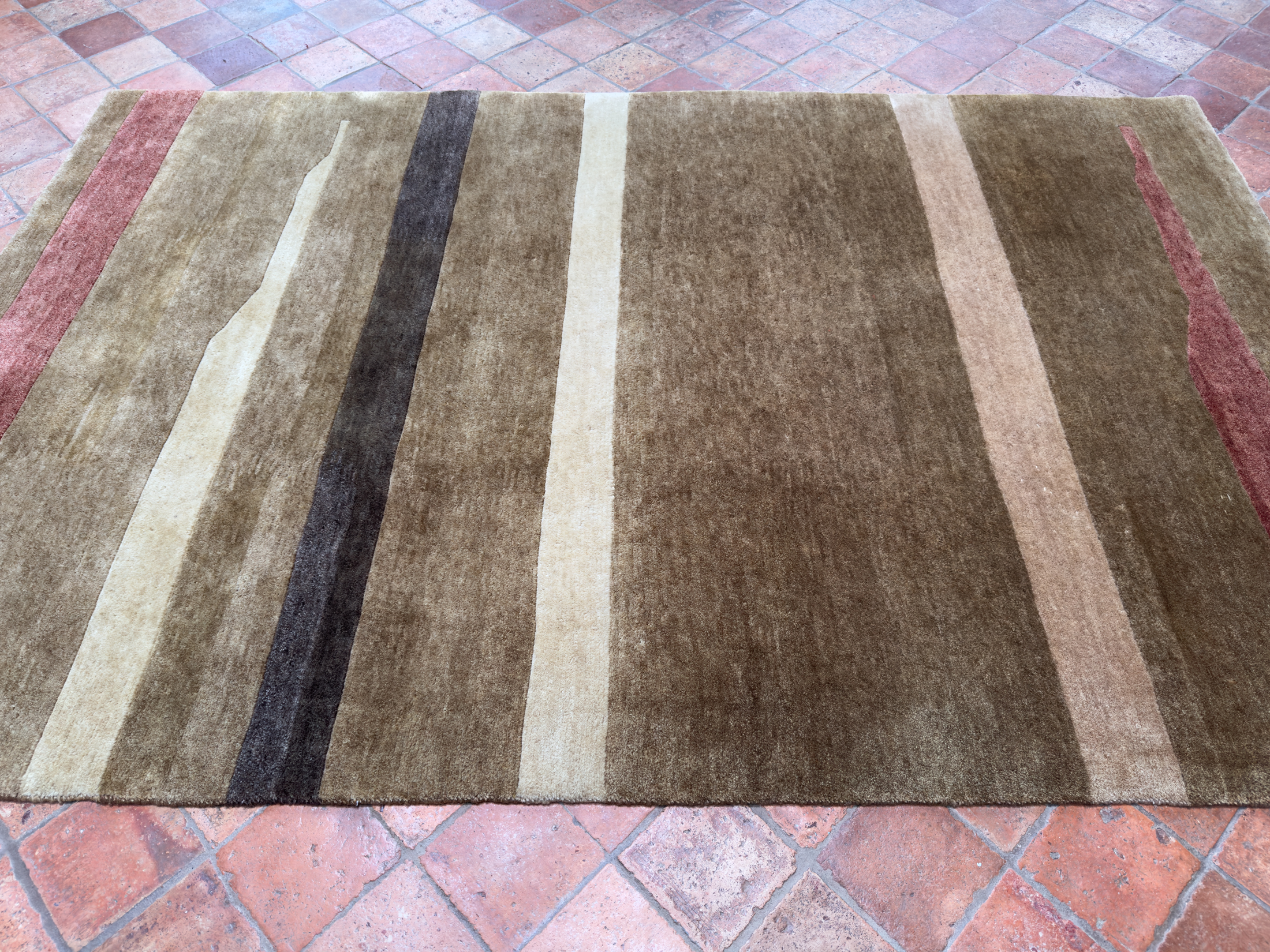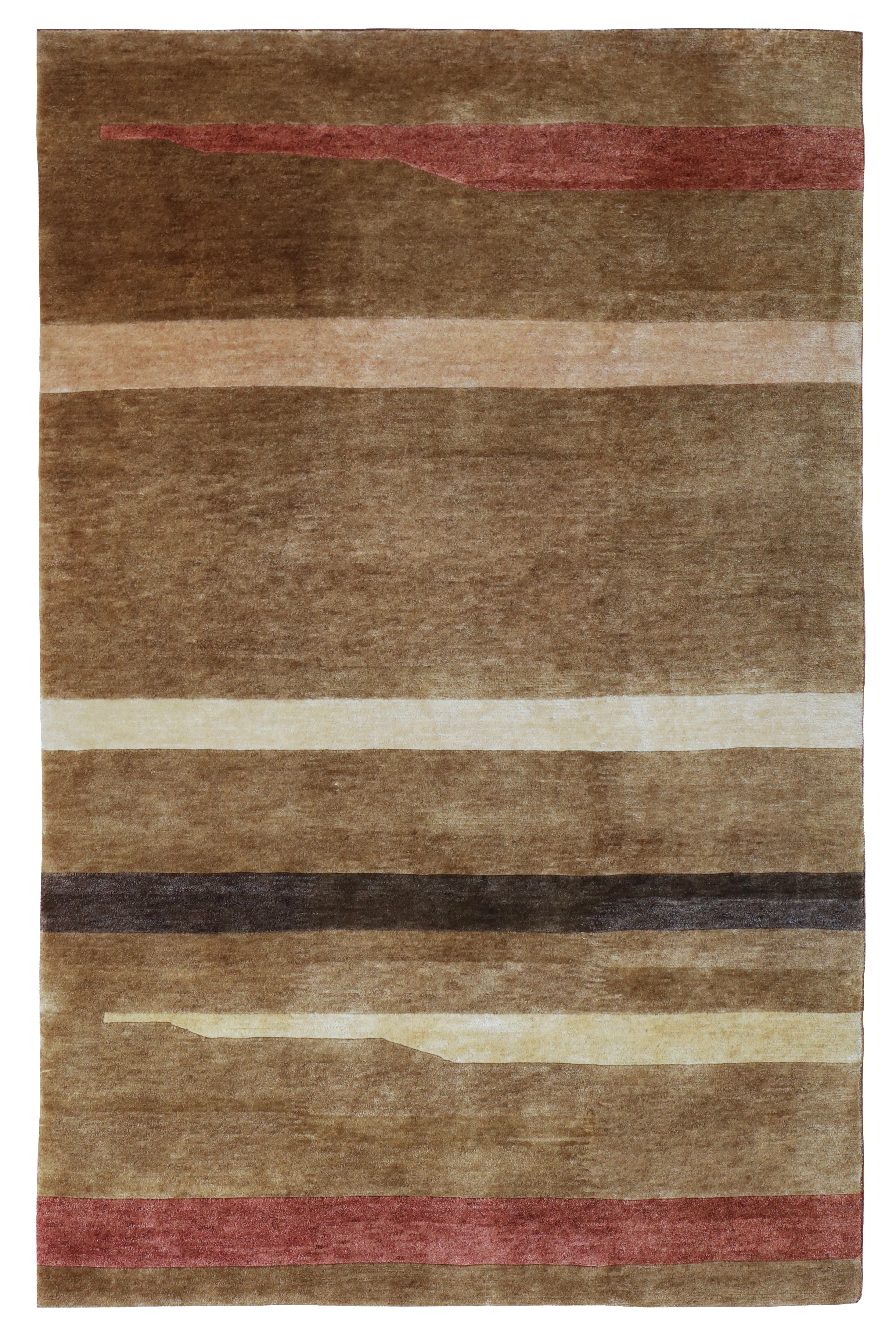This contemporary rug was hand-woven using hand-spun wool and soft natural dyes, the pile is lush and thick on this contemporary rug all hand woven in India.  Using soft brown, reds, cream and chocolate brown abstract stripes running across the rug.