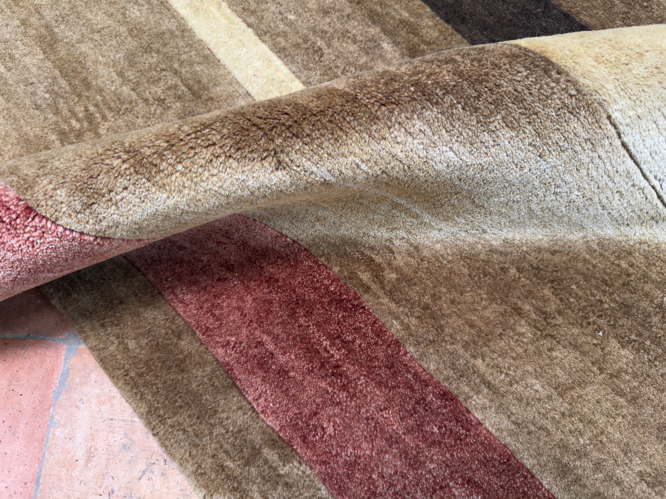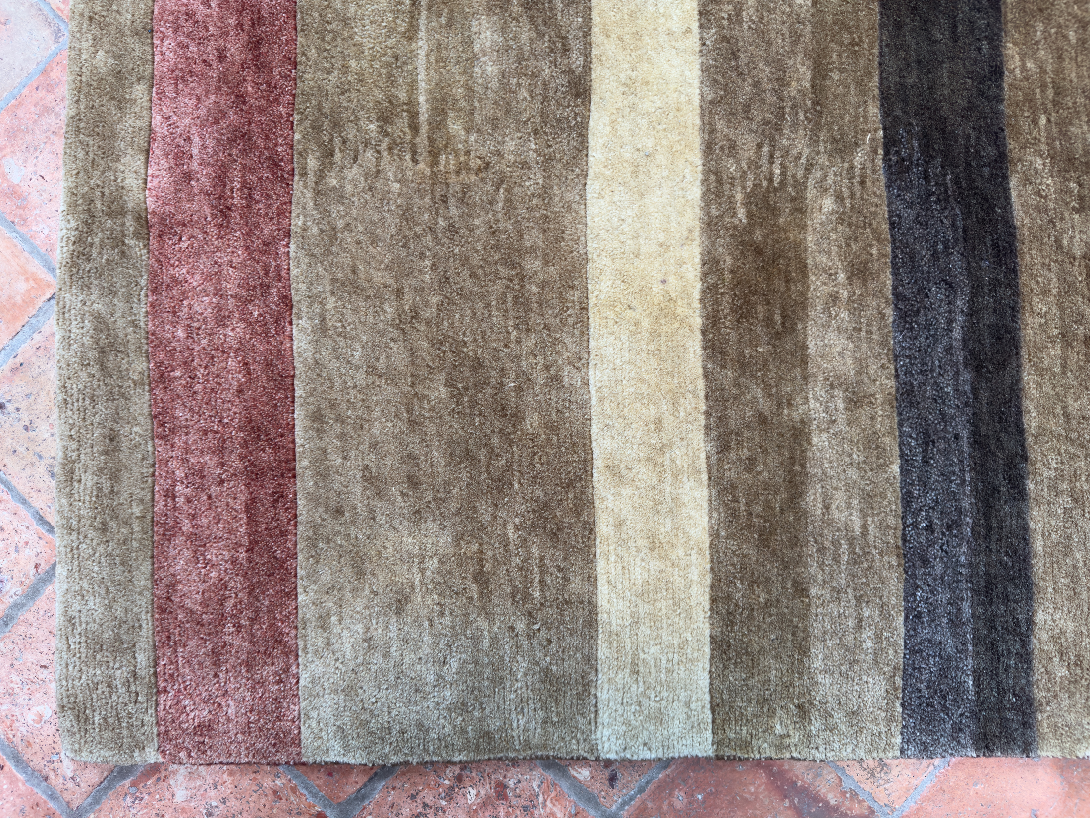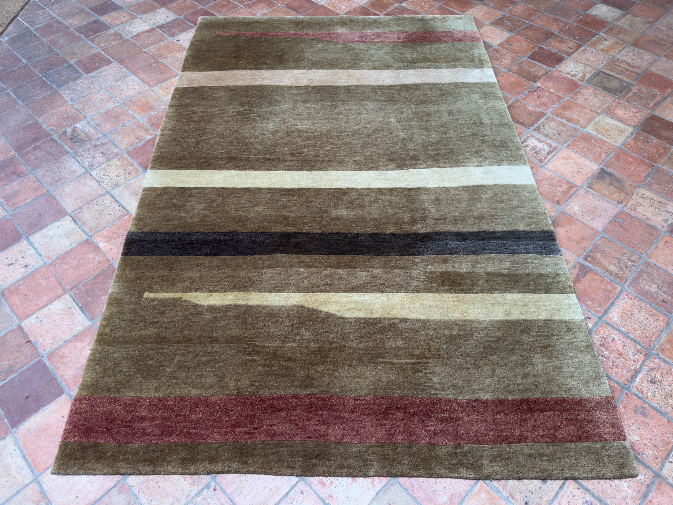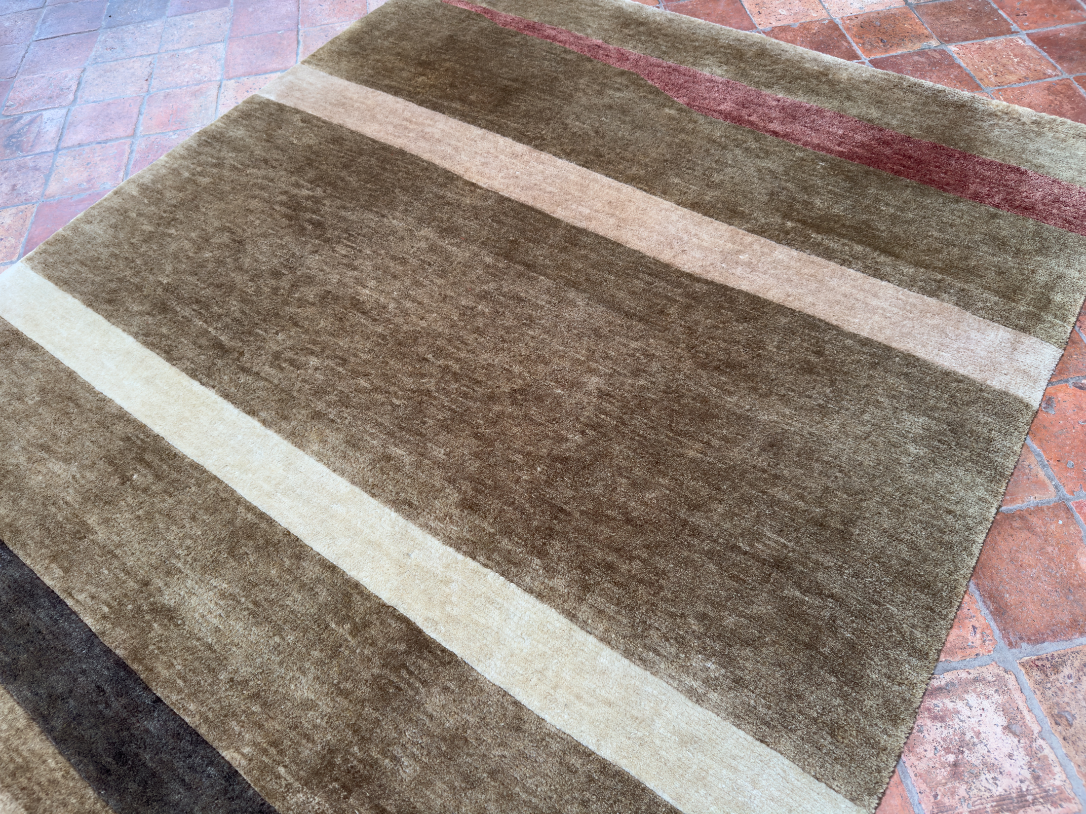 This contemporary rug was hand-woven using hand-spun wool and soft natural dyes, the pile is lush and thick on this contemporary rug all hand woven in India.  Using soft brown, reds, cream and chocolate brown abstract stripes running across the rug.