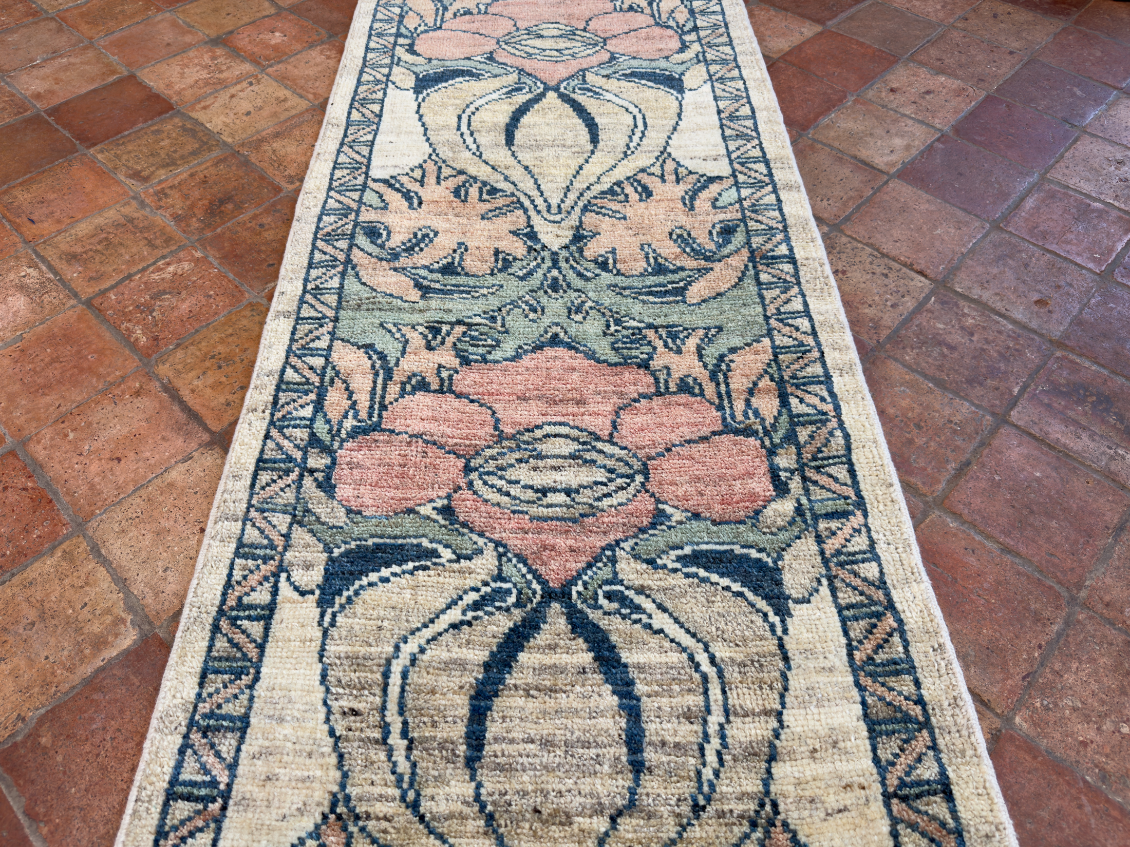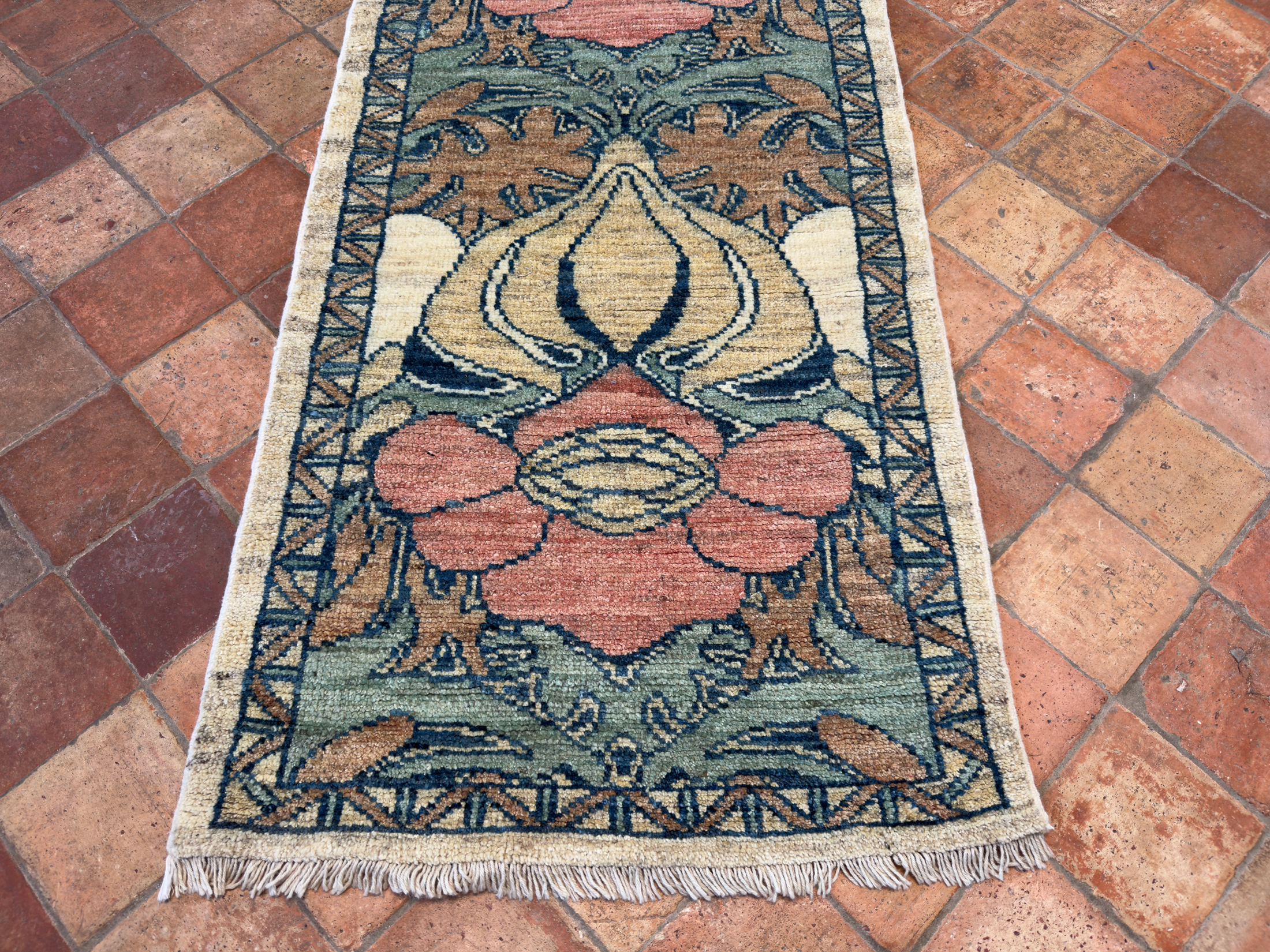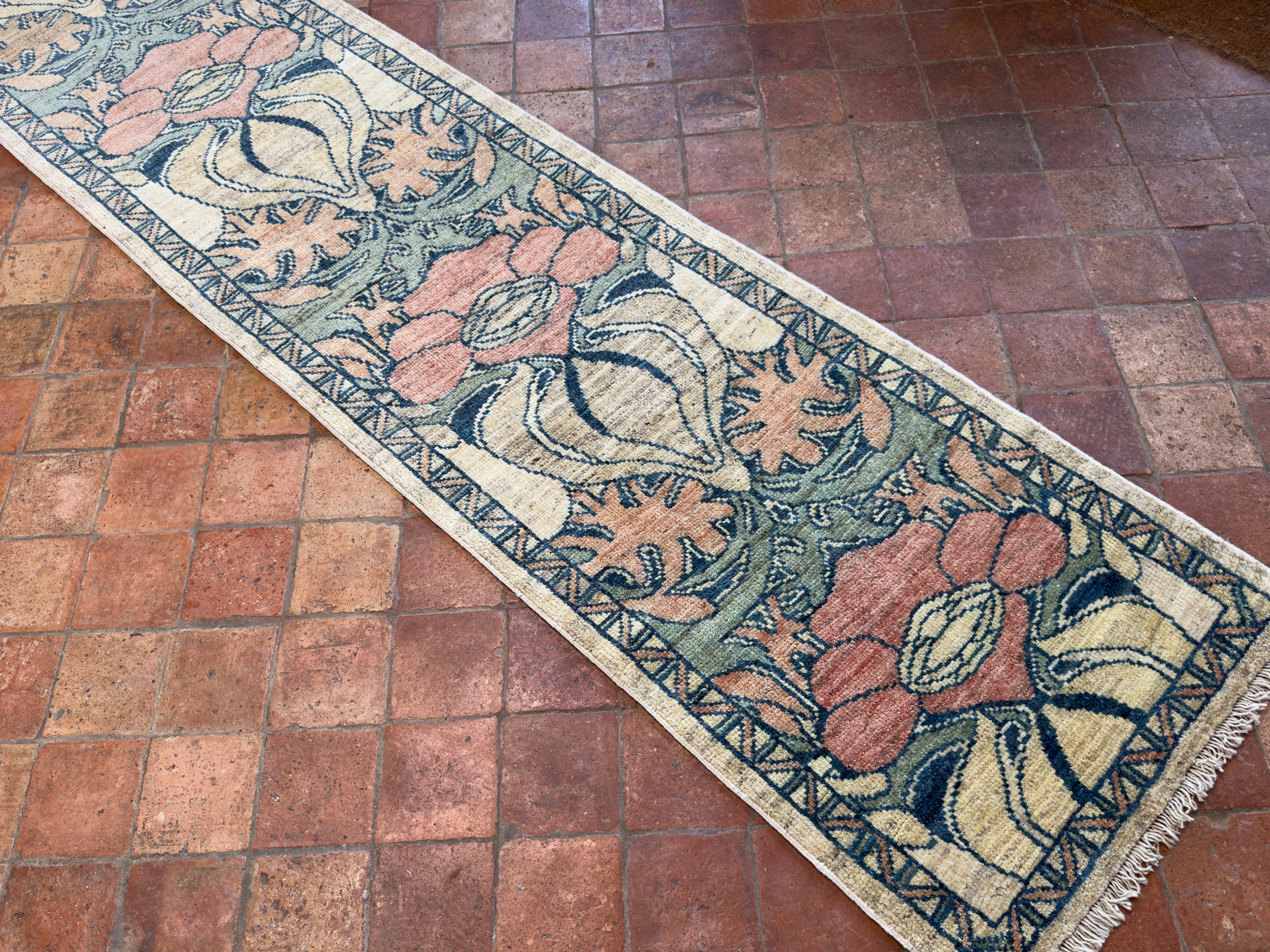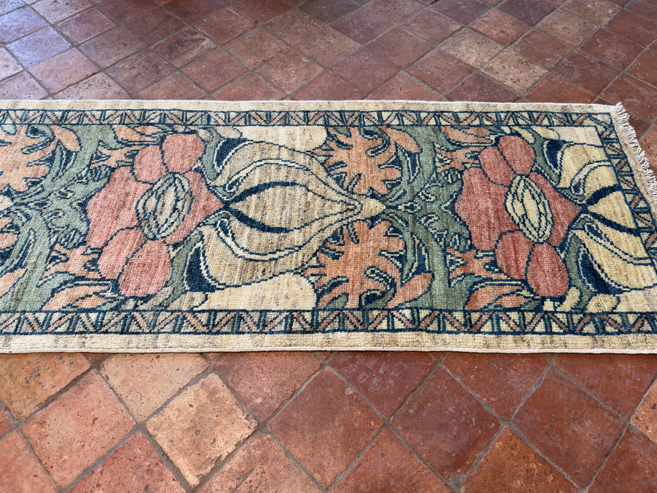 A wonderful contemporary runner using an arts and craft design, that would enhance any corridor or hall. Hand-woven with all natural dyes and soft wool, using light tones of green, teal blues, soft pinks and off white colours.