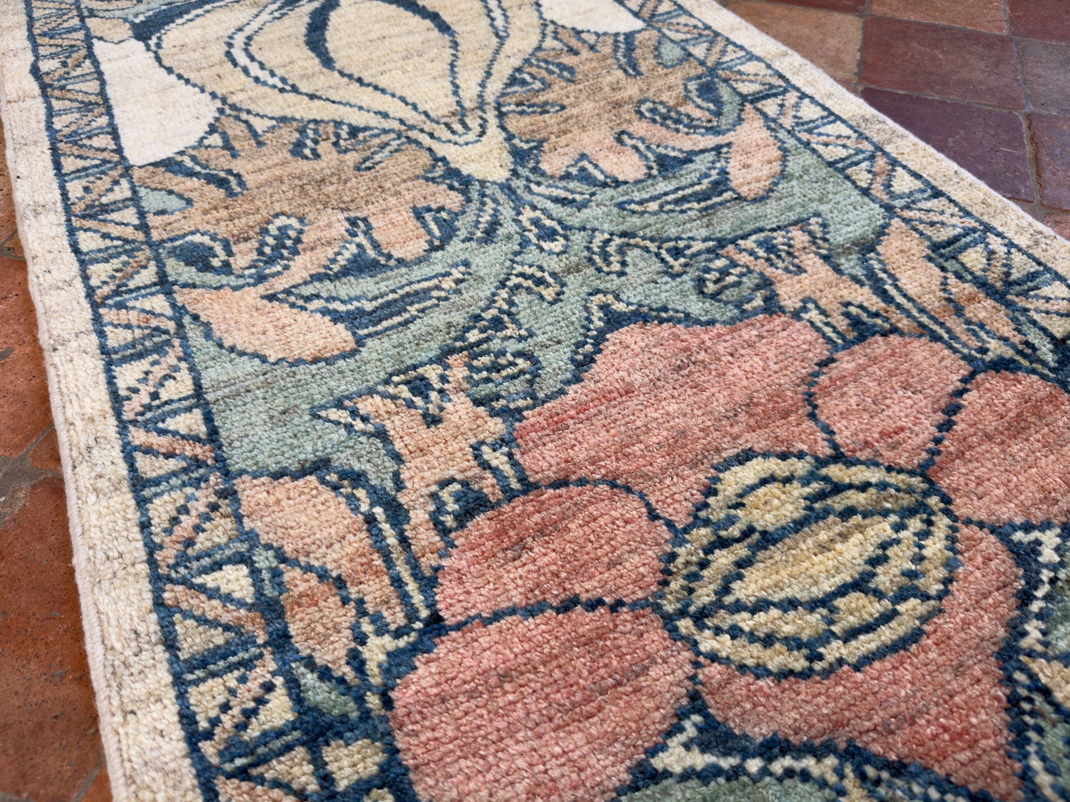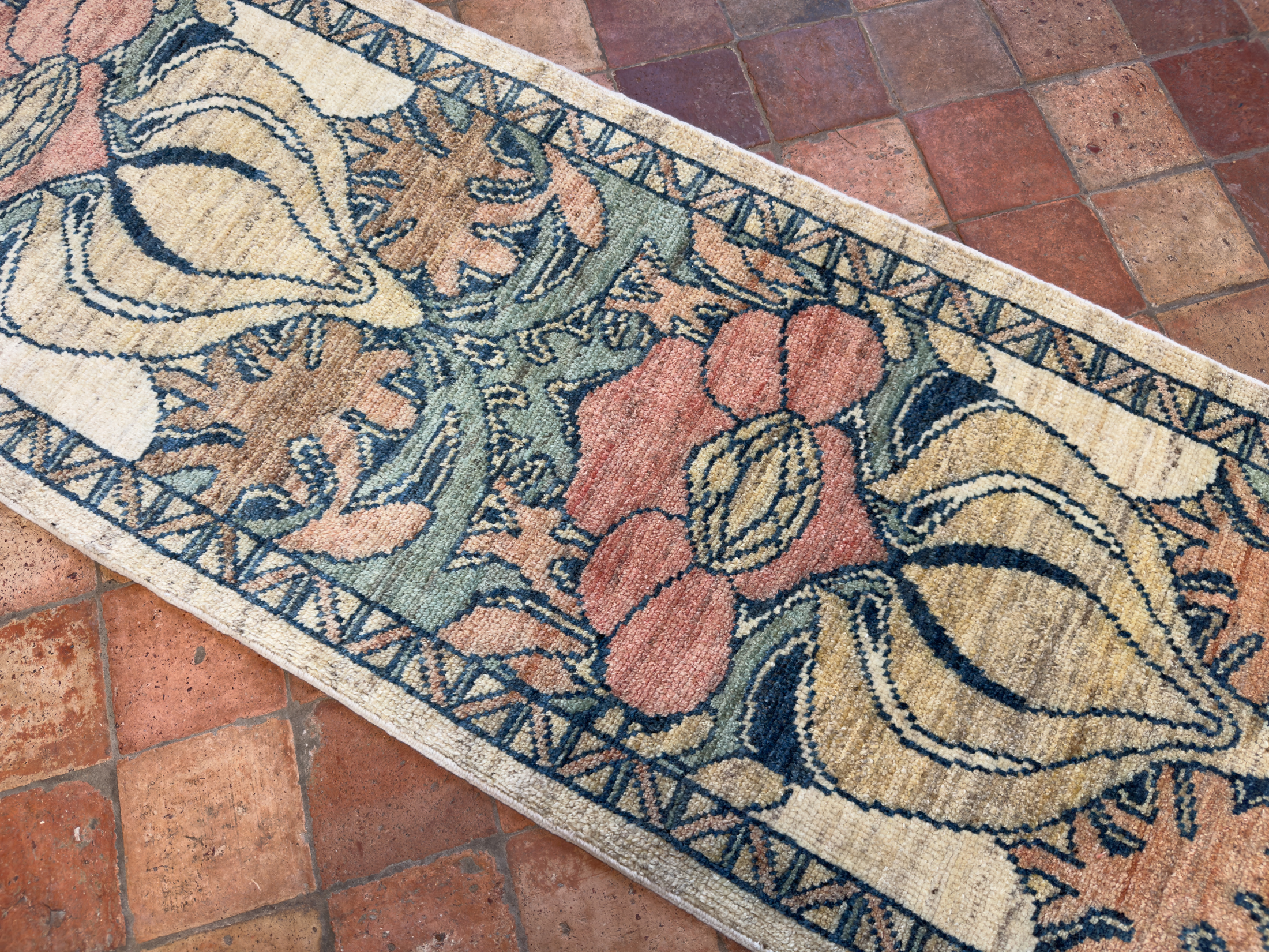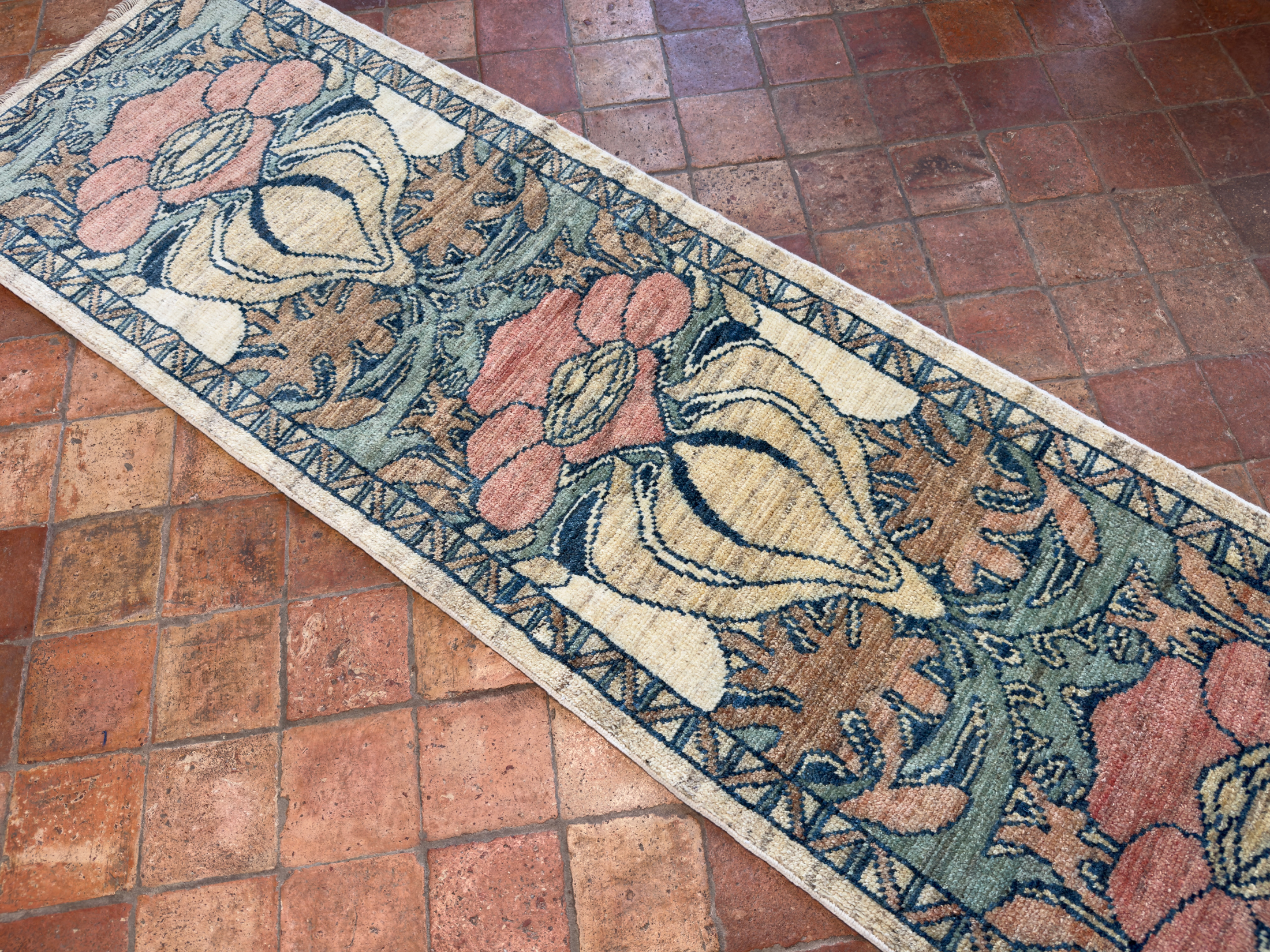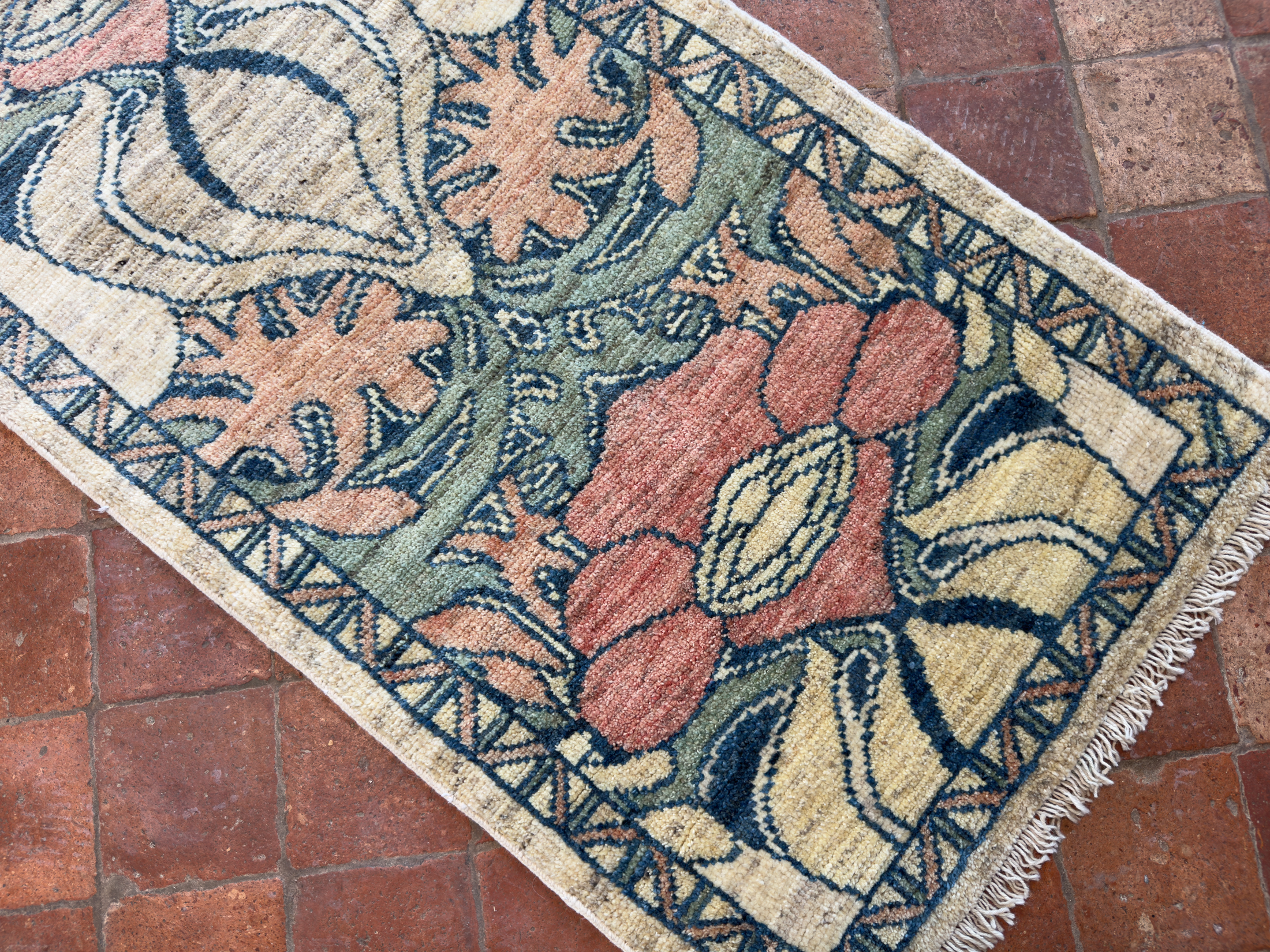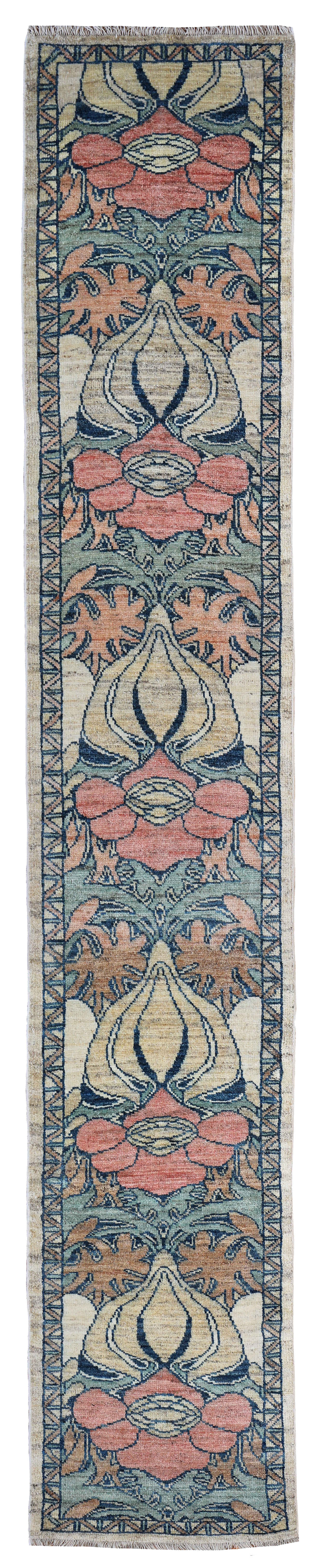 A wonderful contemporary runner using an arts and craft design, that would enhance any corridor or hall. Hand-woven with all natural dyes and soft wool, using light tones of green, teal blues, soft pinks and off white colours.