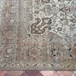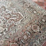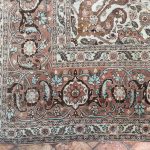 An ancient Tabriz carpet with exquisite faded dyes dating from 1880, this beautiful elegant carpet is around 140 years old. Tabriz of this period would have used the softest of dyes, and muted pinkish, brown tones with a wide variety of dyes which add this immense depth of character to the piece. Some delightful pale blues can be seen in the floral design, connecting vines with a collective of floral patterns and leaves. The large scale flowing border uses a 16th century ‘Herati’ pattern, executed with great precision, the weavers from the city of Tabriz produced some of the finest carpets. This carpet is a rarer design, with no central medallion, allowing it to be placed in a room with ease.