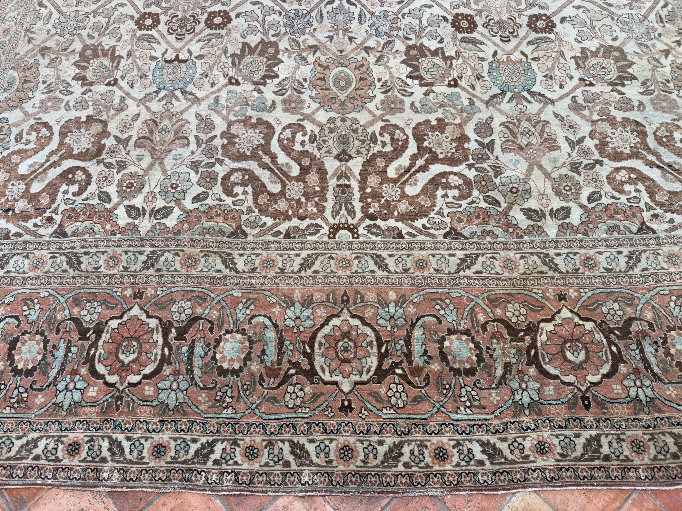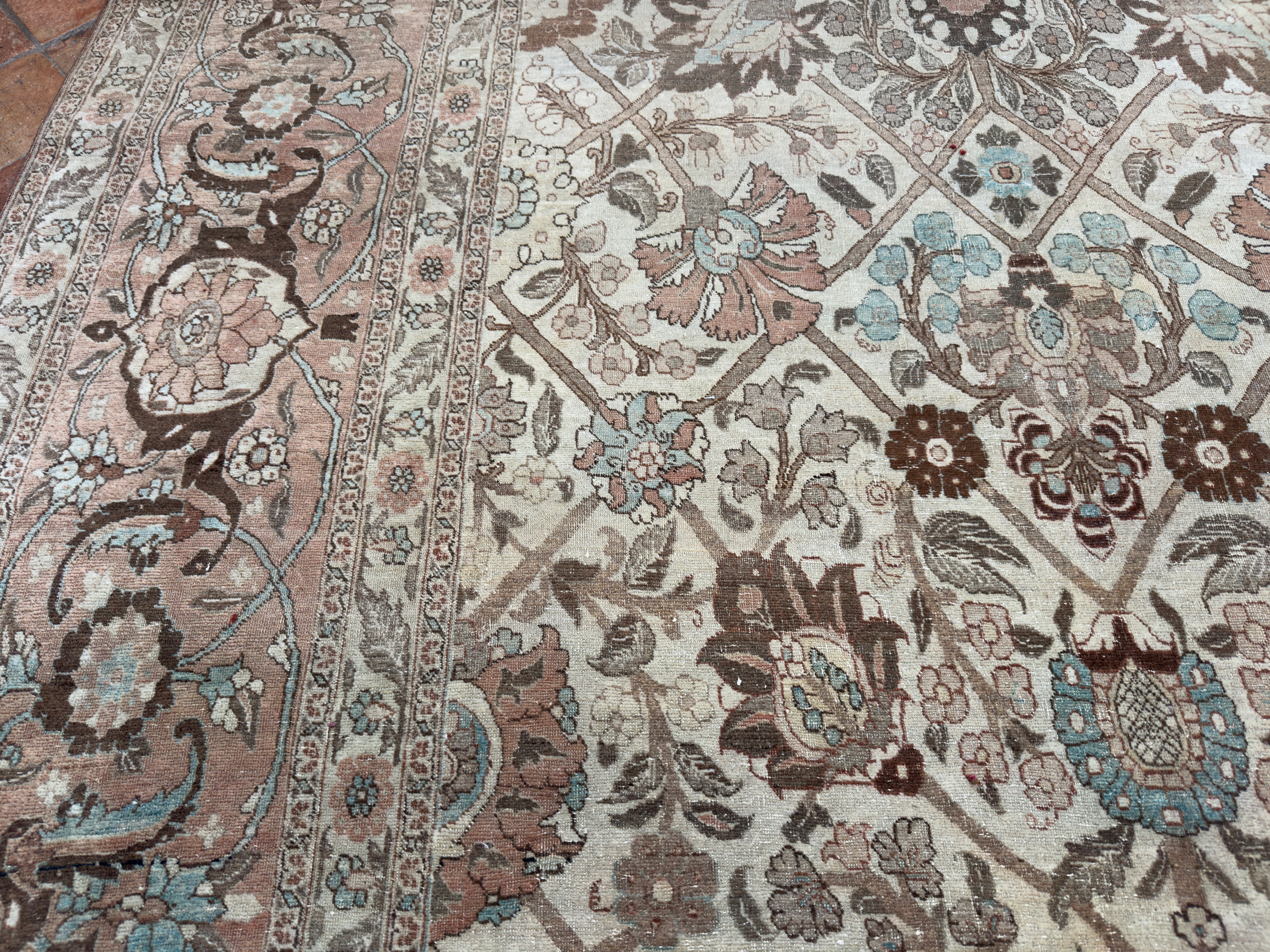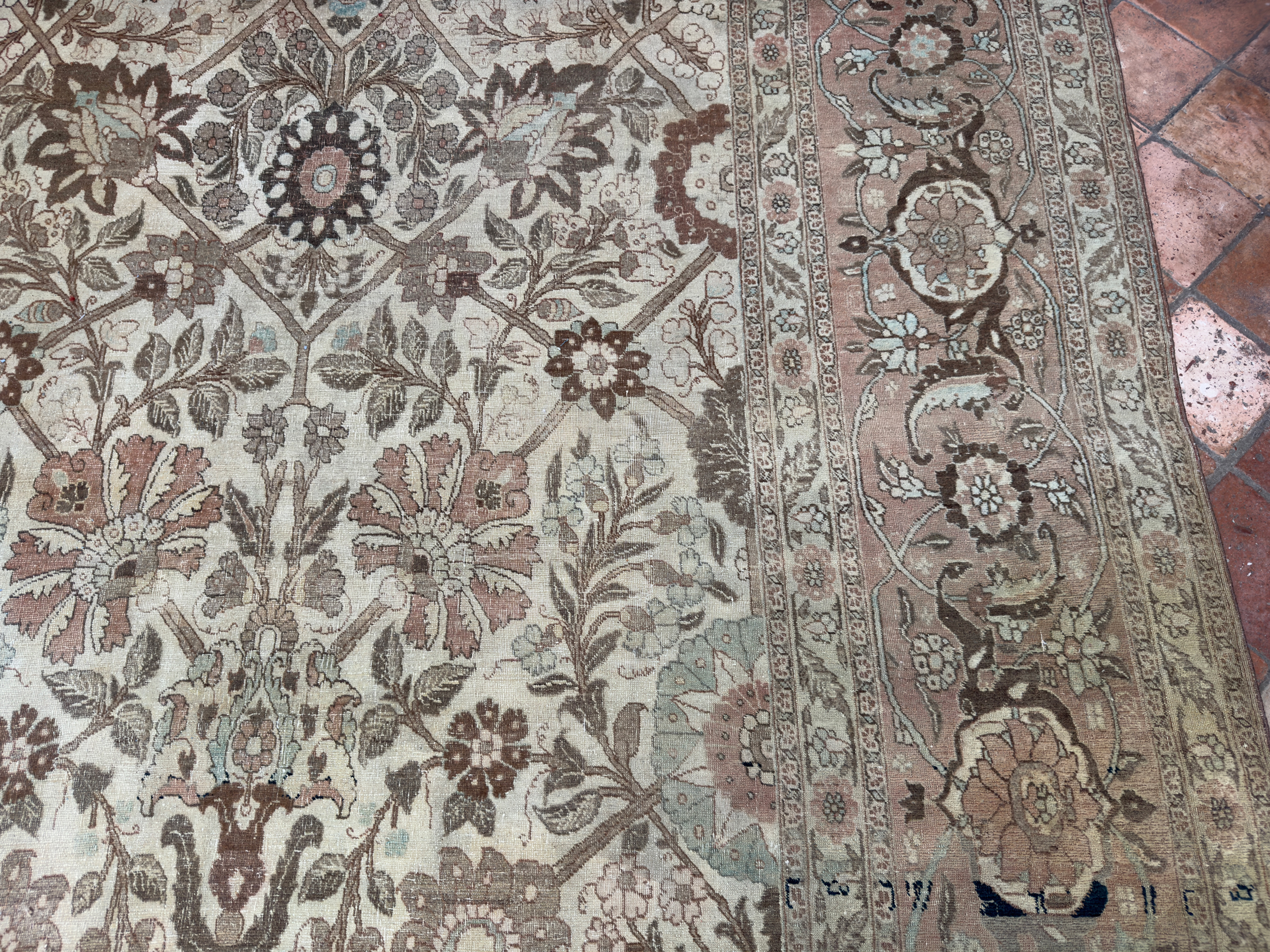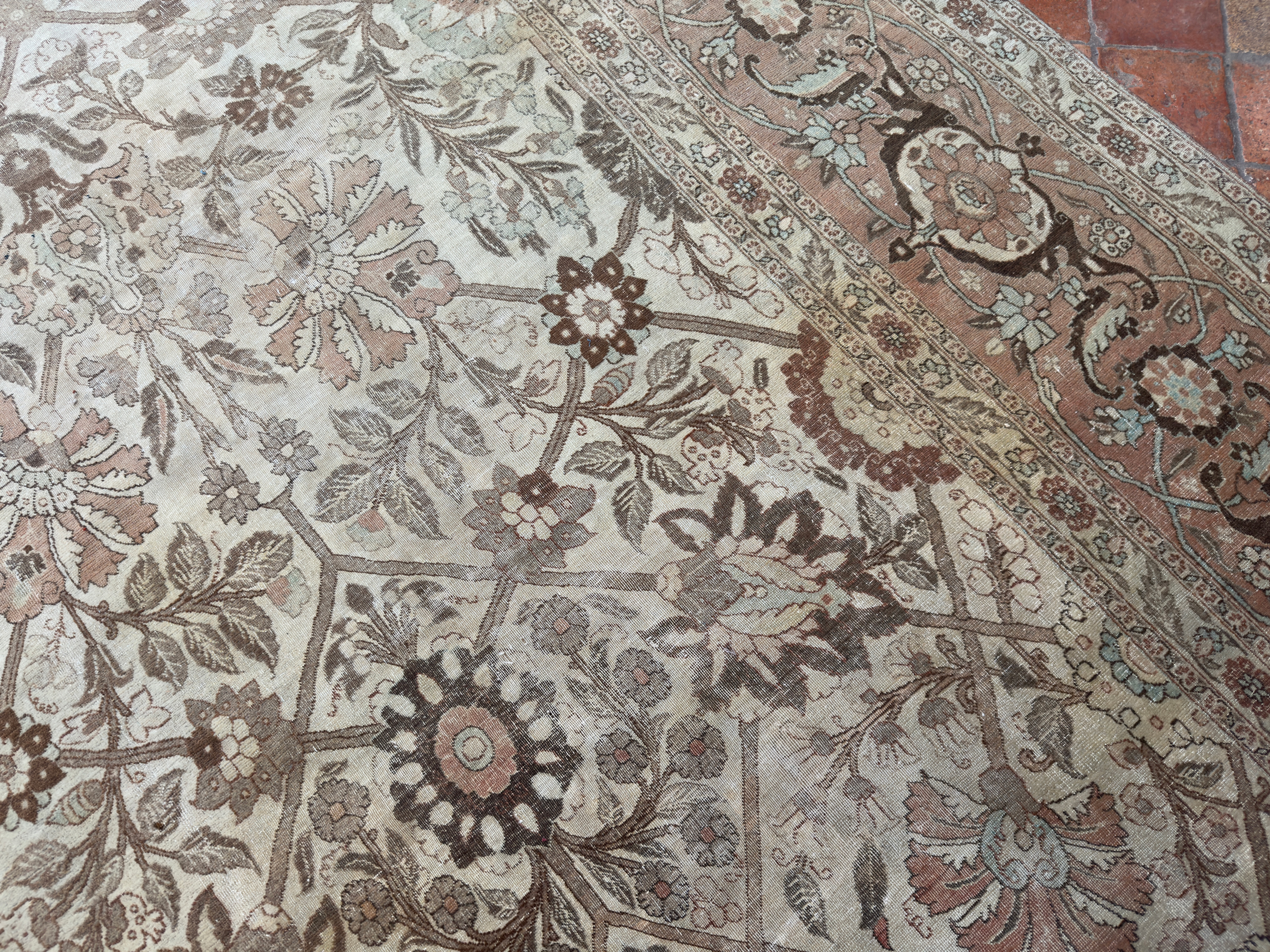 An ancient Tabriz carpet with exquisite faded dyes dating from 1880, this beautiful elegant carpet is around 140 years old. Tabriz of this period would have used the softest of dyes, and muted pinkish, brown tones with a wide variety of dyes which add this immense depth of character to the piece. Some delightful pale blues can be seen in the floral design, connecting vines with a collective of floral patterns and leaves. The large scale flowing border uses a 16th century ‘Herati’ pattern, executed with great precision, the weavers from the city of Tabriz produced some of the finest carpets. This carpet is a rarer design, with no central medallion, allowing it to be placed in a room with ease.