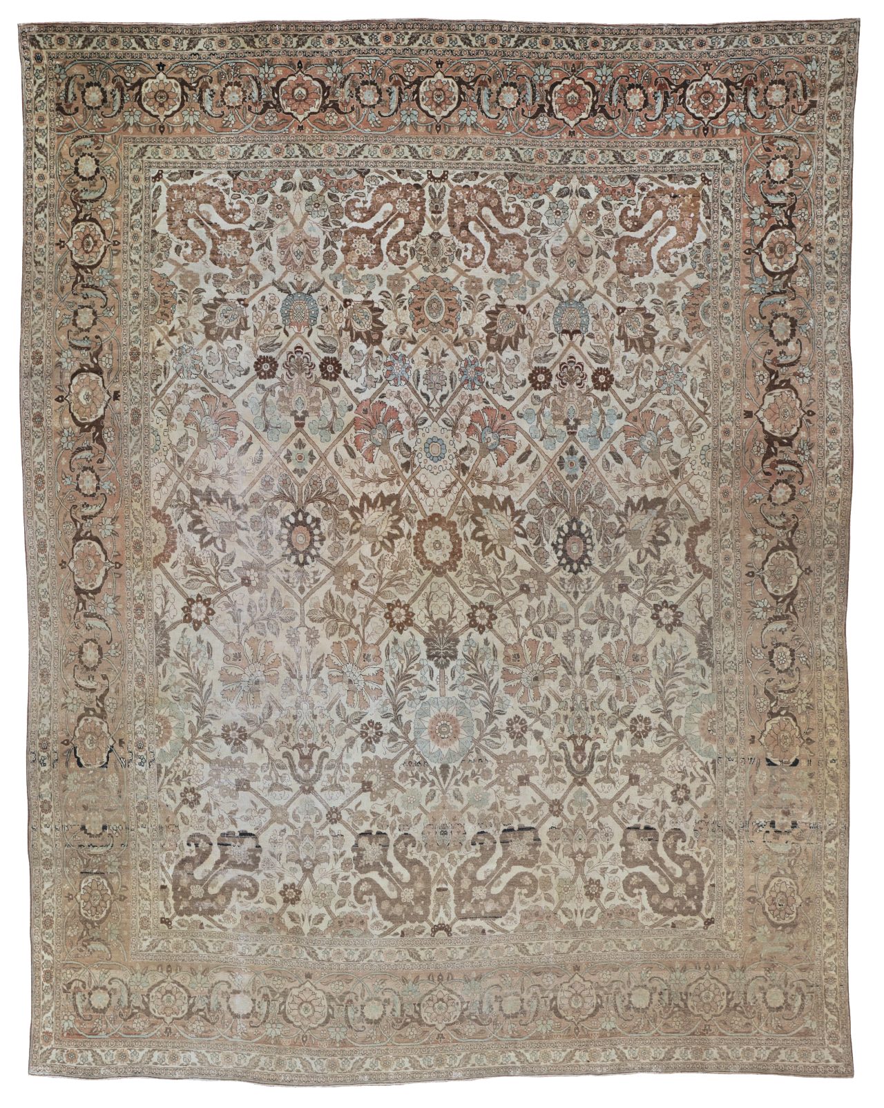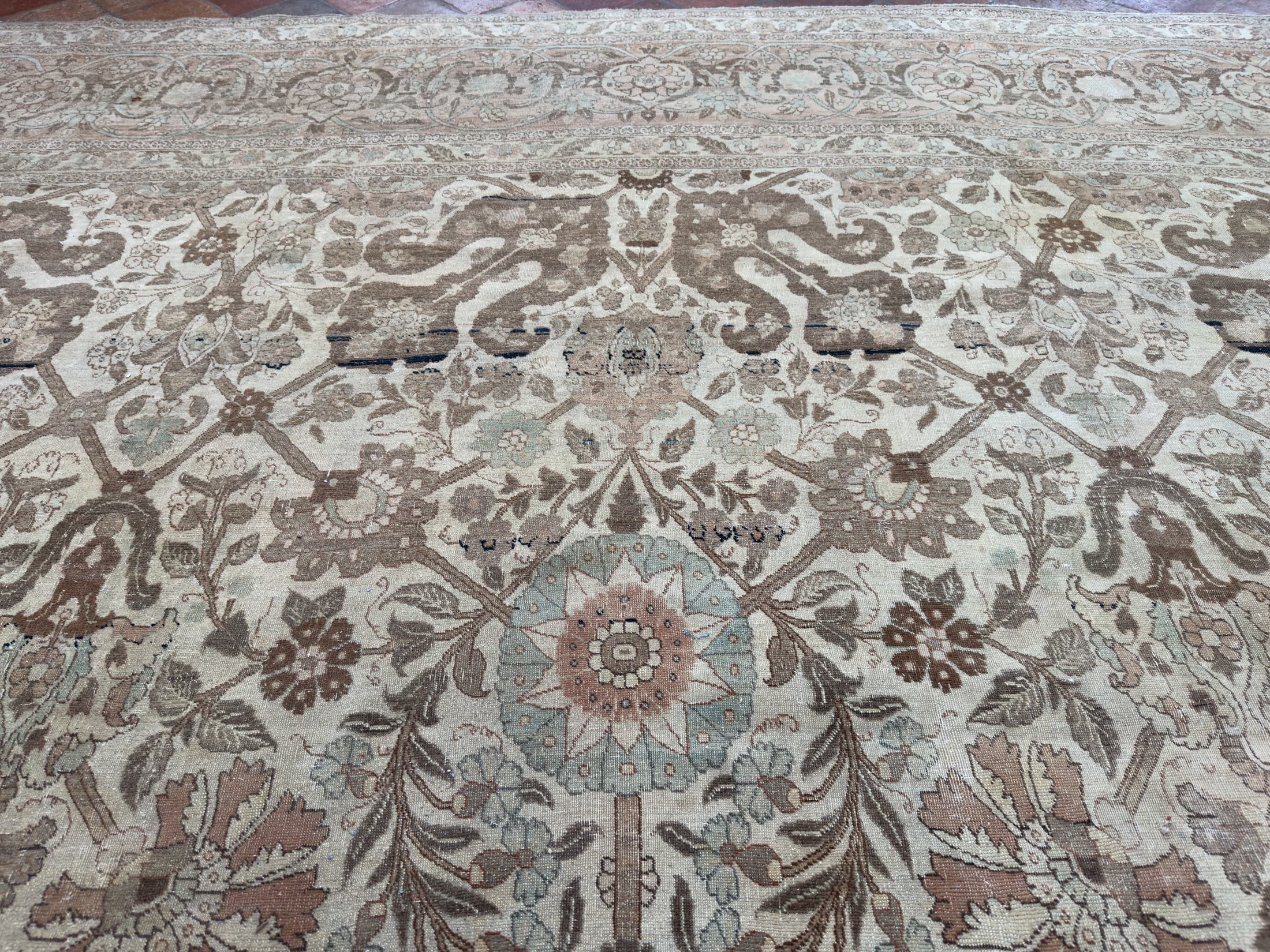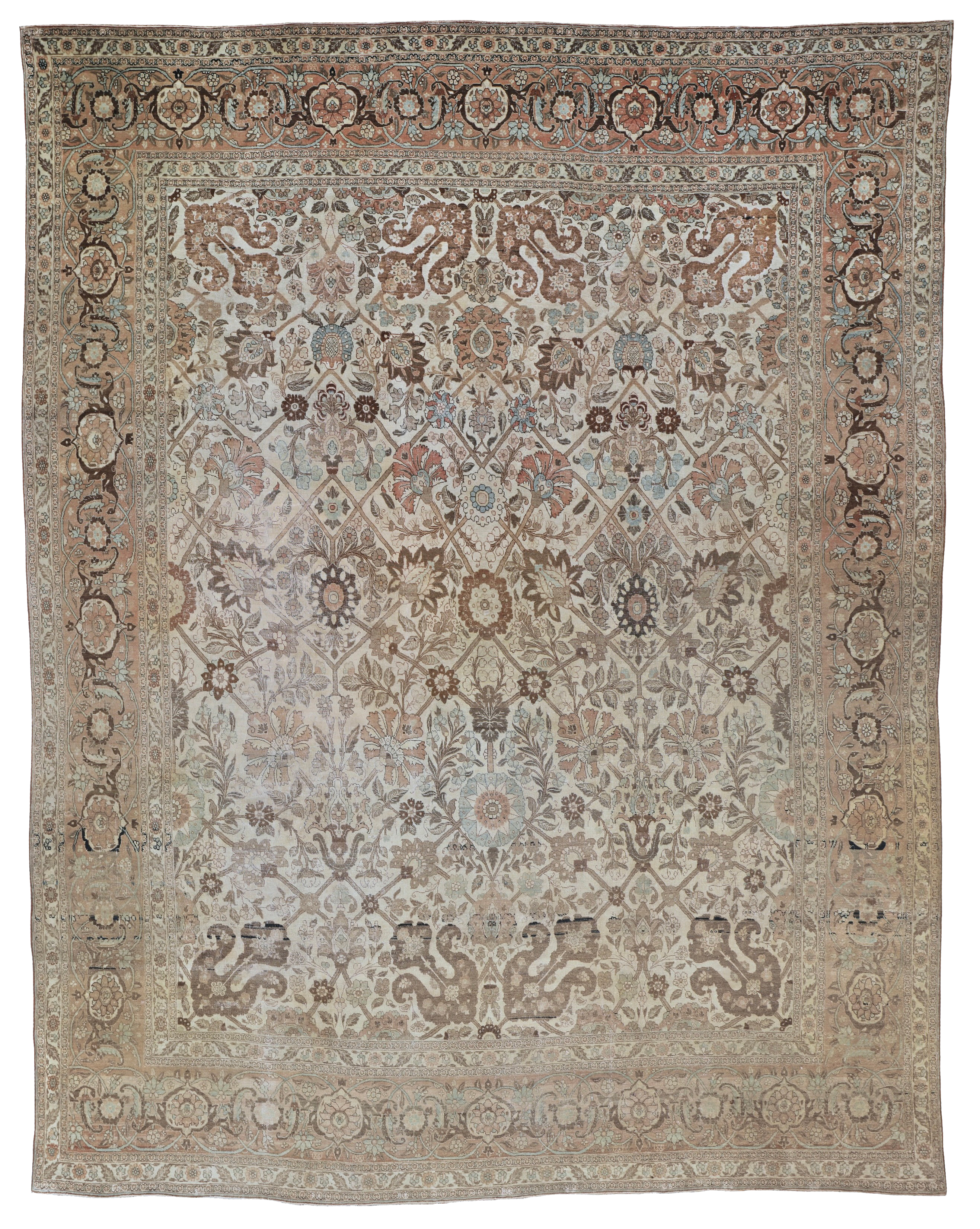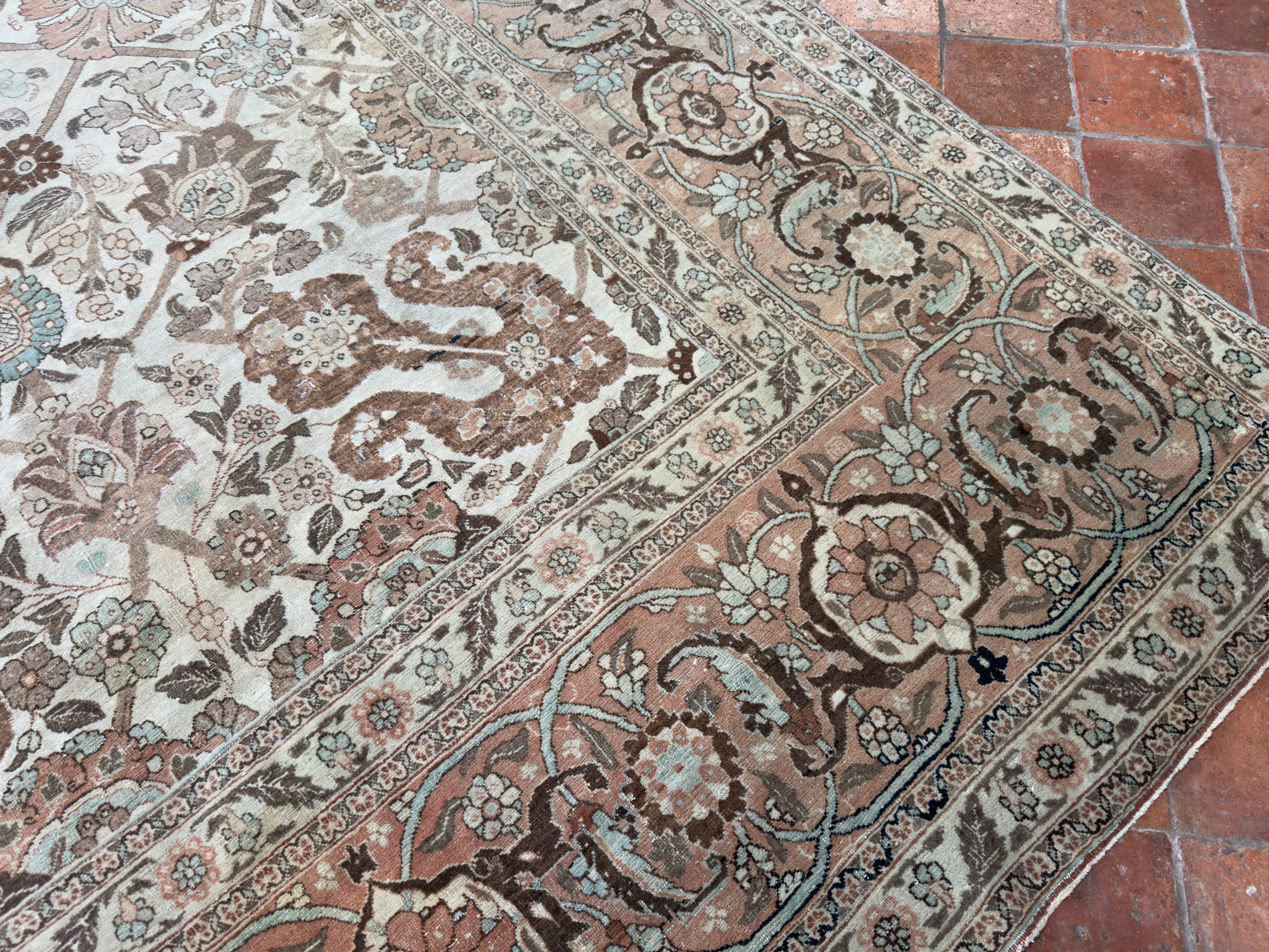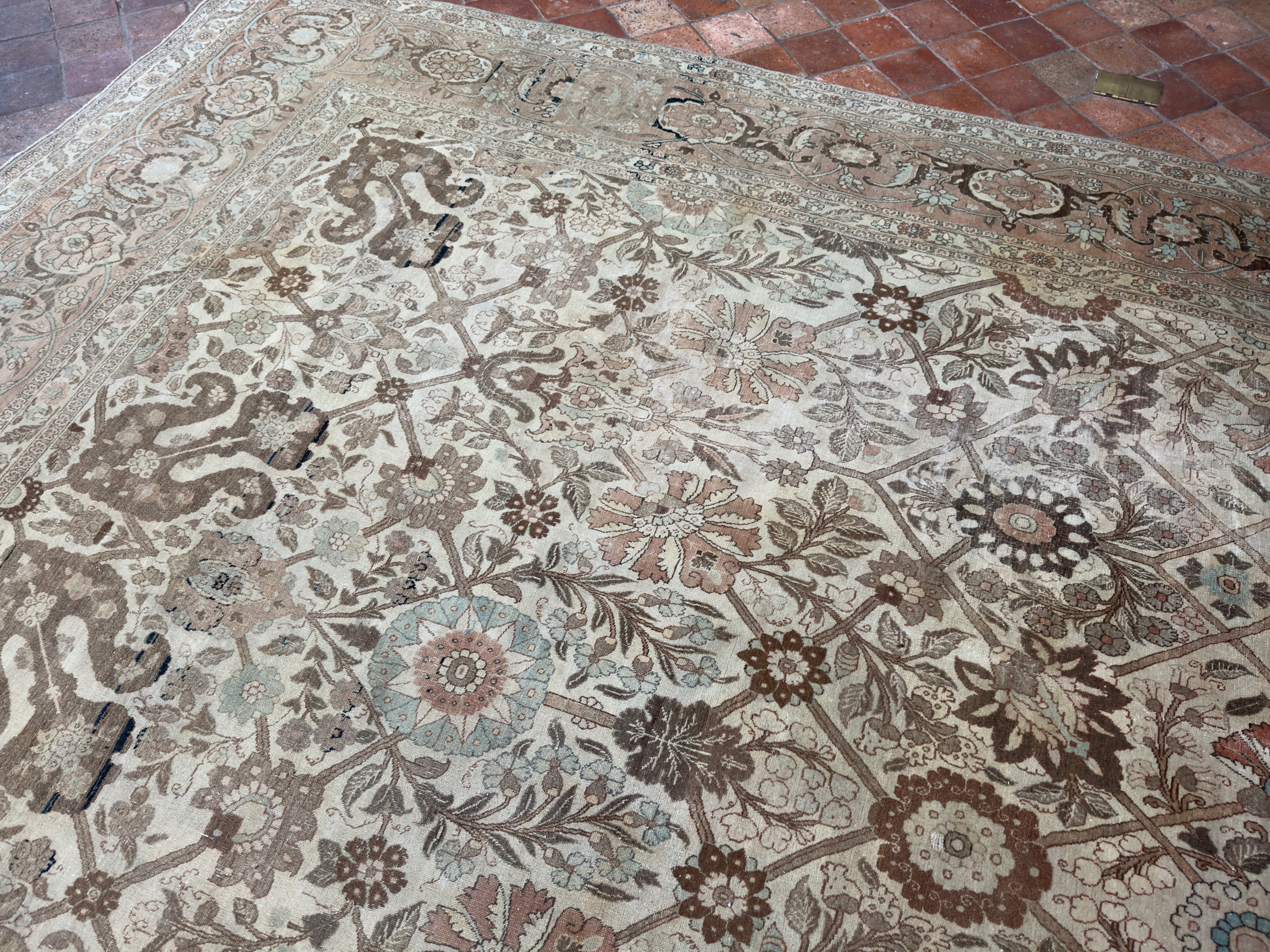 An ancient Tabriz carpet with exquisite faded dyes dating from 1880, this beautiful elegant carpet is around 140 years old. Tabriz of this period would have used the softest of dyes, and muted pinkish, brown tones with a wide variety of dyes which add this immense depth of character to the piece. Some delightful pale blues can be seen in the floral design, connecting vines with a collective of floral patterns and leaves. The large scale flowing border uses a 16th century ‘Herati’ pattern, executed with great precision, the weavers from the city of Tabriz produced some of the finest carpets. This carpet is a rarer design, with no central medallion, allowing it to be placed in a room with ease.