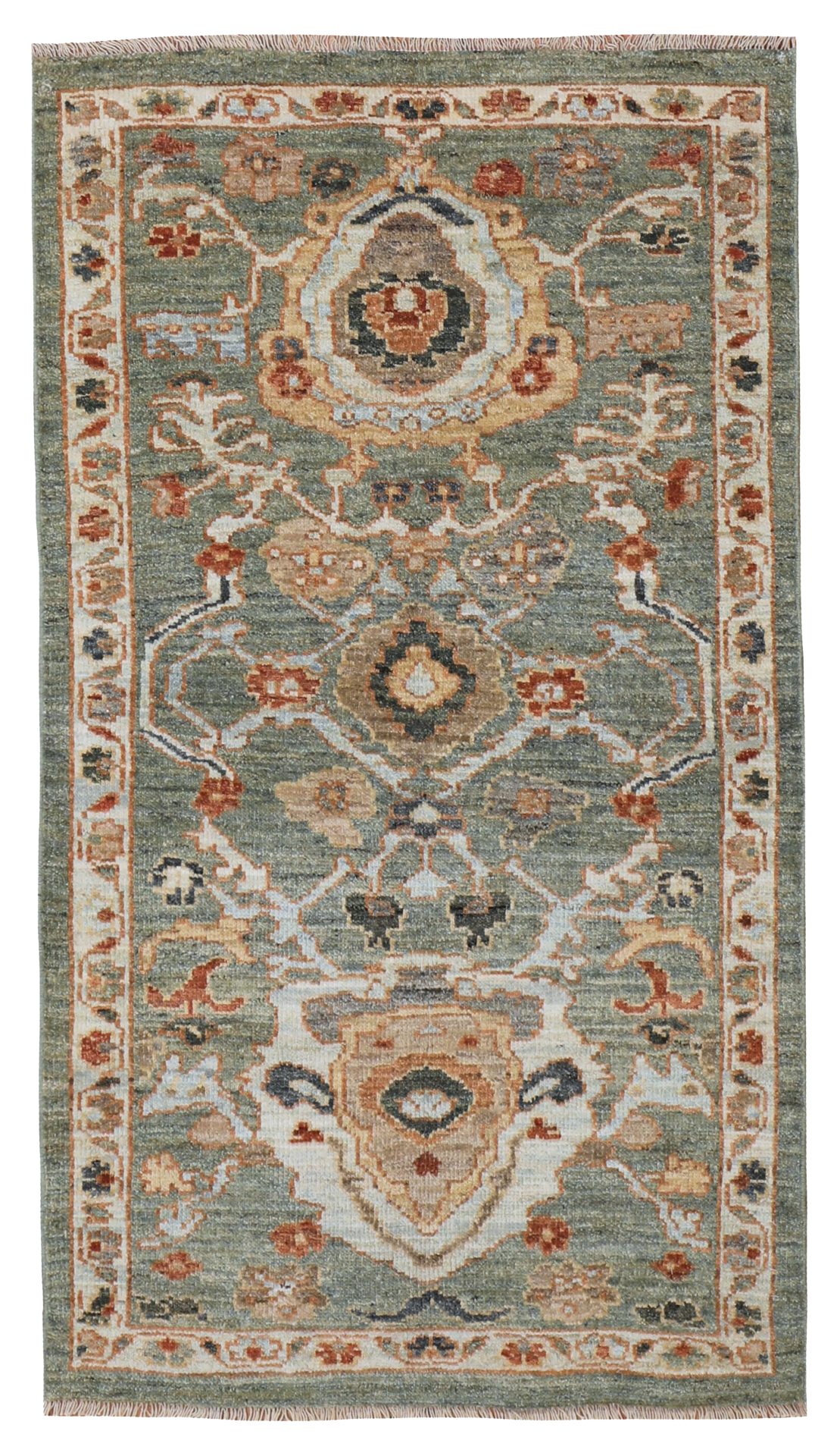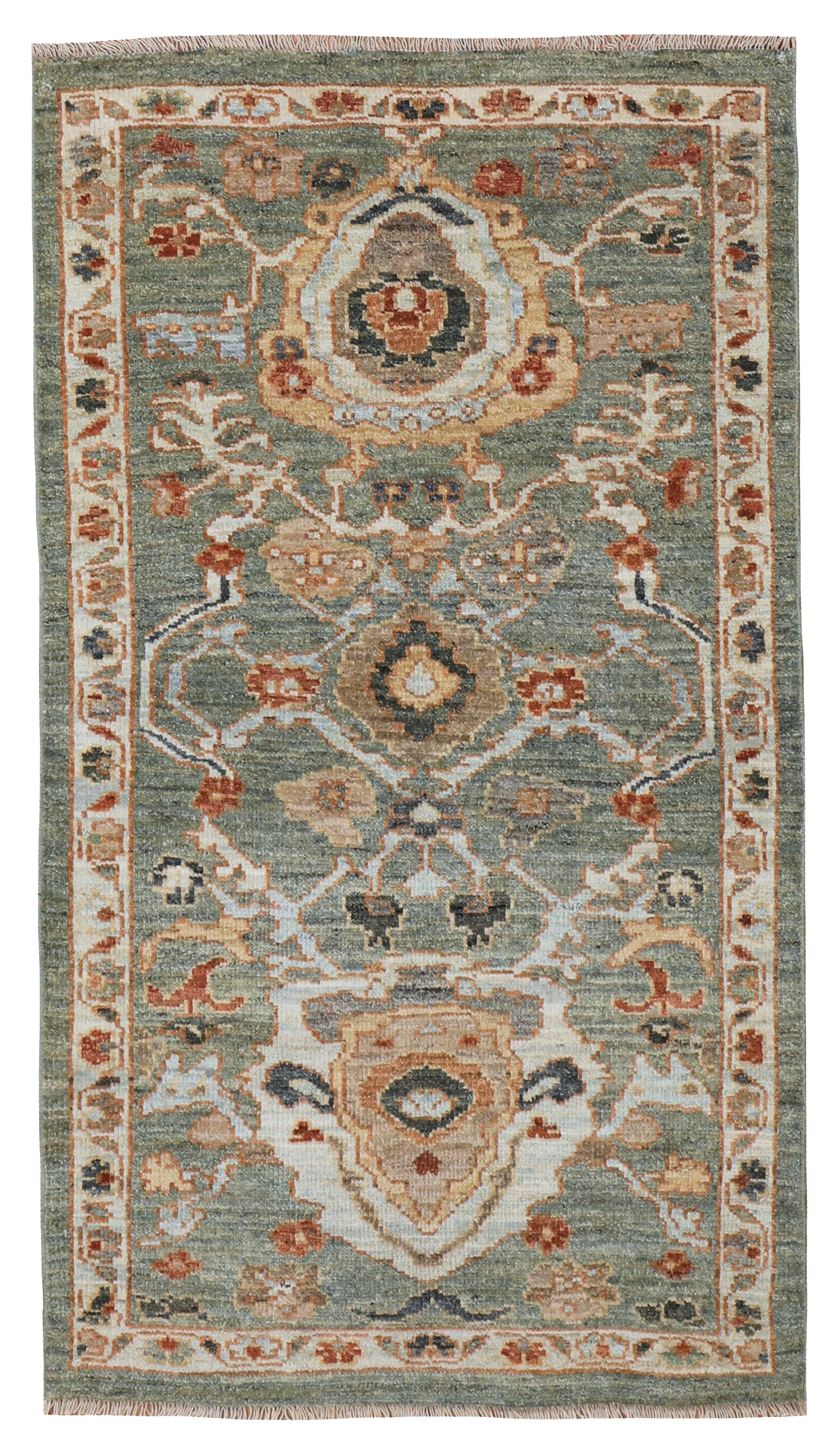 A contemporary Sultanabad rug, woven in rare sage greens and gold hues and subtle red tones to add warmth. All hand-woven with natural dyes and all hand-spun wool. The wonderful small floral palmettes and vine designs we see on this modern rug are from the famous workshop carpets from Sultanabad, and specifically the Ziegler & Co from the late 19th century.