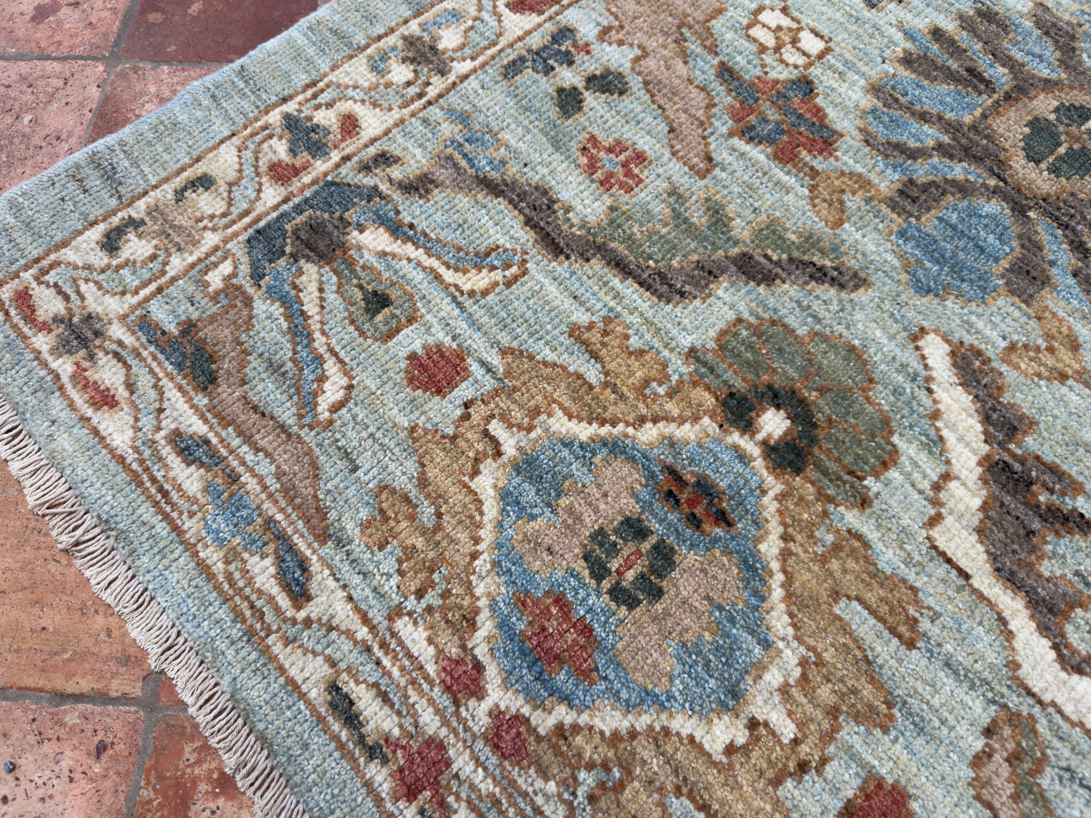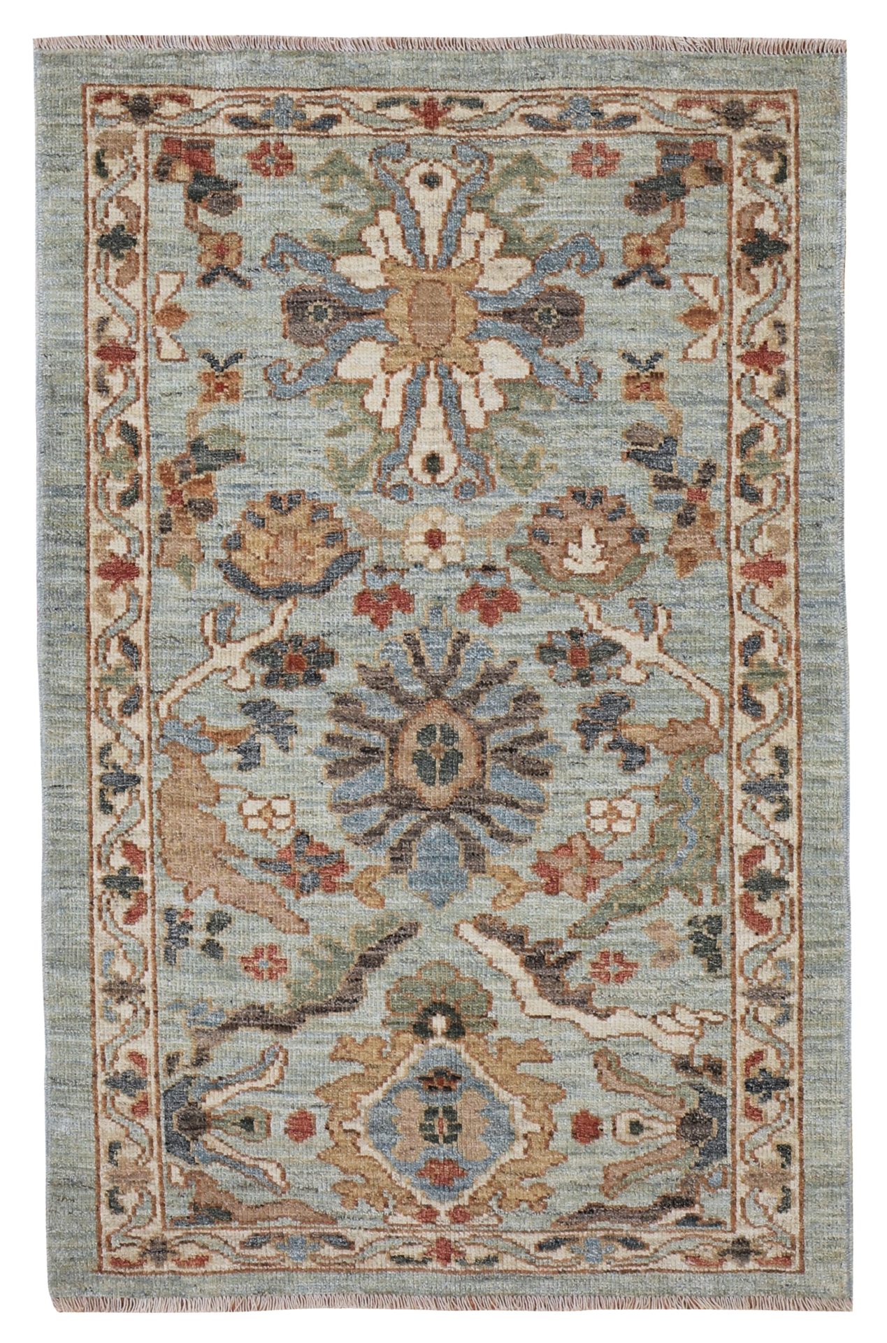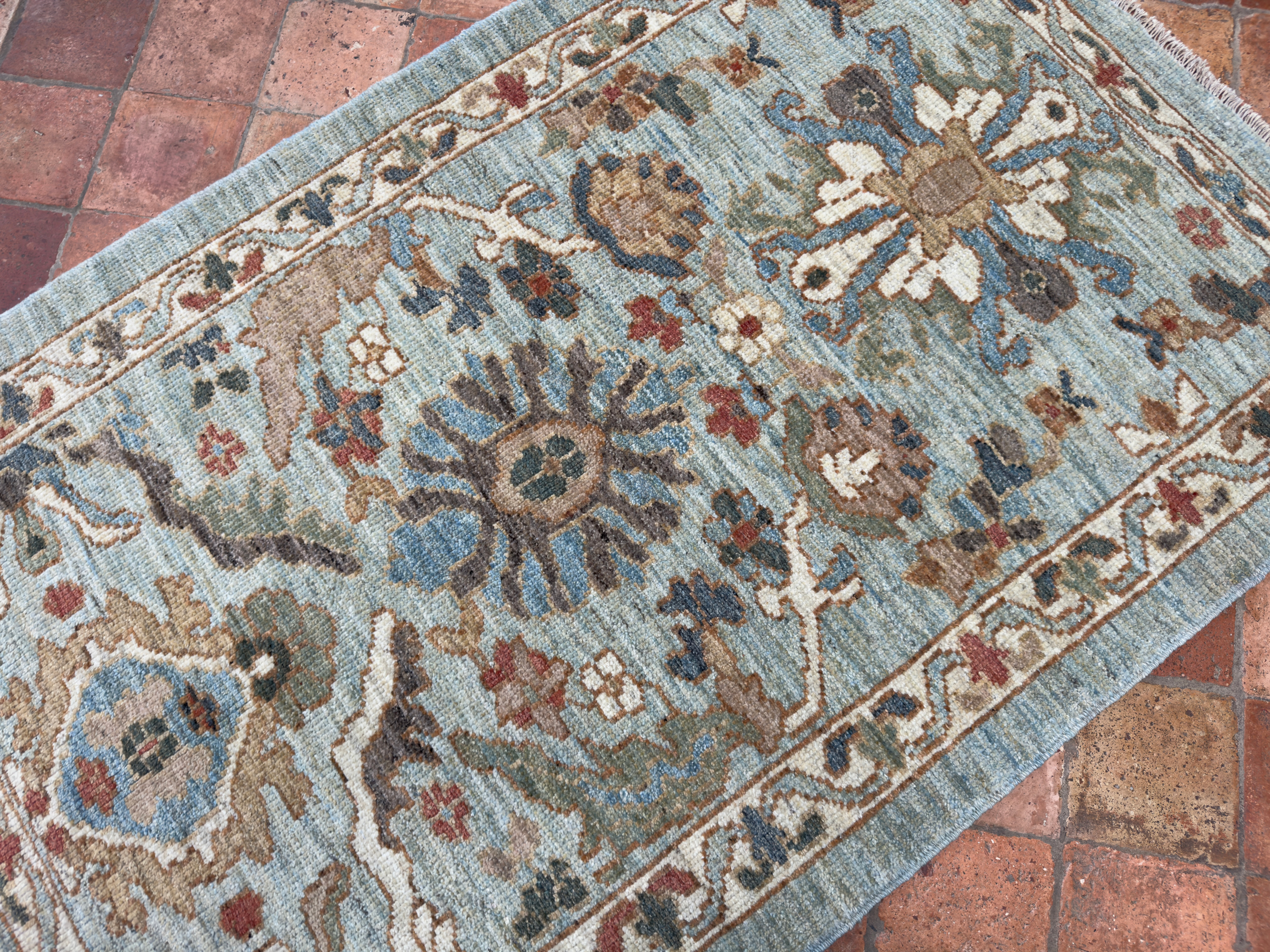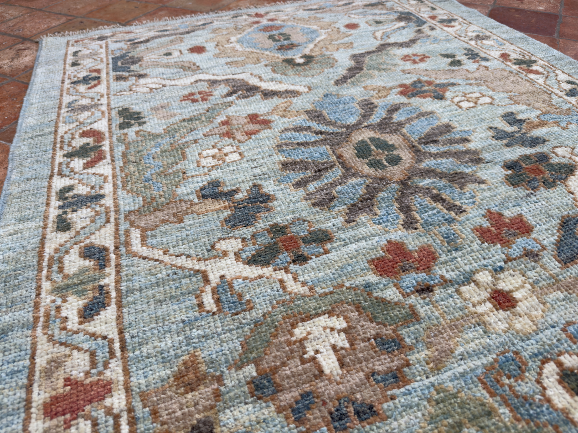 A contemporary Sultanabad rug, a small light border surrounds the pale blue toned background, using rustic orange tones, sage greens and gold hues and aubergine tones to add warmth. All hand-woven with natural dyes and all hand-spun wool. The wonderful small floral palmettes and vine designs we see on this modern rug are from the famous workshop carpets from Sultanabad, and specifically the Ziegler & Co from the late 19th century.