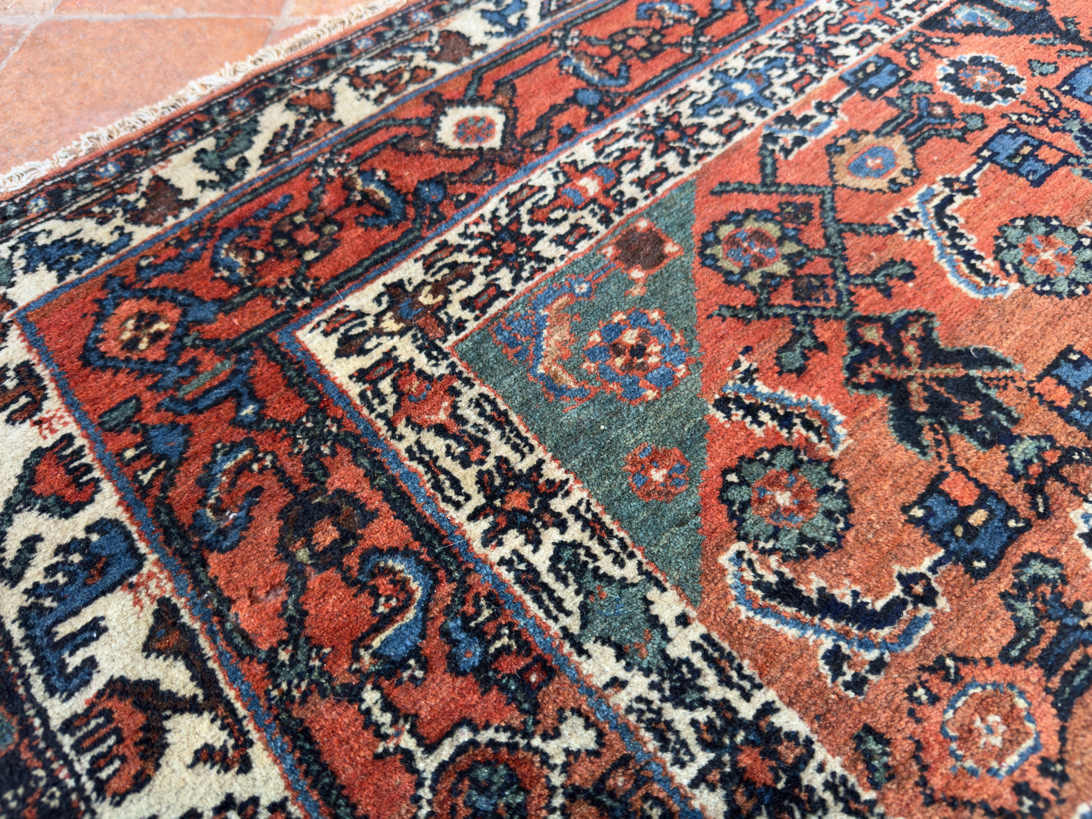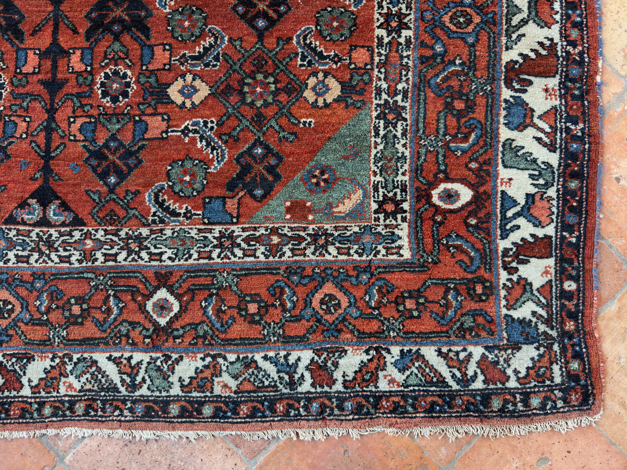 A beautiful Malayer rug that is very fine and full of wonderful detail and rare green dyes. Woven over 130 years ago the rugs condition is truly fantastic! A soft wool pile all over and with warm terracotta, brick tones, the deep blues and soft greens are excellent too. The minor borders woven with off-white natural un-dyed wool lift the rugs palette too, a well drawn design and full of character.