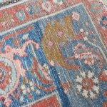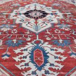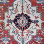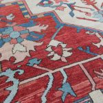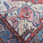 Antique Serapi carpets are more intricate finer tribal weavings of the Heriz region hand-woven by Azerbaijan Turkish inhabitants close to the city of Heriz in North-West Persia. They are famous among collectors because of their vivid vegetable dyes or soft earth tones that are woven on a geometric pattern. In terms of design, drawing, and coloration as well, Serapi carpets are clearly part of one and the same tradition as Heriz, despite being a distinct antique rug style, which originated as a Northwest Persian adaptation of early Sarouk Farahan medallion, but with a more geometric, abstract, village sensibility.