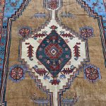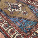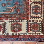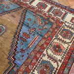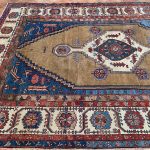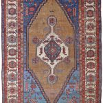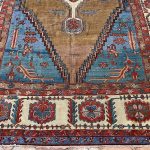 Bakshaish rugs may utilise medallion or all over designs descended from classical antique rugs, but they translate such models into a much more abstract and expressive idiom reminiscent of Caucasian village rugs like Kazak’s. Sometimes, like village pieces, they make use of scattered space-fillers; alternatively they may apply a principle of open space to allow the effects of the drawing to stand out graphically.