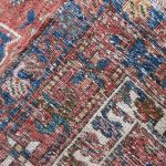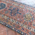 A rich coloured rustic and geometric antique Heriz runner with great terracottas, blues and green natural dyes. The eight pointed star design down the centre are well spaced out and the border colour is not your typical dark blue but a lighter shade of terracotta making it a lighter piece for a hall. The design is quite contemporary in certain ways and could work in both traditional and contemporary settings. There is some lovely ‘abrash’ which is the term for dye change in the some of the repeating medallions, where the green dyes change from lighter to darker. This antique runner is in very good condition with a thick durable wool pile and no losses to the fringes, the sides are original in parts and have been tidied up in places. A lovely antique runner ideal to brighten up the floor in a corridor or entrance hall.