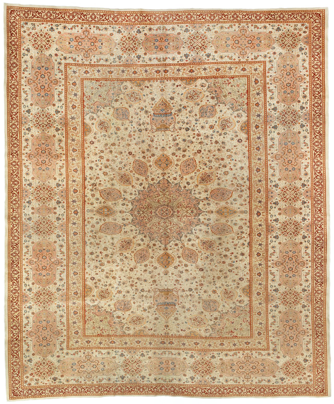 Sivas carpets were often commissioned for the West, using elegant curvilinear designs from Persian rugs and intricate floral motifs combined with wide borders with repeating cartouche designs. This design has been seen in Ardebil carpets, which is the design on this Sivas carpet. These soft carpets have a lot of decorative appeal and are ideal to furnish around.