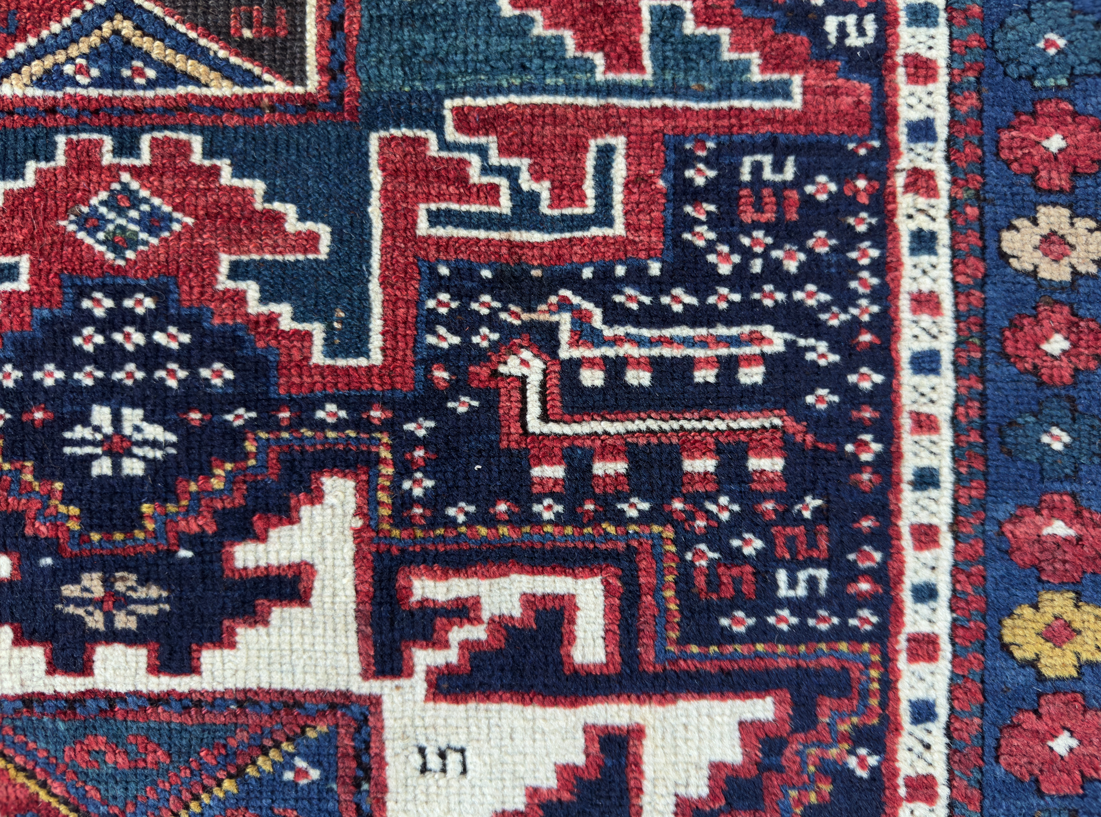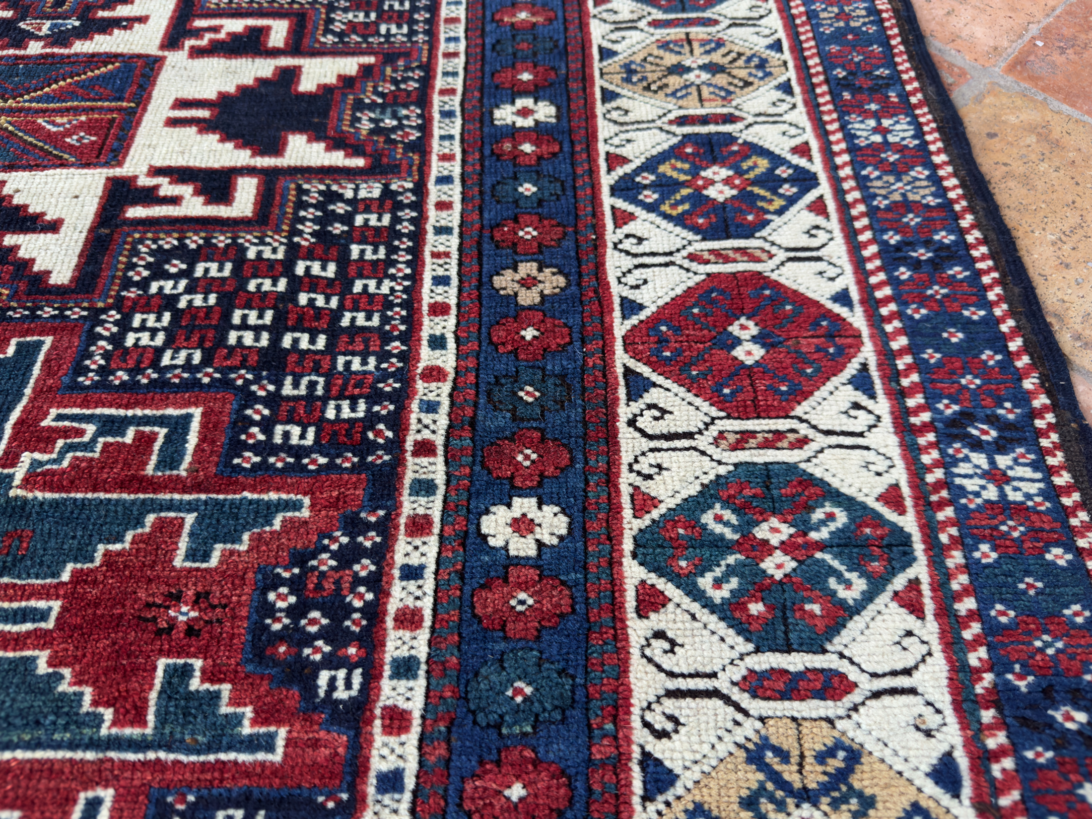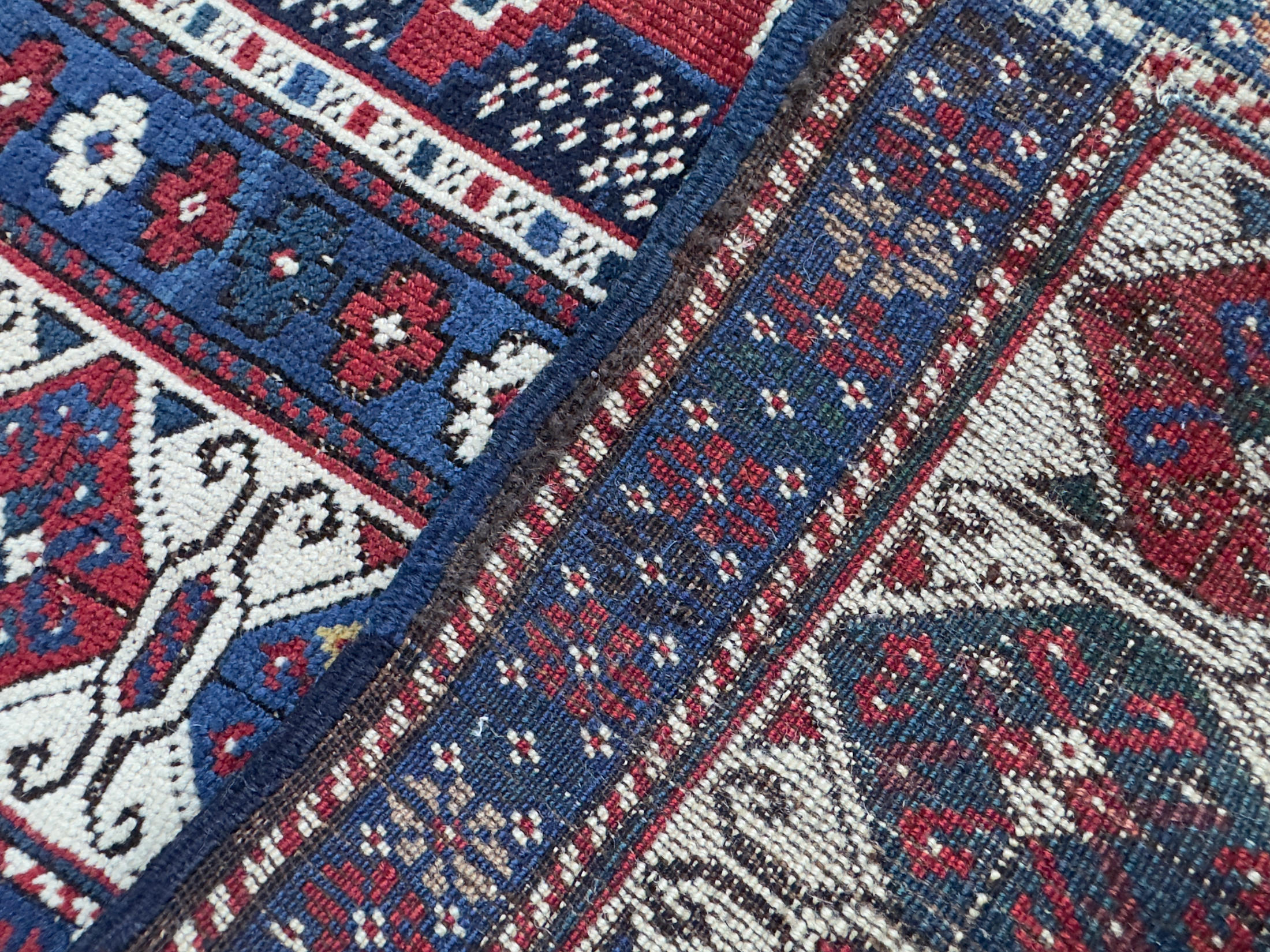 Kuba is a rug producing town located in the north-east of the Caucaus next to the Caspian Sea. The port of Baku in Kuba had its own school for carpet-making. An amazing Caucasian rug with great design history and a fantastic array of colours, the indigo is vibrant and the ivory white border gives this rug a lot of life. A real collectors piece in lovely condition, minimal wear and corrosion to the black dyes.