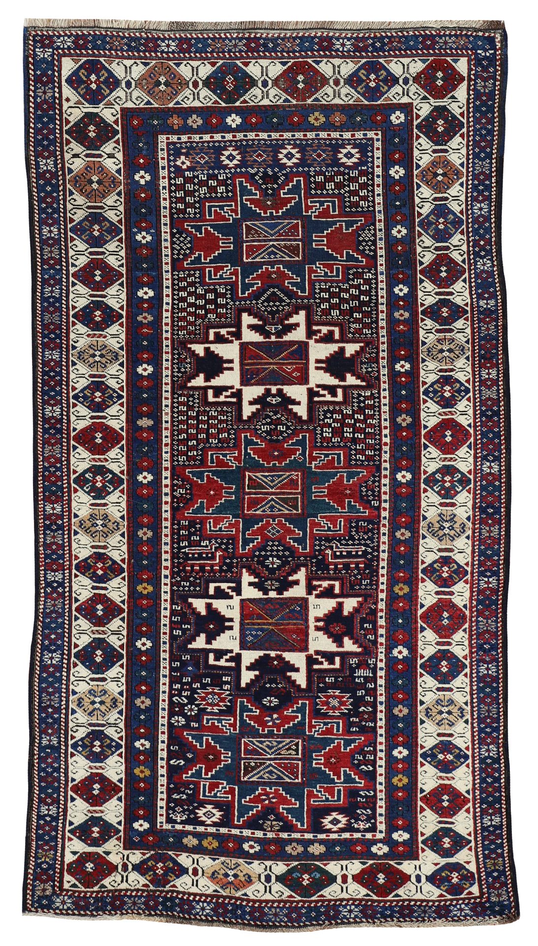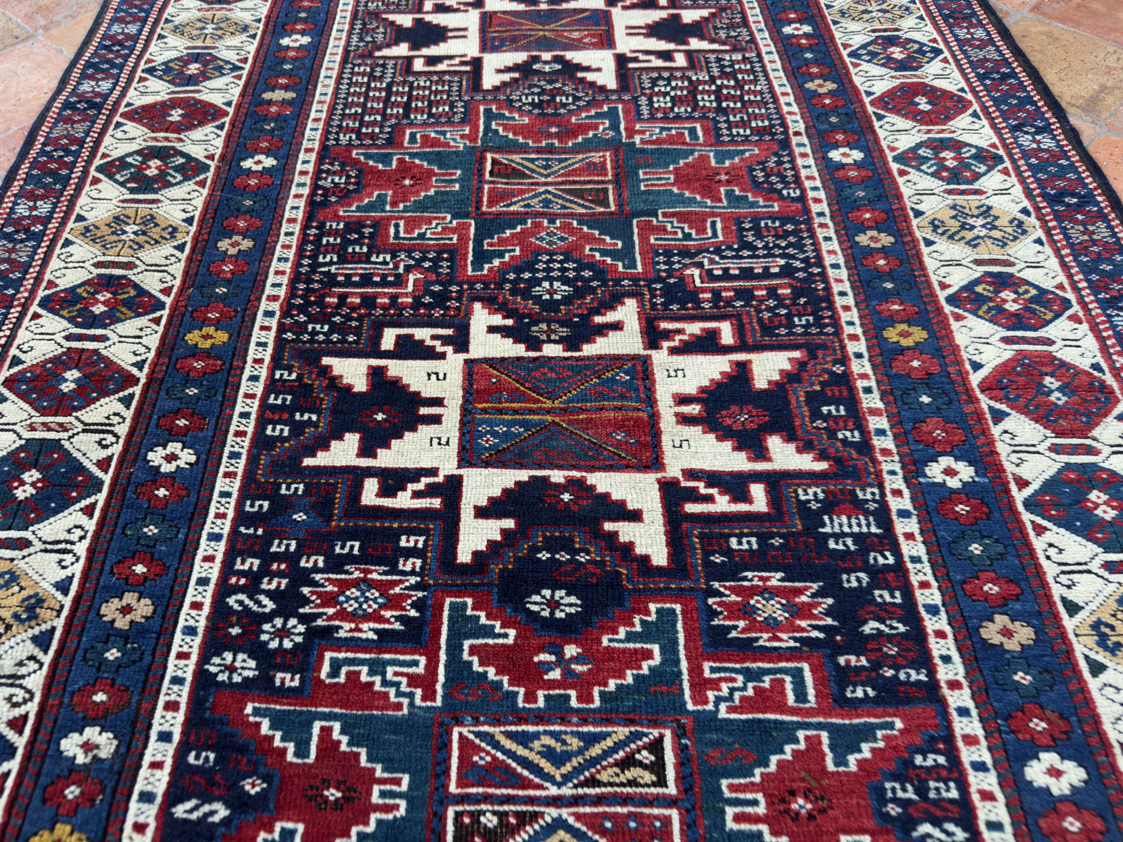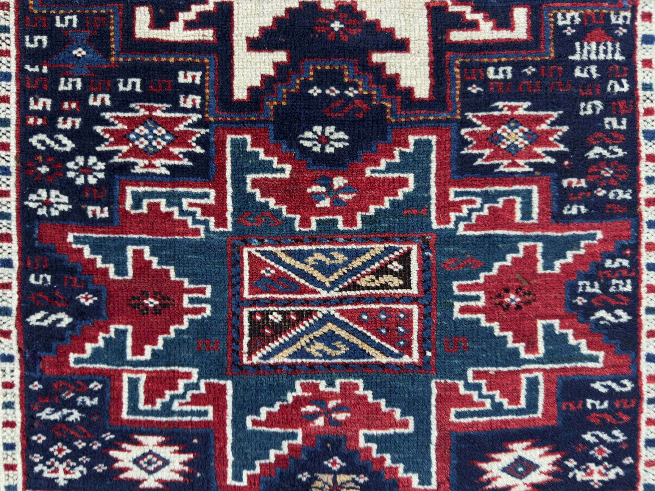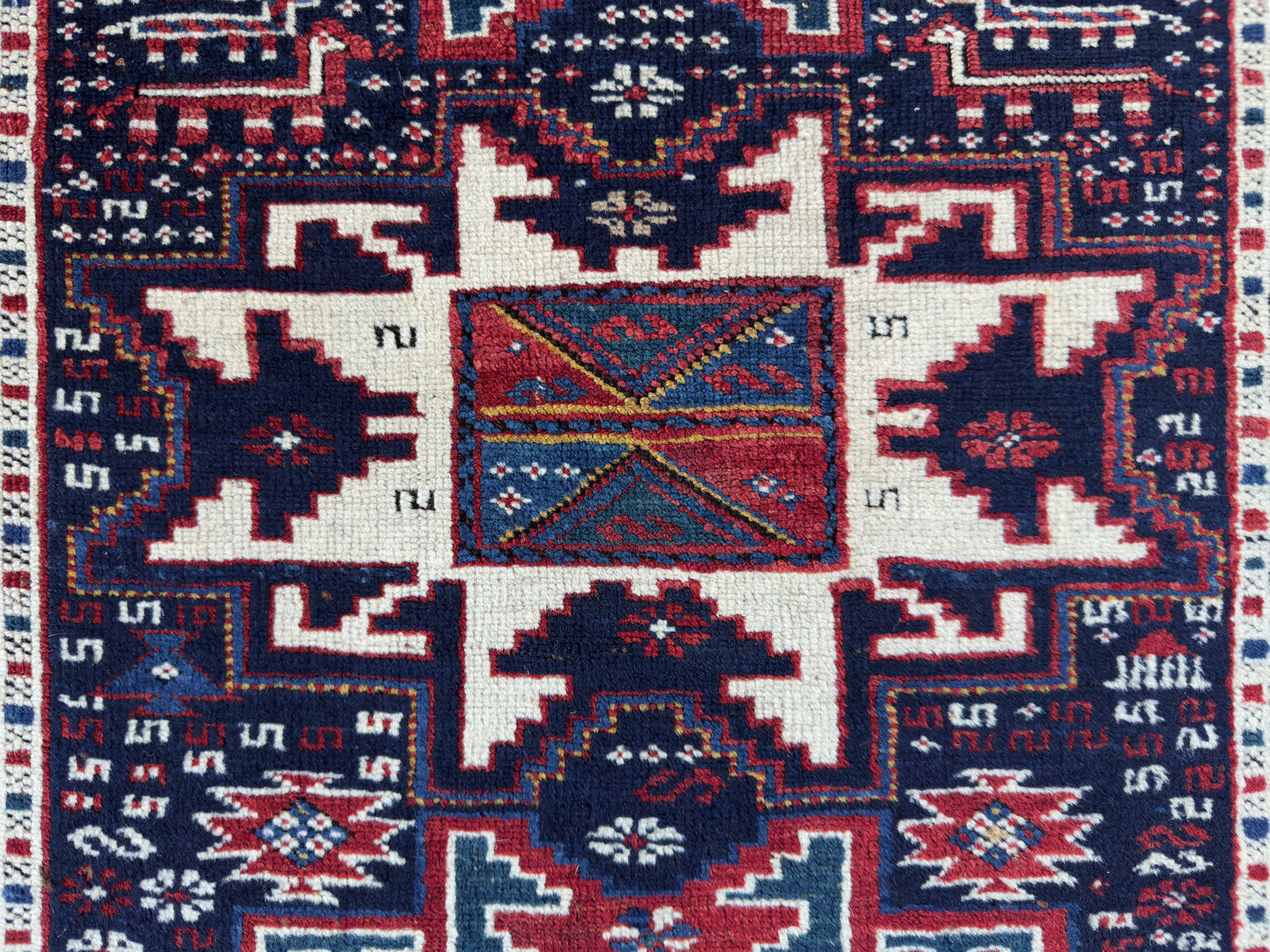 Kuba is a rug producing town located in the north-east of the Caucaus next to the Caspian Sea. The port of Baku in Kuba had its own school for carpet-making. An amazing Caucasian rug with great design history and a fantastic array of colours, the indigo is vibrant and the ivory white border gives this rug a lot of life. A real collectors piece in lovely condition, minimal wear and corrosion to the black dyes.