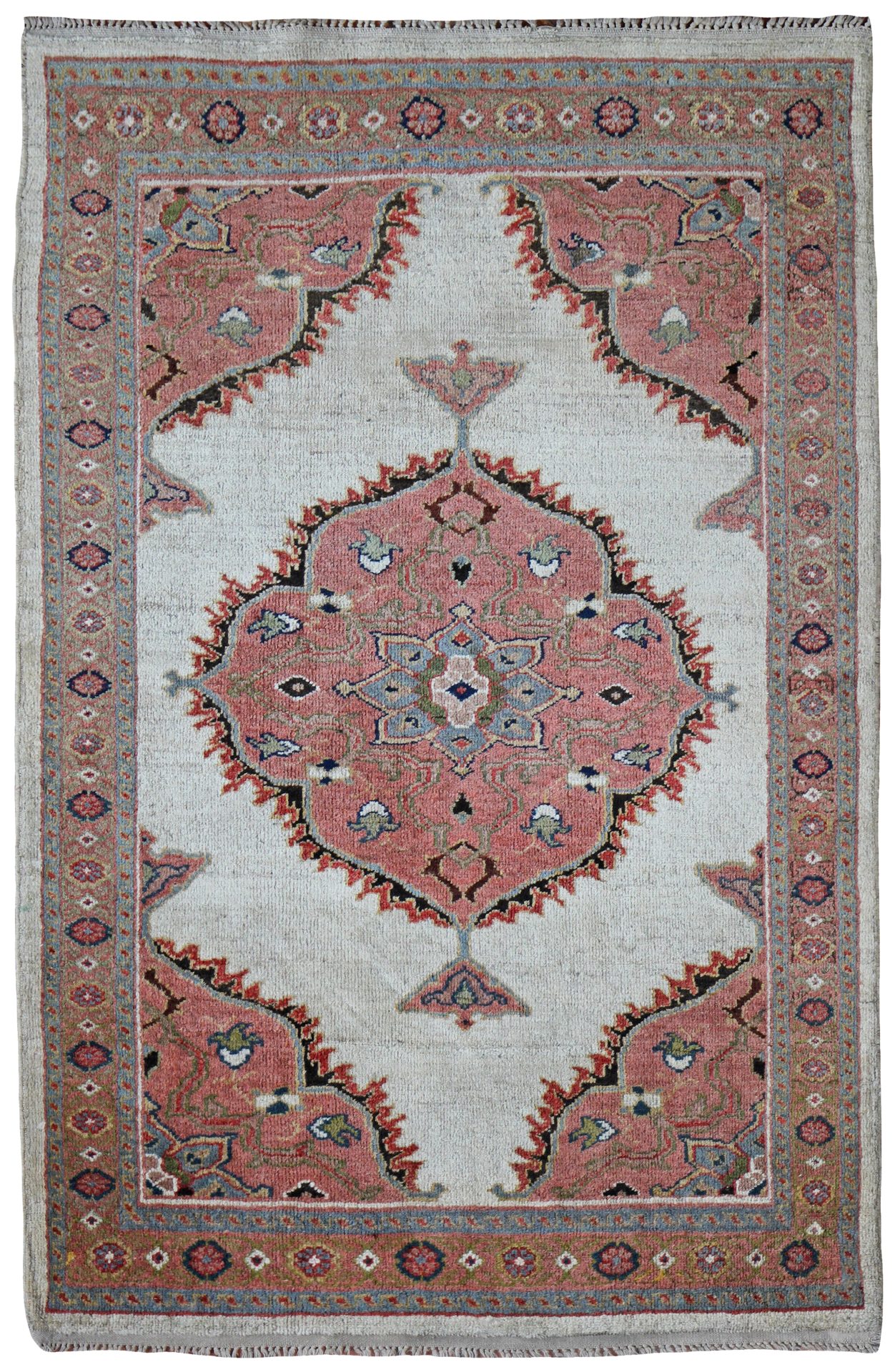 A rare ivory Antique Ziegler rug in a rare small size, as most Ziegler & Co workshop carpets were produced in large sizes for drawing rooms. In excellent condition with a high wool pile throughout, it has beautiful soft colours, gentle pinks, teal blue greys. It is very rare to find such a small rug from the Ziegler workshop as generally they made larger carpets.